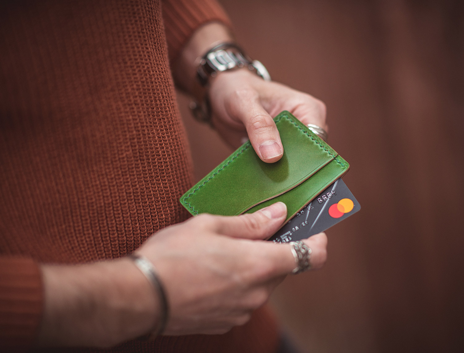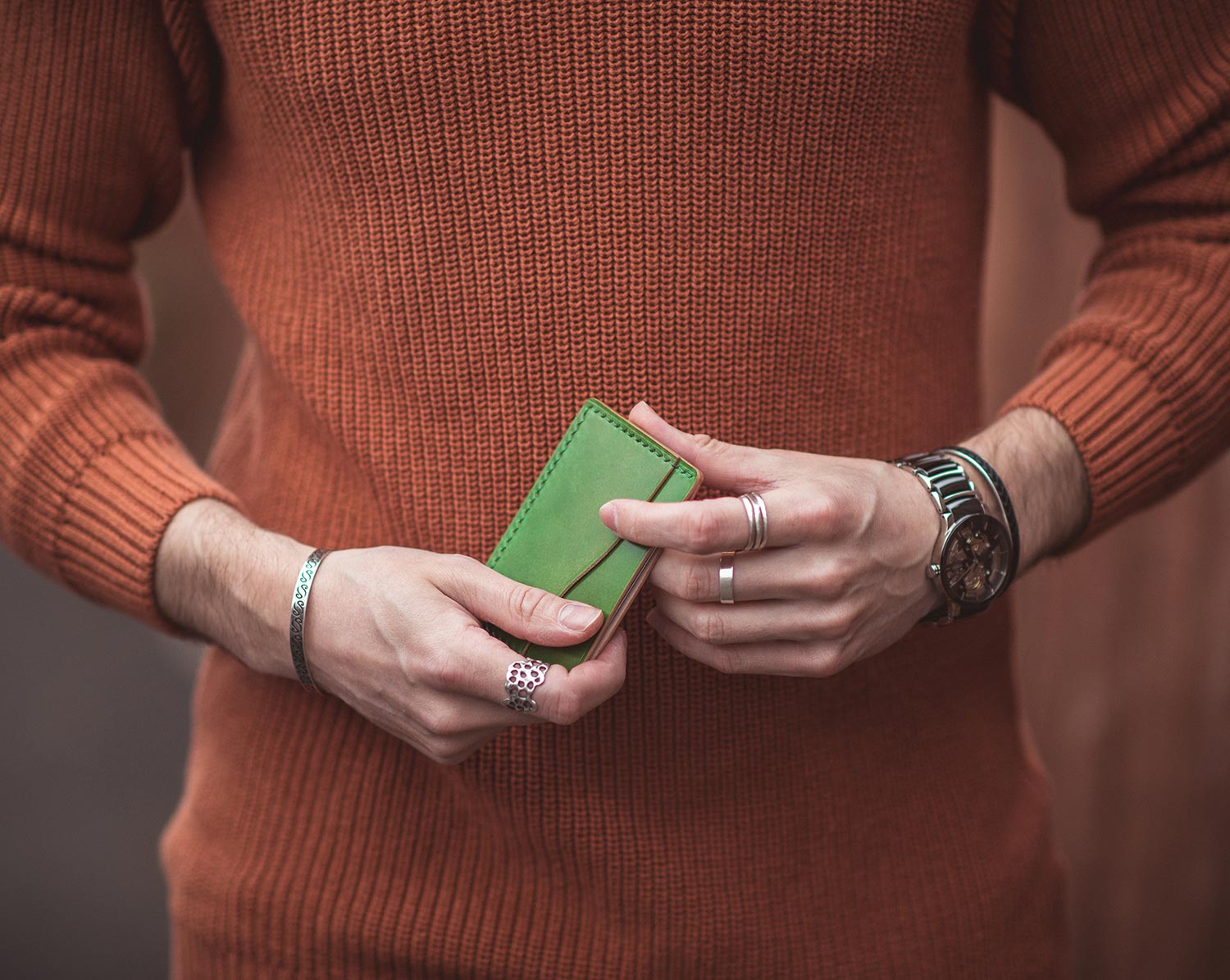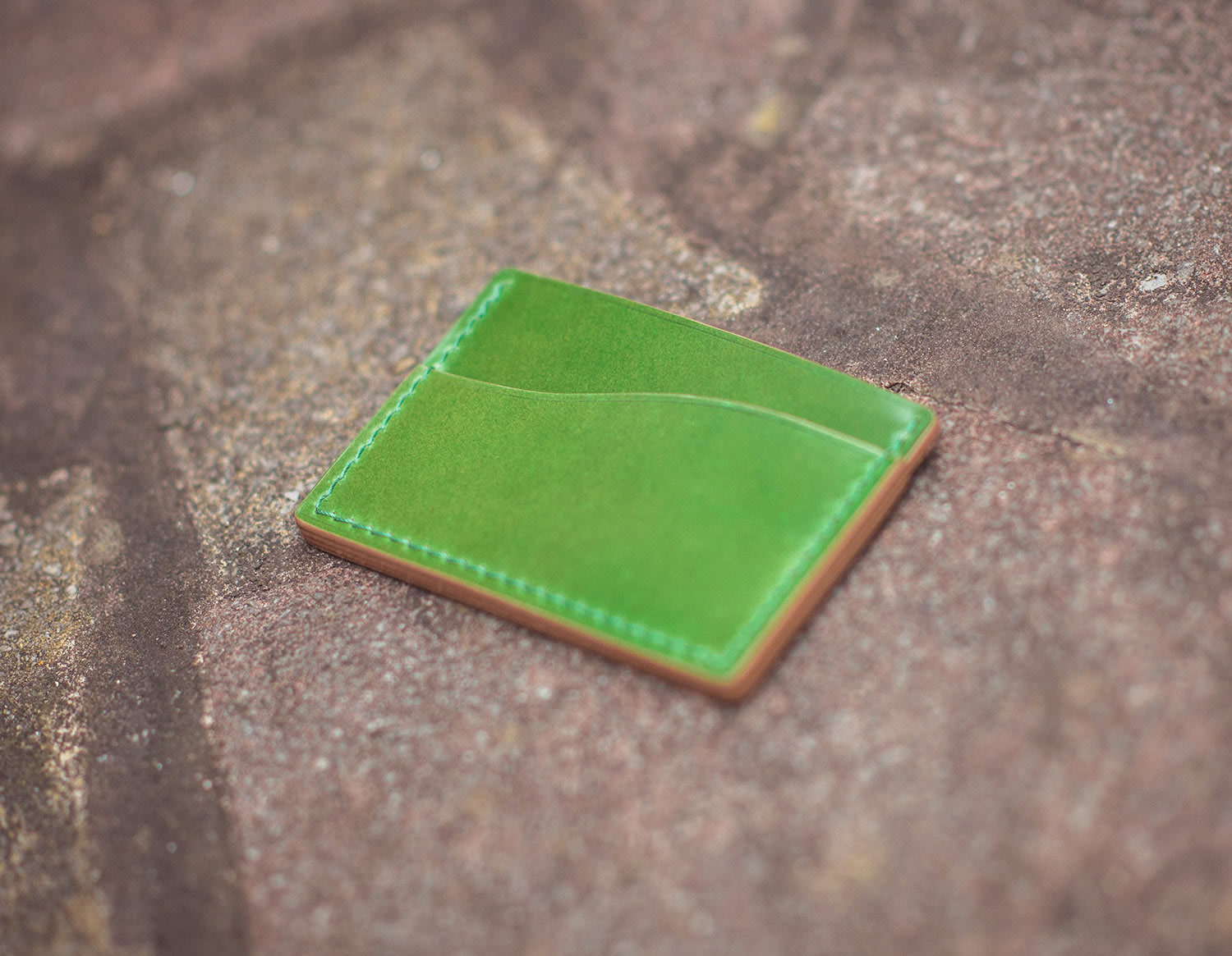 The slim cardholder is bathed in a gorgeous green, instantly standing out as soon as you unveil it. The leather accessory features two external pockets along with the main centre pocket. The cardholder is entirely handmade; the edges are finished using a 26 stage process, ensuring nothing less than a top-quality product.