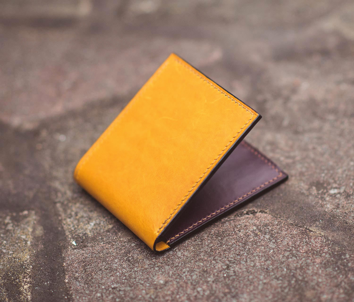 The bifold wallet features 8 card slots and a full-sized notes compartment and divider. The fabric is luxurious Buttero leather, imported from the Conceria Walpier Tannery in Italy, which has been coloured using a pure vegetable tan for a consistent finish. The pocket lining uses ripstop nylon, and the wallet features a linen thread throughout for an elegant finish. The outer section of the wallet is a gorgeous light, almost orange/yellow-tan that beautifully complements the deep navy interior.