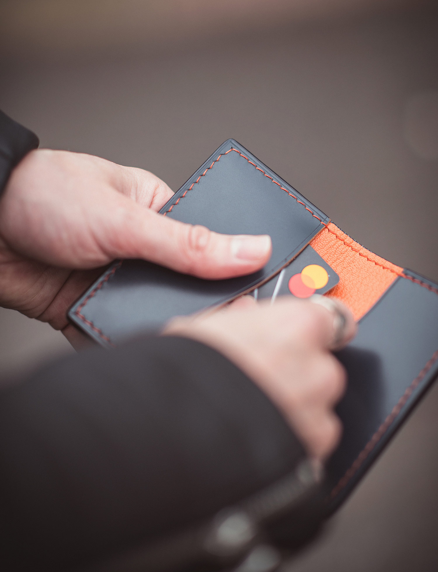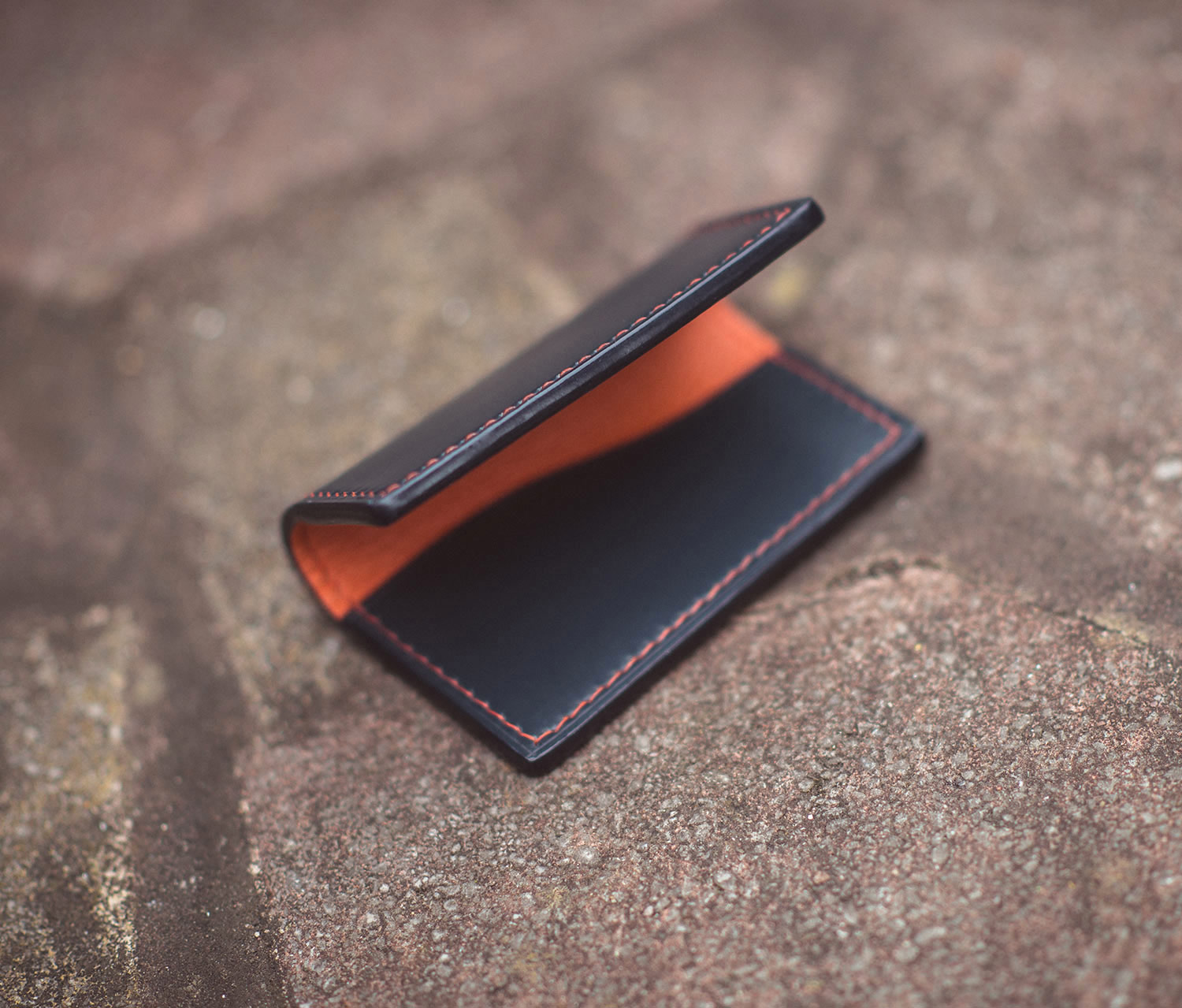 The second cardholder in this feature boasts an effective yet simple design, coloured in deep navy blue on the outside, yet a flamboyant orange hue is used inside for a popping effect. The cardholder is finished using a hand-painted process for a glossy finish.