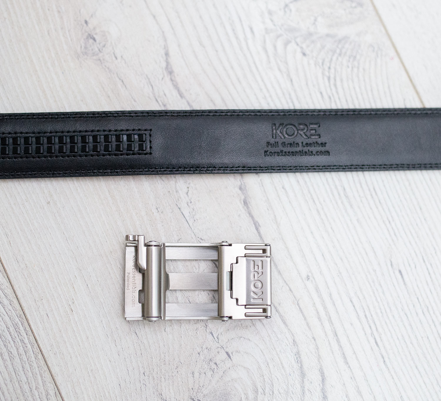 The belt is constructed using full-grain leather for that quality look and feel (even the smell of the leather oozes high quality). The buckle is fashioned out of stainless steel, finished with a brushed effect (a touch often missing from many men’s accessories). Kore offers alternative materials for their buckles including classic alloy, titanium and the stainless steel reviewed here.
