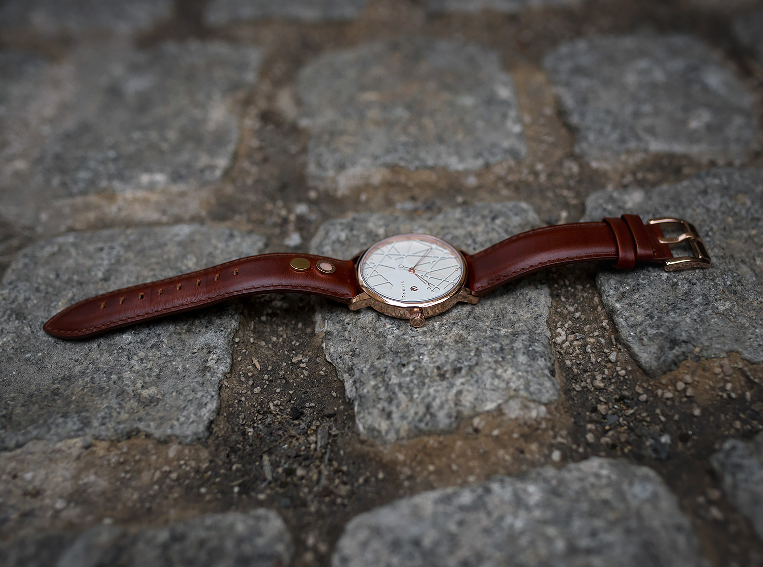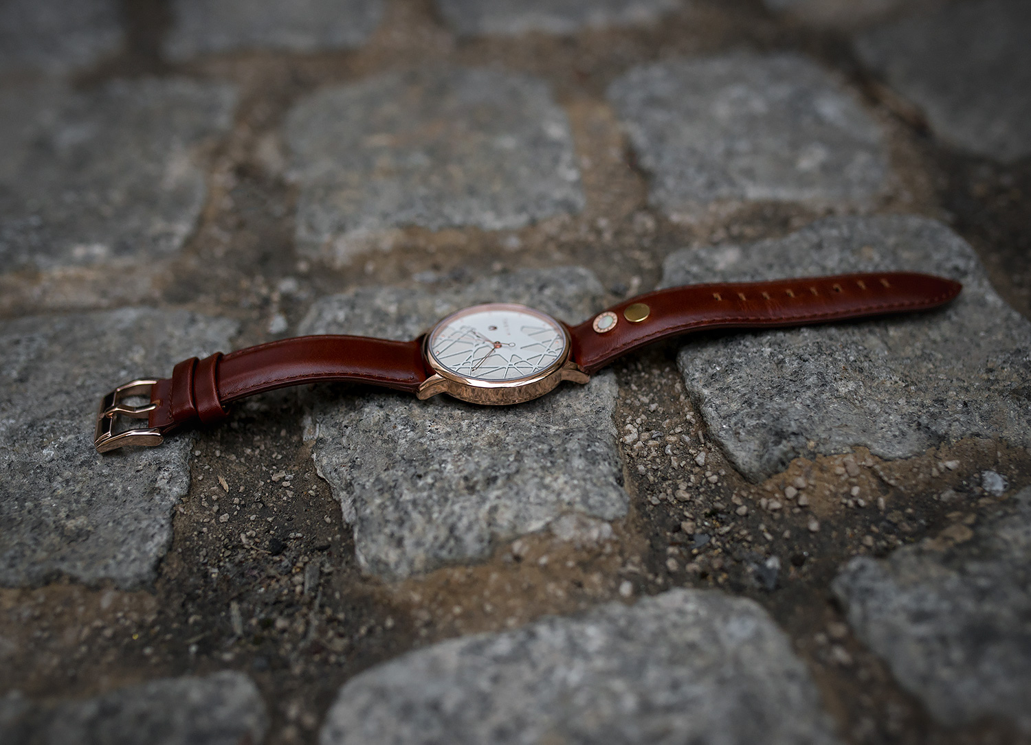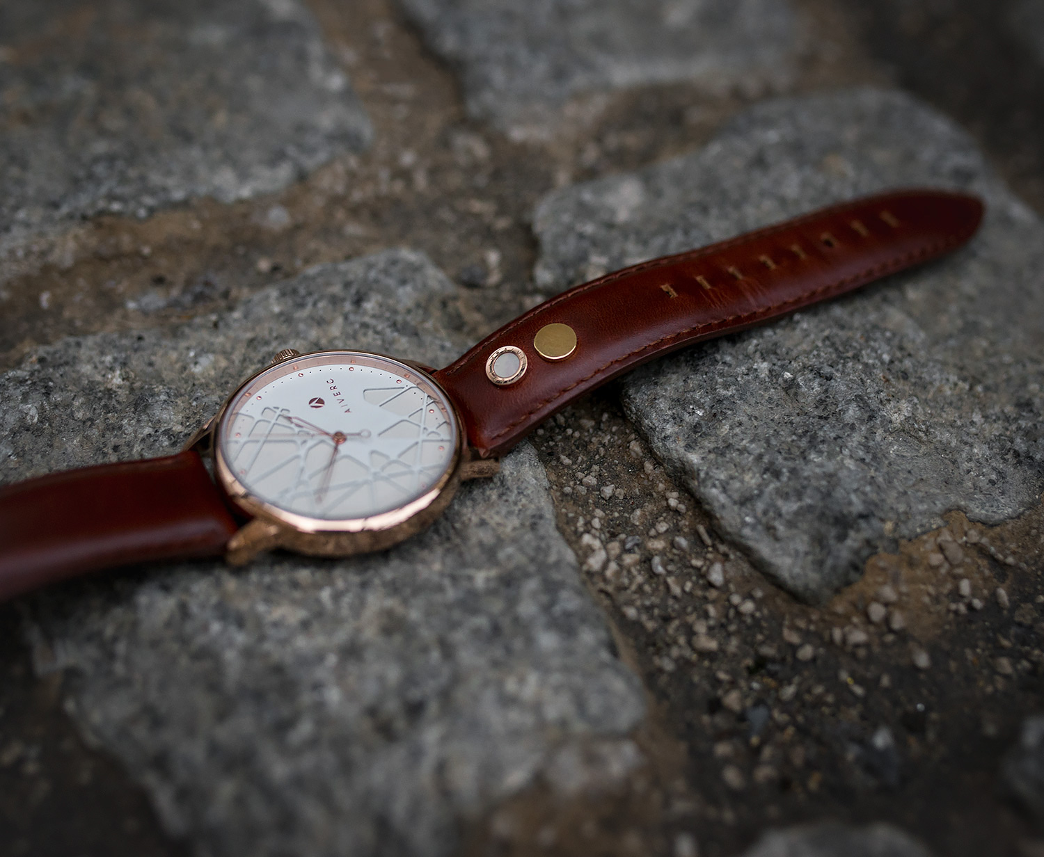 In contrast to the gleaming white face, the surrounding metallic parts are a beautiful gold colour, adding further elegance to the design. The hands are paired with the same colour to ensure an overall uniform look. Aiverc made the decision of using a leather strap for the watch, in my opinion, anything less would have been a disservice thanks to its obvious classic appearance. Opting for a calfskin fine grain leather with a soft touch feel, giving the added benefit of gaining its own individual distressing throughout its lifetime. I must make a special mention of its colour, a beautiful dark burnished style brown hue. It actually appears to have some depth to it, rather than the simple single colour tone you mostly see on watch straps.