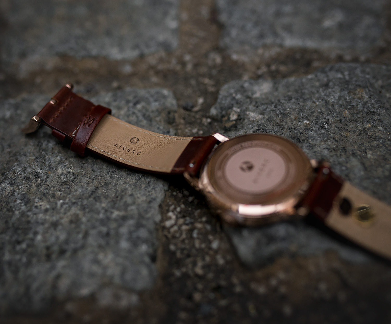 The reverse of the watch is similarly designed of a high standard (despite it rarely being seen by anyone but its owner). Entirely made out of the same gold colour, with the addition of the Aiverc brand and model details etched into the metal.