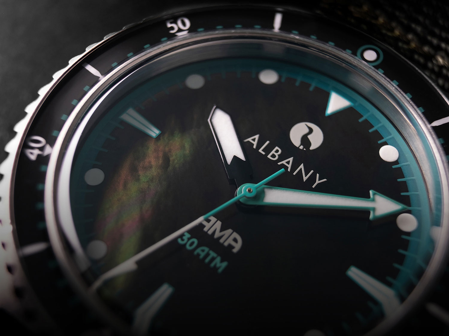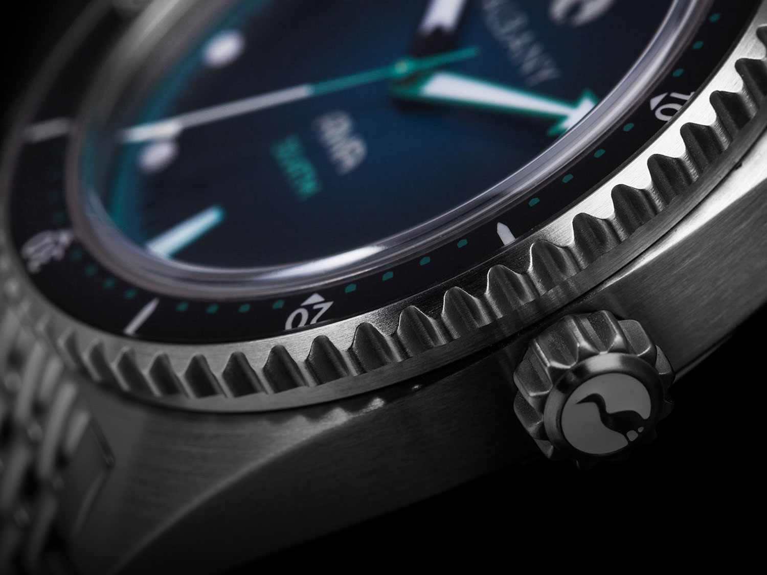 The inspiration of the Ama diver’s watch continues throughout the crafting of the watch hands featuring a knife-like hour and a spear-shaped minute hand, concluding with the second hands as harpoons. The hands feature a mix and combination of black and teal, allowing the wearer to read the time easily no matter the conditions. Additionally, Swiss Super-LumiNova® BWG9 has been applied to each of the three hands.