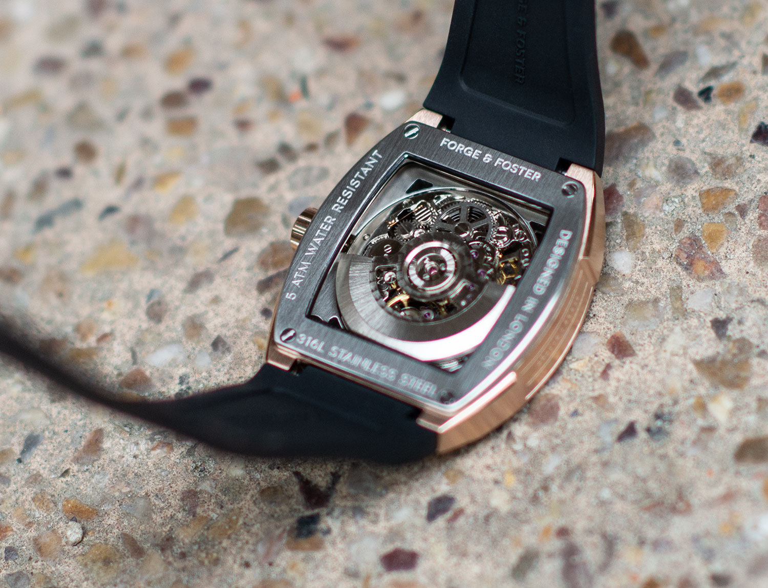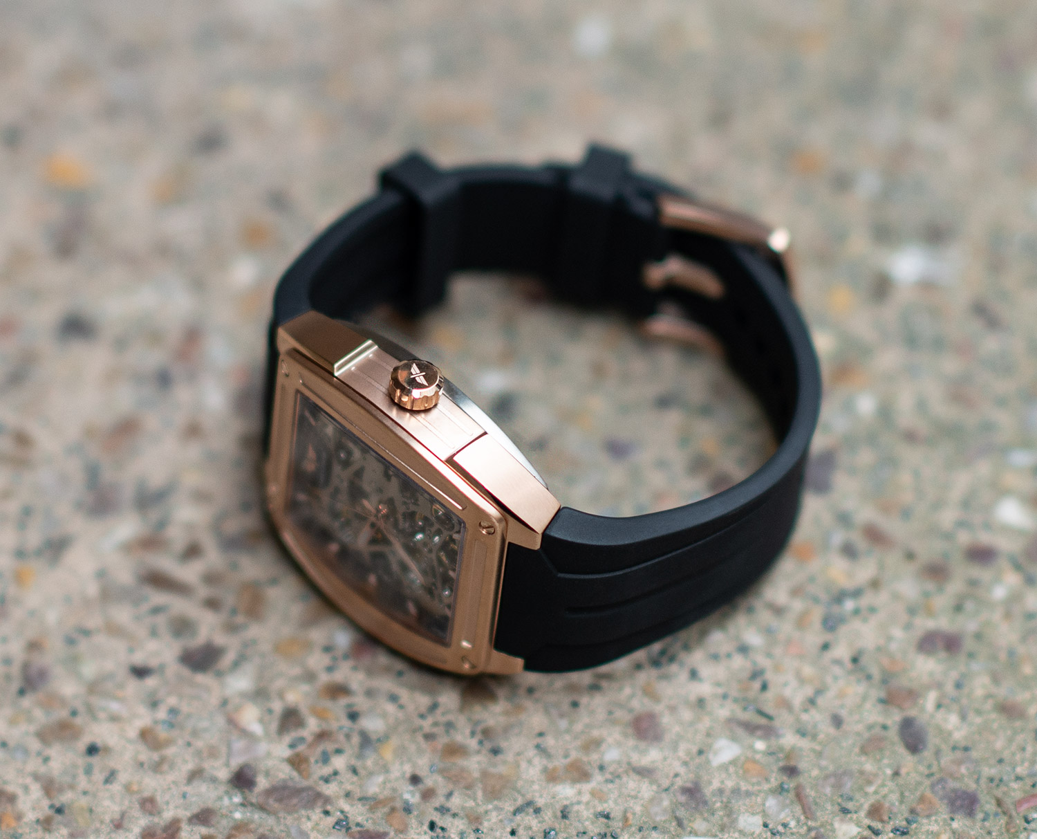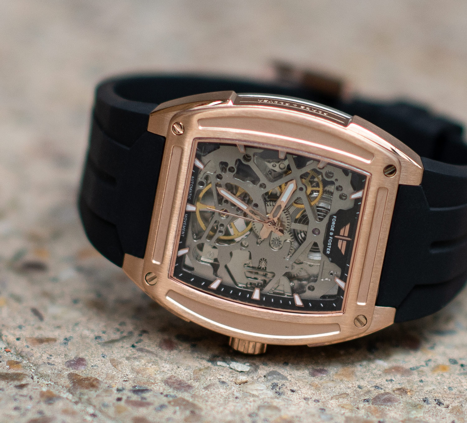 The watch boasts a truly fantastic design, opting for a more fashion-forward Tonneau barrel shape (roughly translating as “Barrel” in French). The almost rectangular appearance is a breath of fresh air surrounded by the endless round watch faces on the market. The casing is a medium size 41mm and is constructed using 316L stainless steel, bathed in a rose gold coating. The strap is crafted using vulcanised rubber in black, which is the perfect contrast against the metalwork of the watch itself.