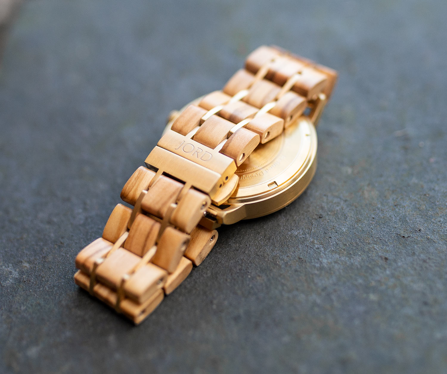 The watch’s secondary standout feature is undoubtedly the bracelet that is crafted using olive wood, which is a very soft and light-coloured wood, contrasting nicely against the much darker tiger’s eye face. The strap’s individual wooden parts are held together using the golden metal, also used on the bezel and the clasp on the strap itself (which also features the Jord logo, embossed into the metal).