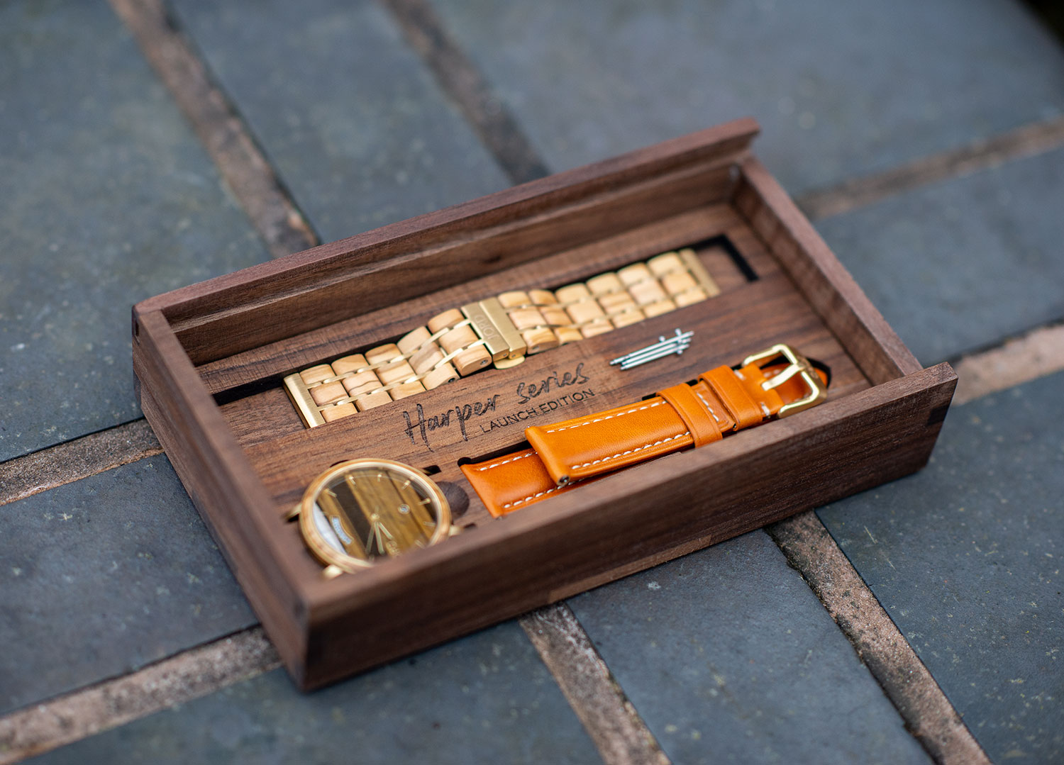 The Harper Jord watch arrives packaged in a beautiful wooden box, with the Jord logo carved out of the wood, proudly positioned on top of the box. The box lid slides out, revealing the body with both straps sitting comfortably inside cut out sections to hold them in place. The metal bars used to affix your chosen parts are attached to the wood as well. There is a small amount of text printed onto the inside, brandishing the watch style, in this case – “Harper Series Launch Edition”. Overall, the packaging is beautiful, and you will undoubtedly have it sitting with pride on your shelf amongst your other accessories.