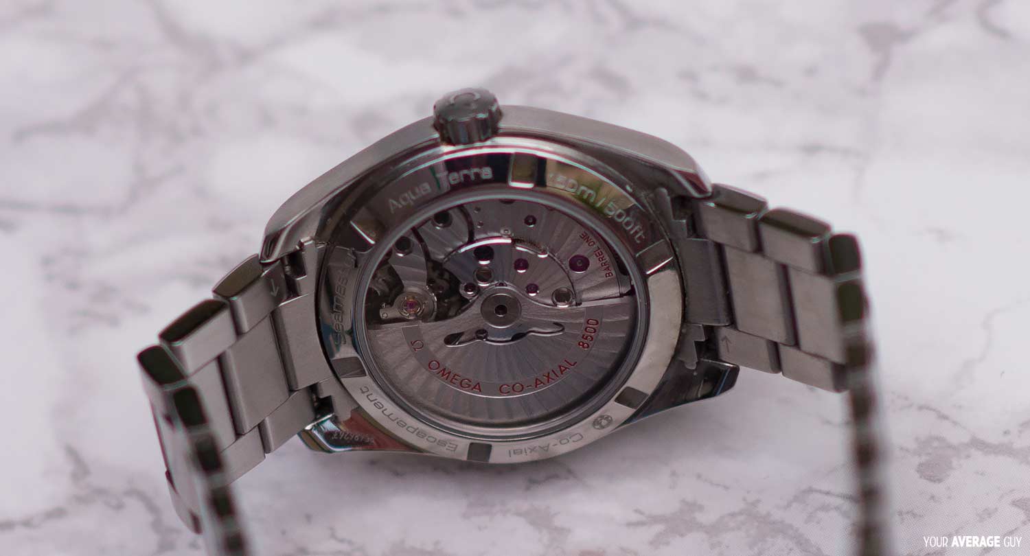 It represents a tribute to Omega’s rich maritime heritage, so the easily-recognisable dial design of this collection actually recalls the wooden decks of luxury sailboats. How cool is that? It features a sun-brushed and lacquered blue dial, as I mentioned above, which is decorated with the Teak Concept pattern and a date window at 3 o’clock. It also has scratch-resistant sapphire crystal to protect this unique dial. I can say that this is actually true as after 2 and a half years, the dial is still as good as new! There’s some scratches to the stainless steel strap (as to be expected) but the glass is perfect. The watch is powered by the Master Co-Axial calibre 8500 which is resistant to magnetic fields greater than 15,000 gauss and can be seen through the transparent case back. It’s also water resistant up to 150 metres!