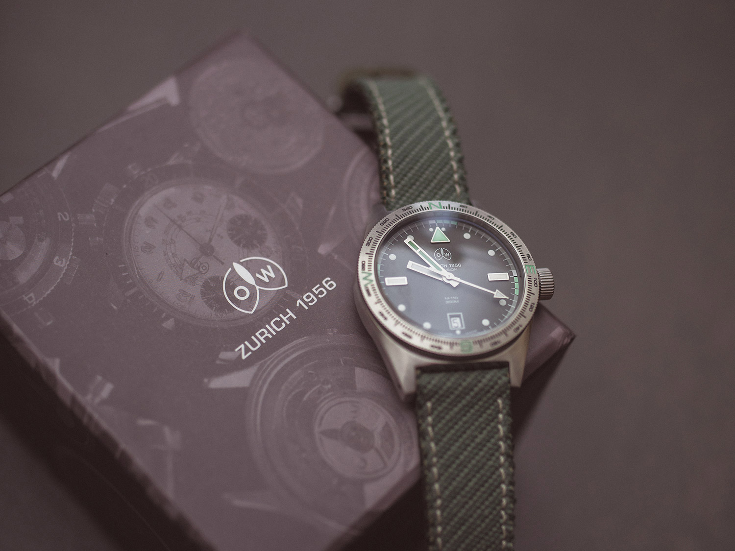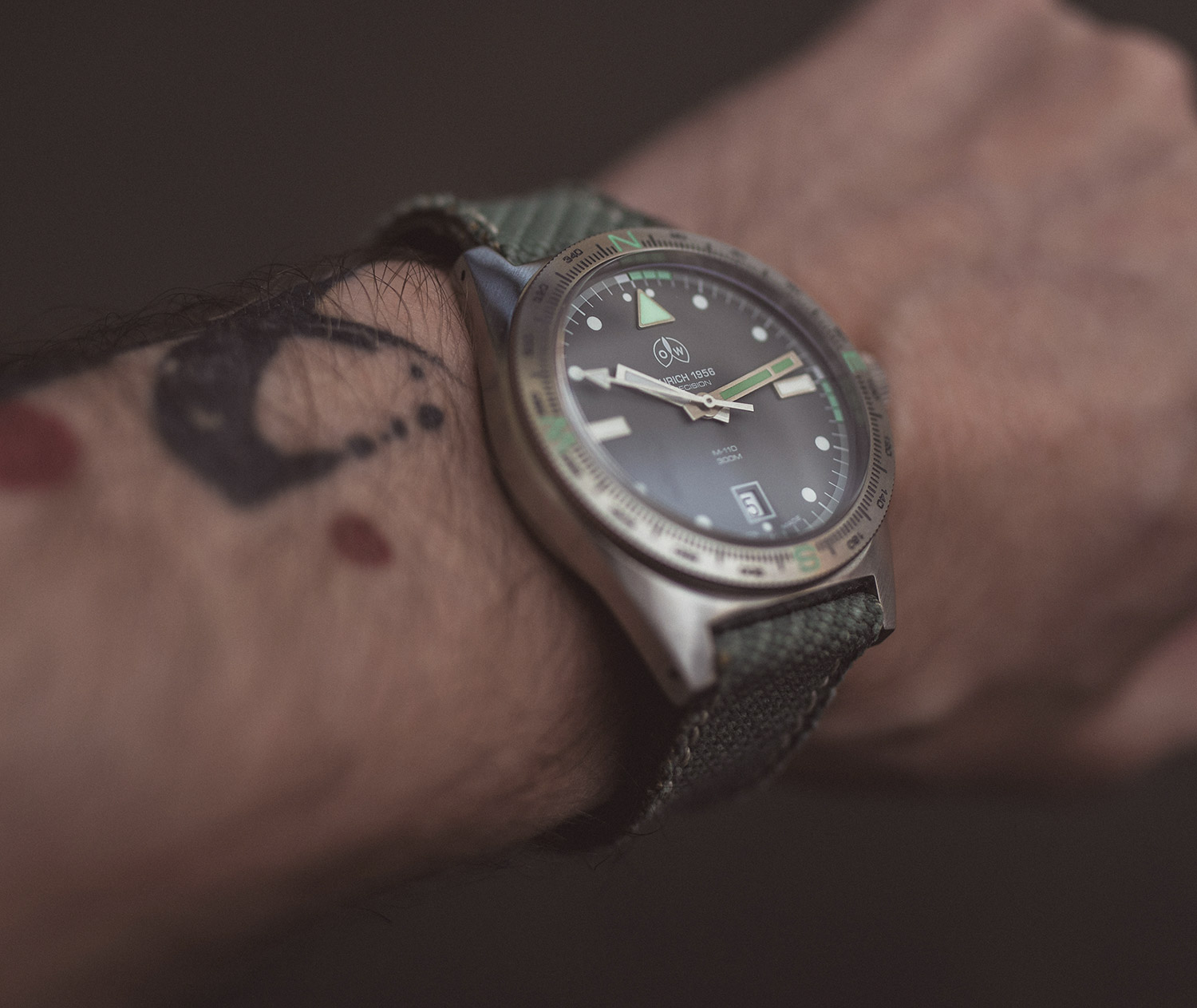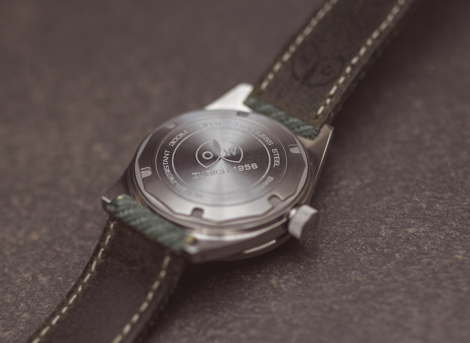 The reverse of the watch is solid steel, showcasing the brand name once more and detailing the 300m water-resistant capability. The olive green strap is plain, except for the steel clasp, which states the year 1956 (the brand launch date).