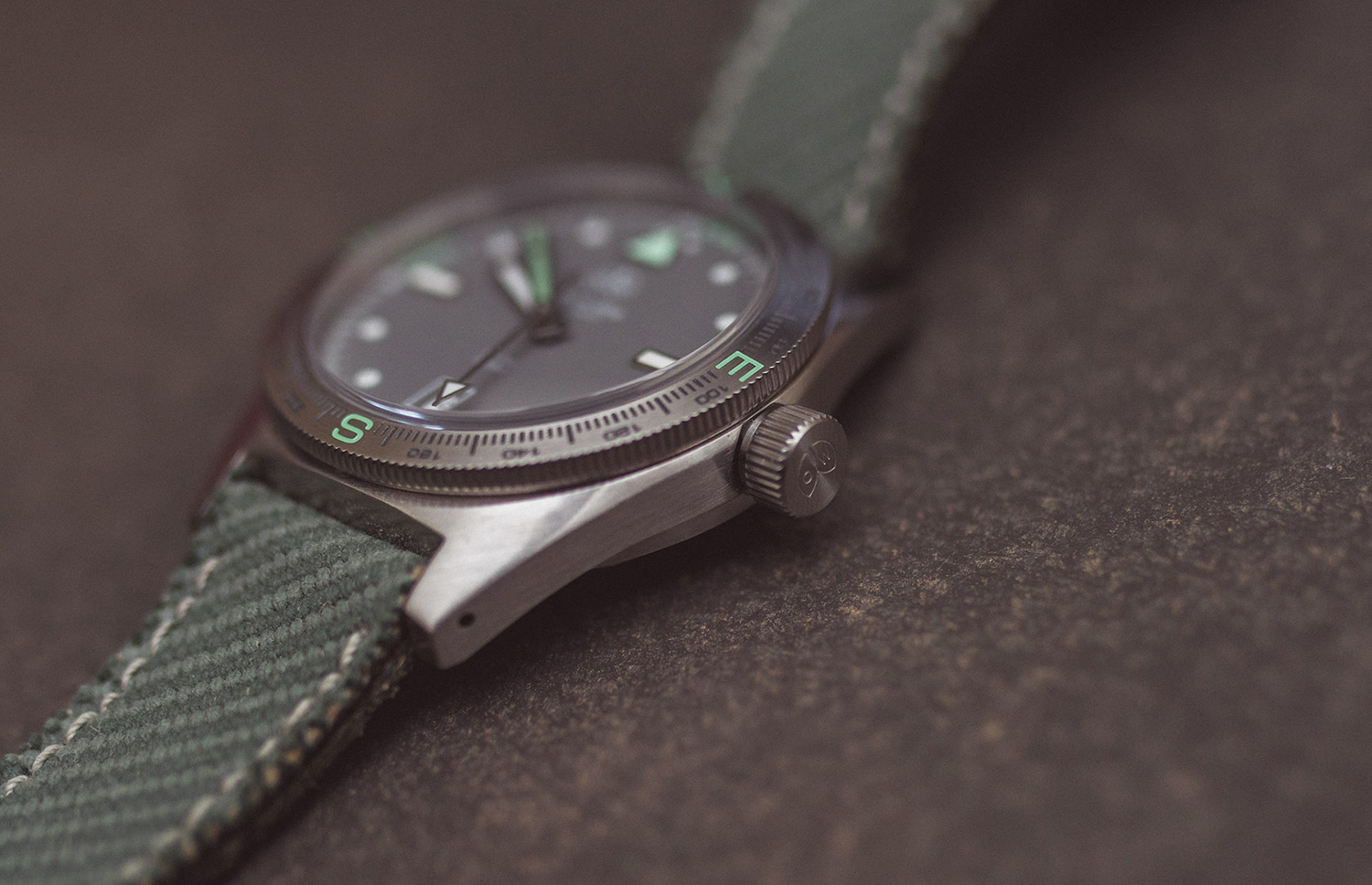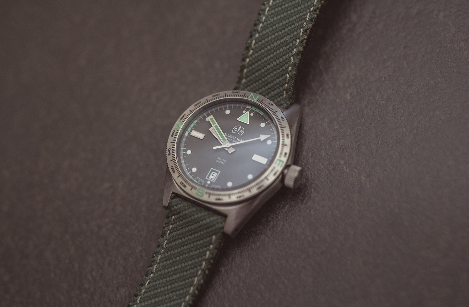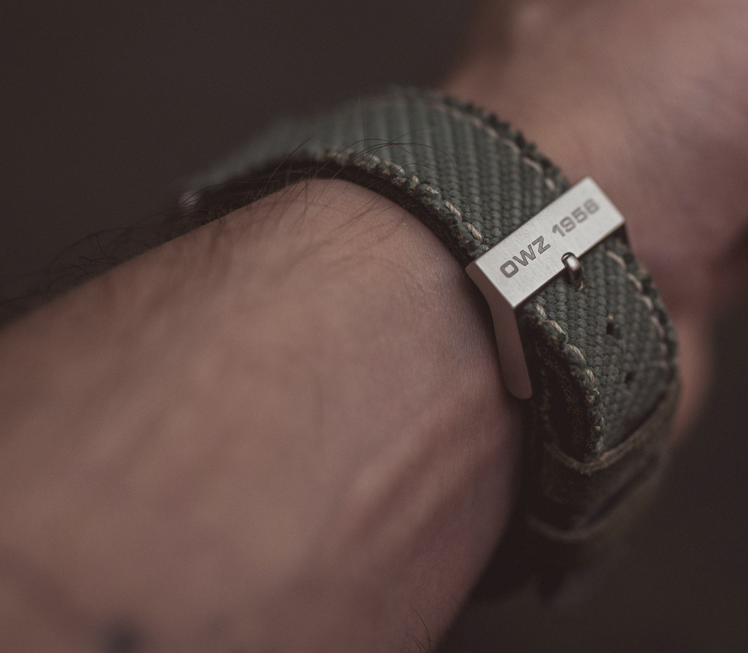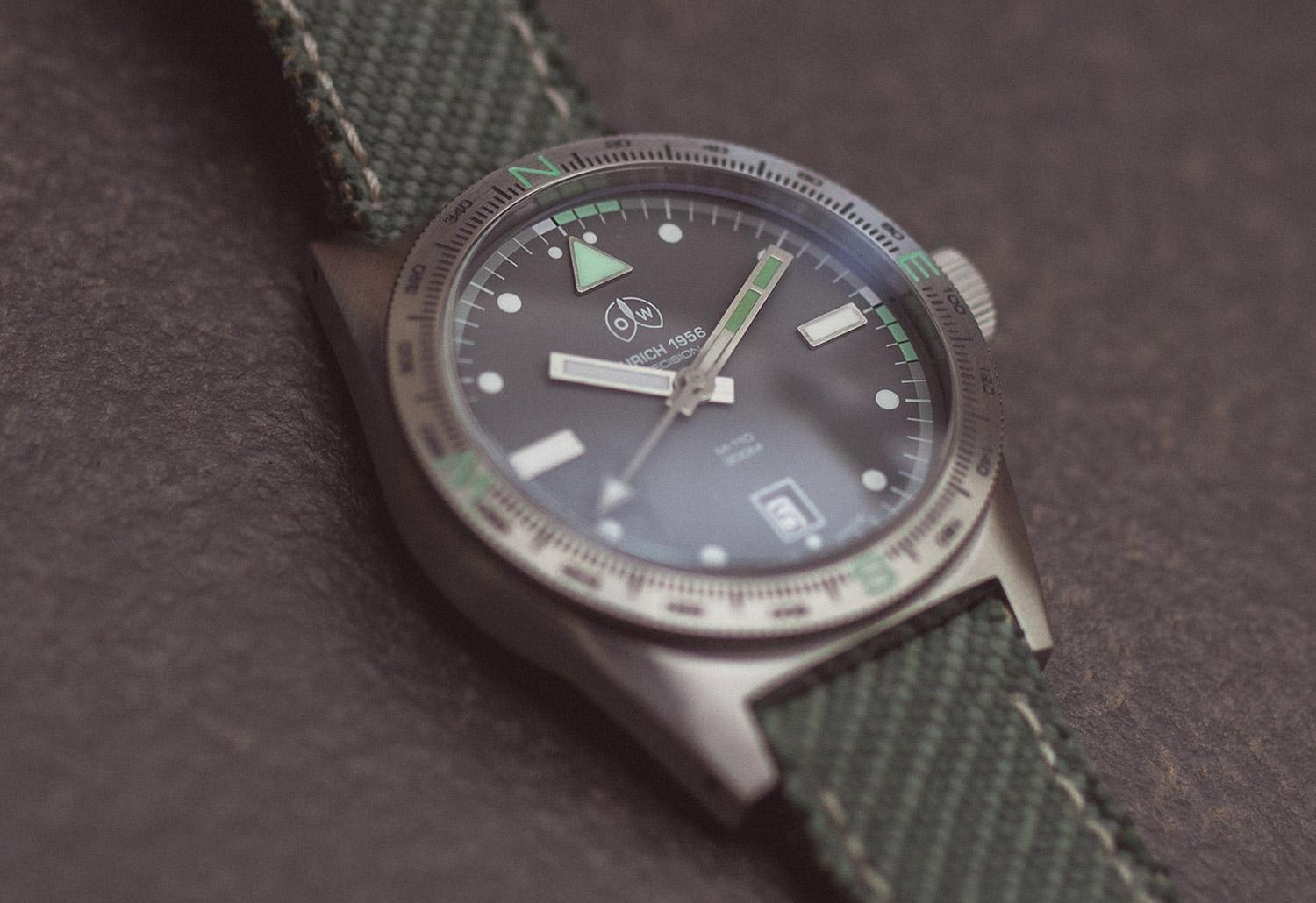 The reverse of the watch is solid steel, showcasing the brand name once more and detailing the 300m water-resistant capability. The olive green strap is plain, except for the steel clasp, which states the year 1956 (the brand launch date).