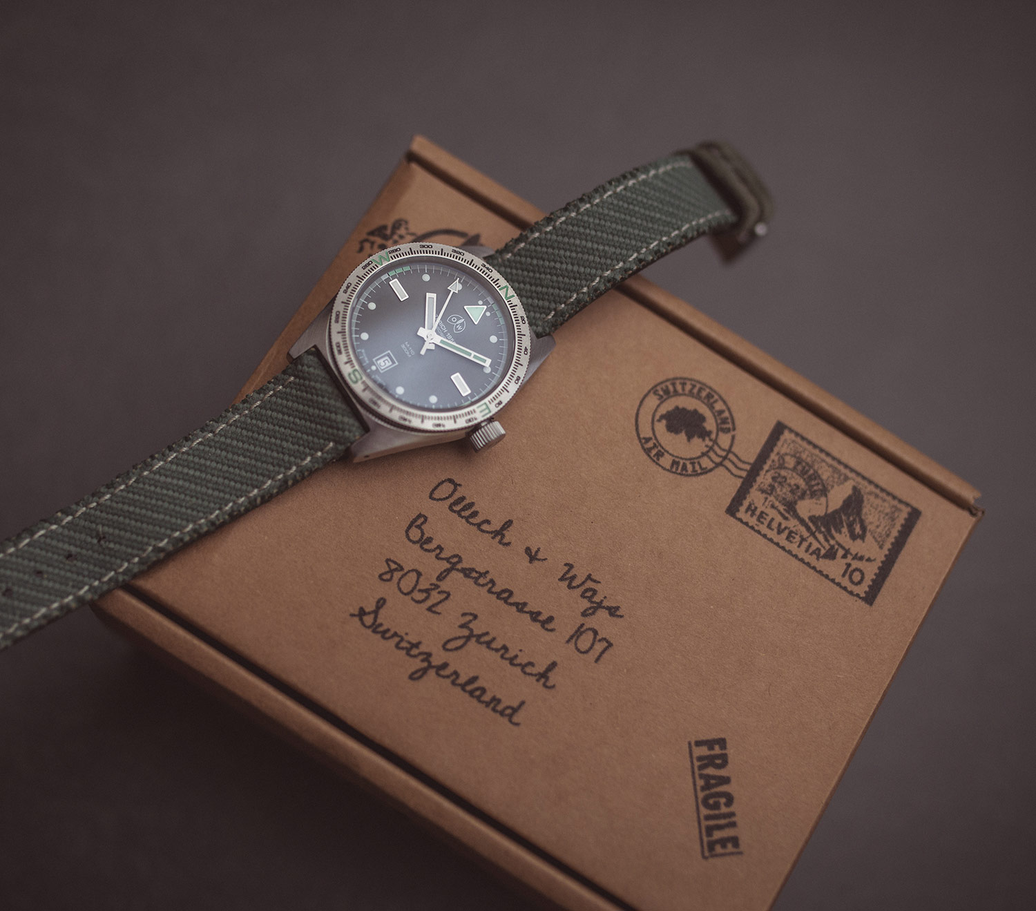 The M-110 AS arrived in a unique parcel; its outer layer is a brown box featuring text and images in the style of a letter/parcel from a bygone era (featuring the company address in a handwritten font). Within this container is a soft black dust bag for extra safety, and beyond this, we finally have the box itself – dark brown in design covered by a tint of watch designs with the brand name and logo sitting in the centre. The watch sits securely inside the solid card box, secured against a velvet fabric cushion.