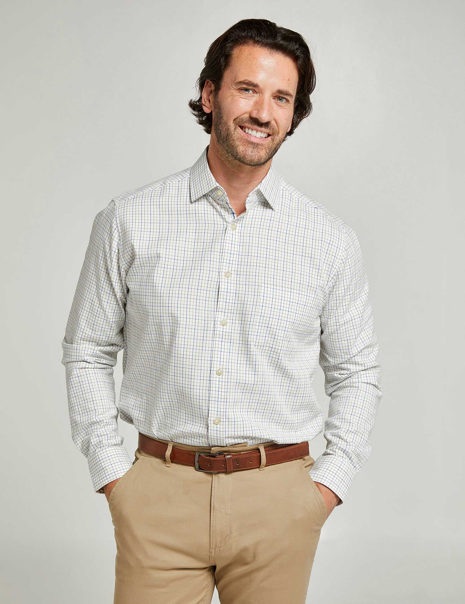 Next on the list, we have a shirt with a Tattersall check which certainly offers something different and uses a fantastic shade of green sage, brown and blue lines within its check print to really stand out. The fabric is a warm handle cotton that is extra thick and brushed for comfort.