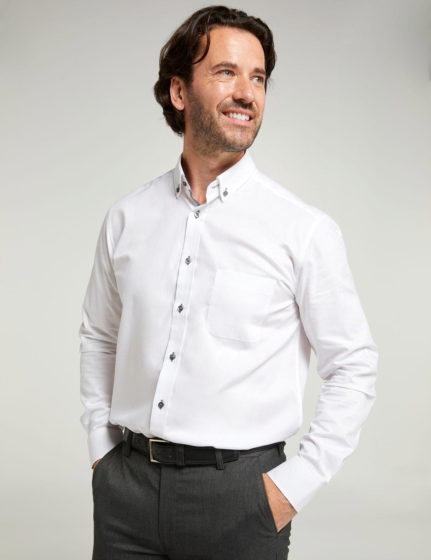You cannot beat a pure white shirt; however, DoubleTwo has gone one step further by using the intricate Royal Oxford Weave, which adds a touch of extra softness to the shirt and is instantly recognisable from touch alone. The buttons are a striking grey, which matches the contrasting inner collar and cuffs.