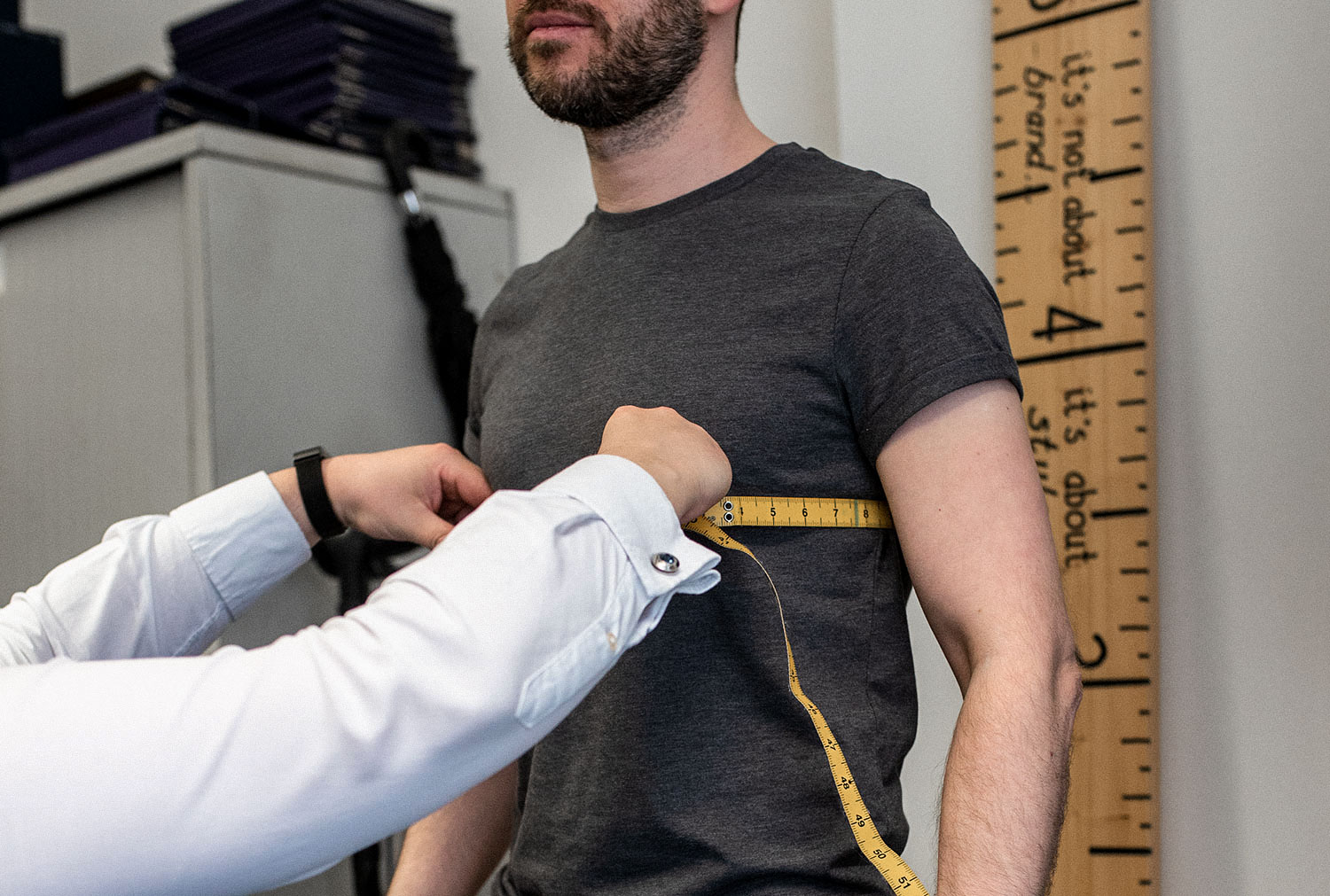 After the consultation, we then moved swiftly onto the measuring portion of the appointment. Acquiring your exact size is one of the most critically important aspects of the whole process, after all, if the measurements are slightly off, then it can potentially throw off the entire look of the finished suit. Jonathan takes his time when measuring, making sure every section of my body was catered for (even as far as taking into account my slightly off-balance shoulder – which I didn’t realise was that noticeable!). The end goal is to ensure the suit showcases the perfect silhouette across the body, both stationary as well as in motion (almost any outfit can look good while static – with the aid of clips, pins and of course photoshop!).