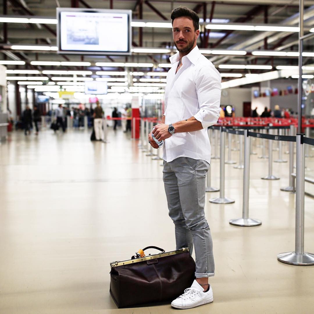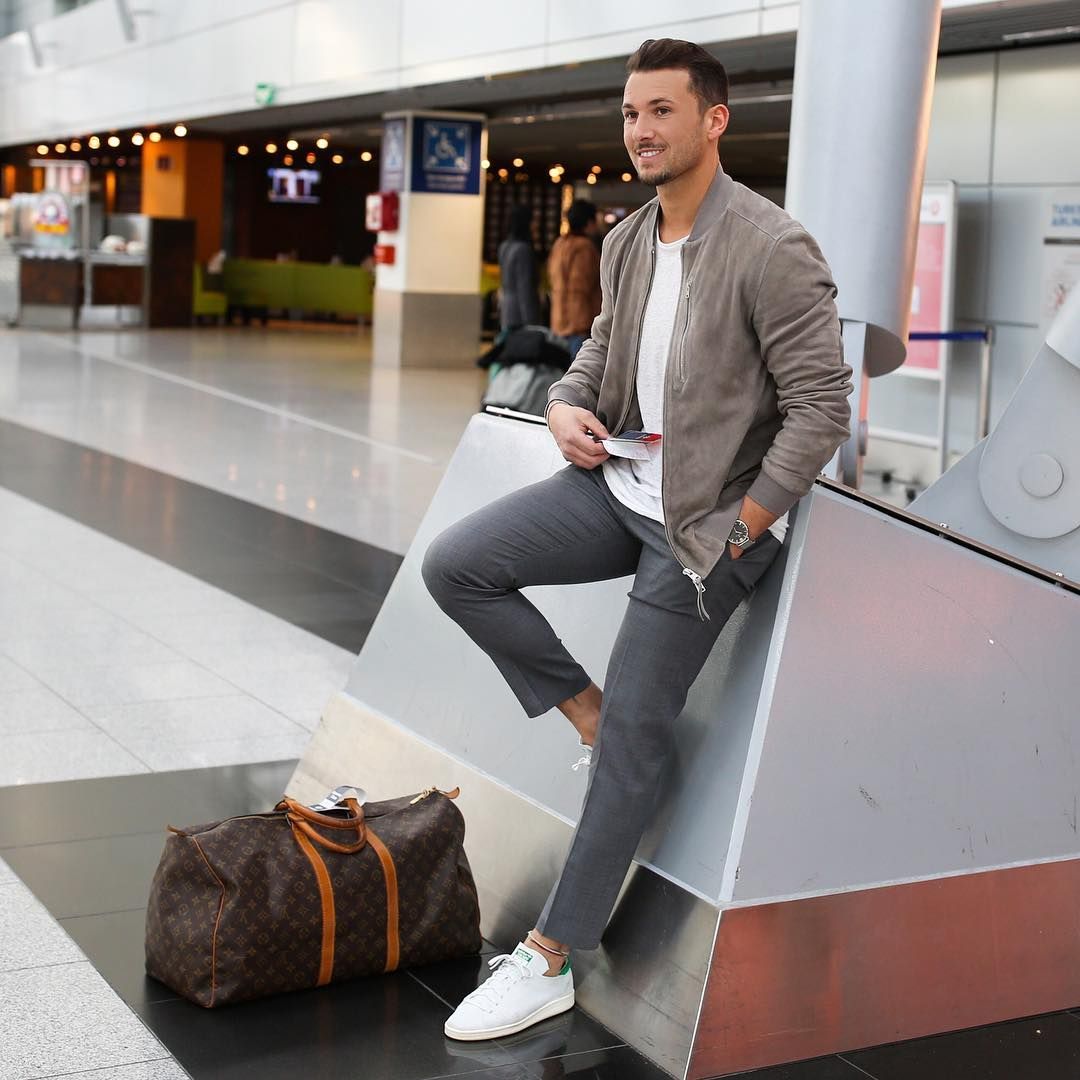 With so much time spent at the airport and even longer on the flight, it is essential your outfit contains essential elements of comfort. Dress to look good whilst feeling at ease in your choices. Plain simple tees in a shade which complements the coloured band on your side-stripe joggers (bonus points for the slim fit variety like in my Skinny Joggers and Balenciaga Race Runners Outfit) which are a big trend in men’s fashion right now. Pair with sleek neutral tone sneakers which are easy to slip on and off for the security check. For outerwear, throw over a lightweight bomber jacket or classic denim jacket, something which is easy to roll up and slip under your seat during the flight.