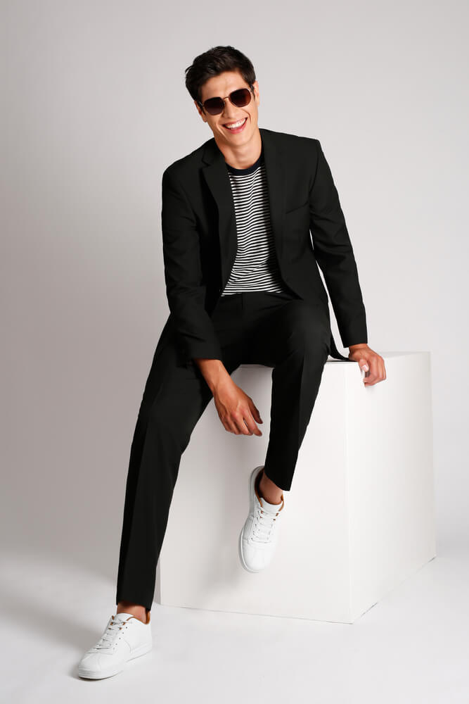 If a grey suit is your go-to number, pick out softer tones such as white or baby pink for the colour of your tee. Black brogues or even white trainers will keep the look fresh; remember to colour match your accessories too! If you are considering a navy suit, pair this classic number with a taste of vivid colours like mustard yellows and berry reds; otherwise, a subtle baby blue will do.