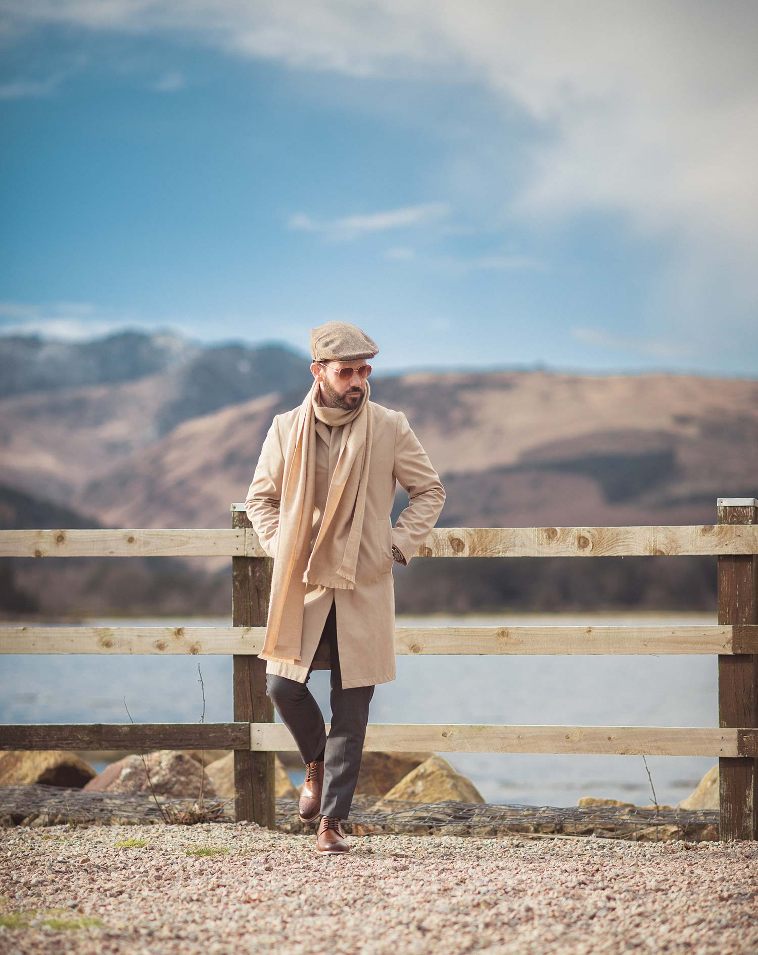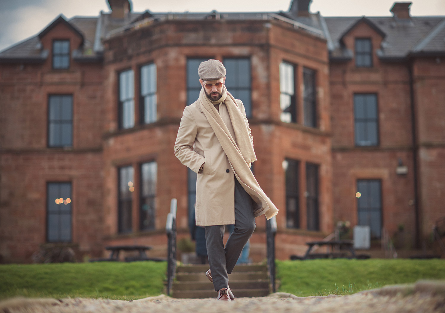 Once back at the hotel, I changed into the final look using the tan Arran brogues, paired with skinny fit charcoal grey trousers, beige trenchcoat with matching scarf and flat cap (with sunglasses to complete the ensemble) – we headed back to the sea view, just in time for the golden hour which provided a lovely captivating hue for the images. We found a different area, which showed much more of the ocean yet still allowed us to view the other side of the island. Once the images were taken, we used the Douglas Hotel for the final few shots of this outfit, using the striking architecture as the visuals beyond.