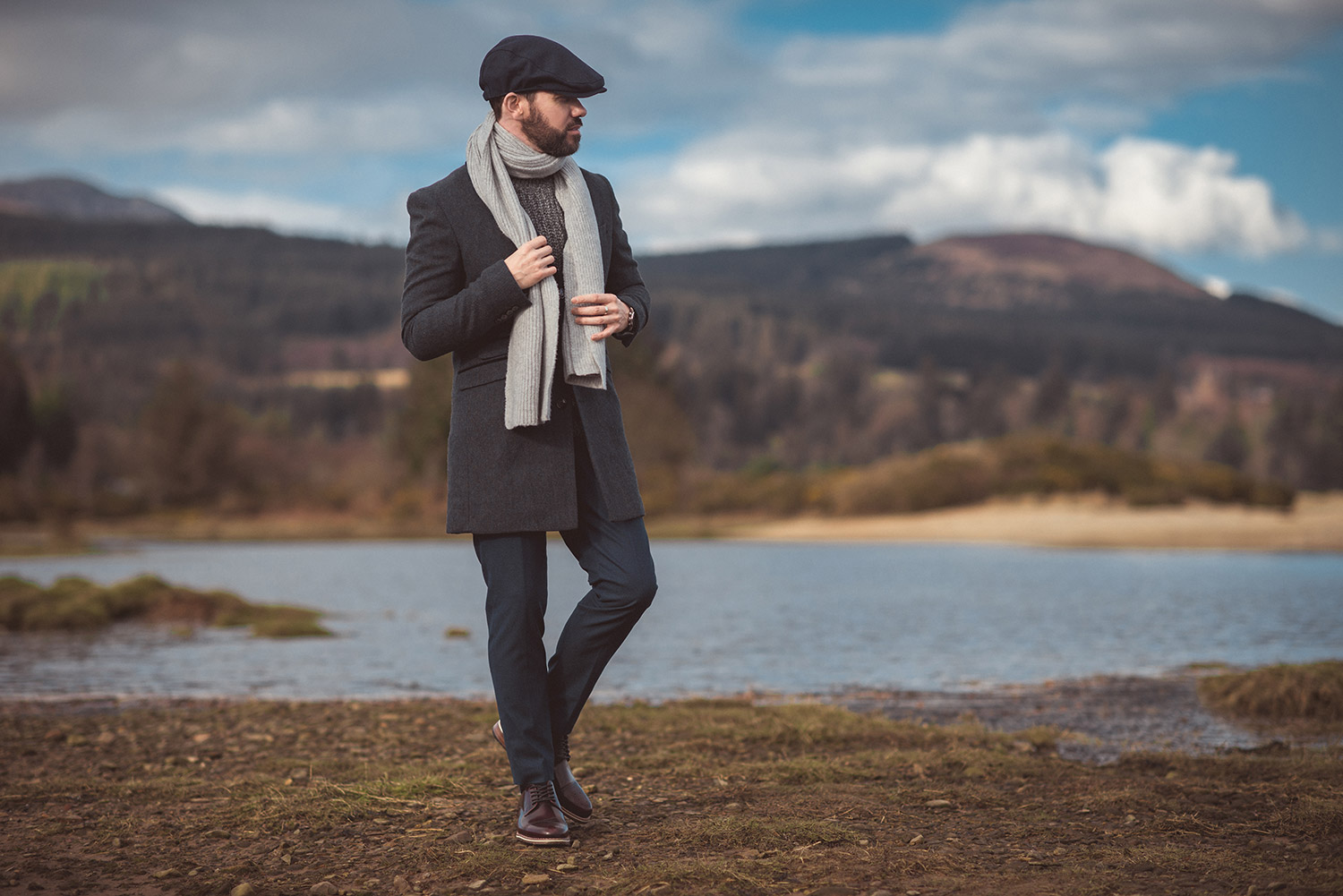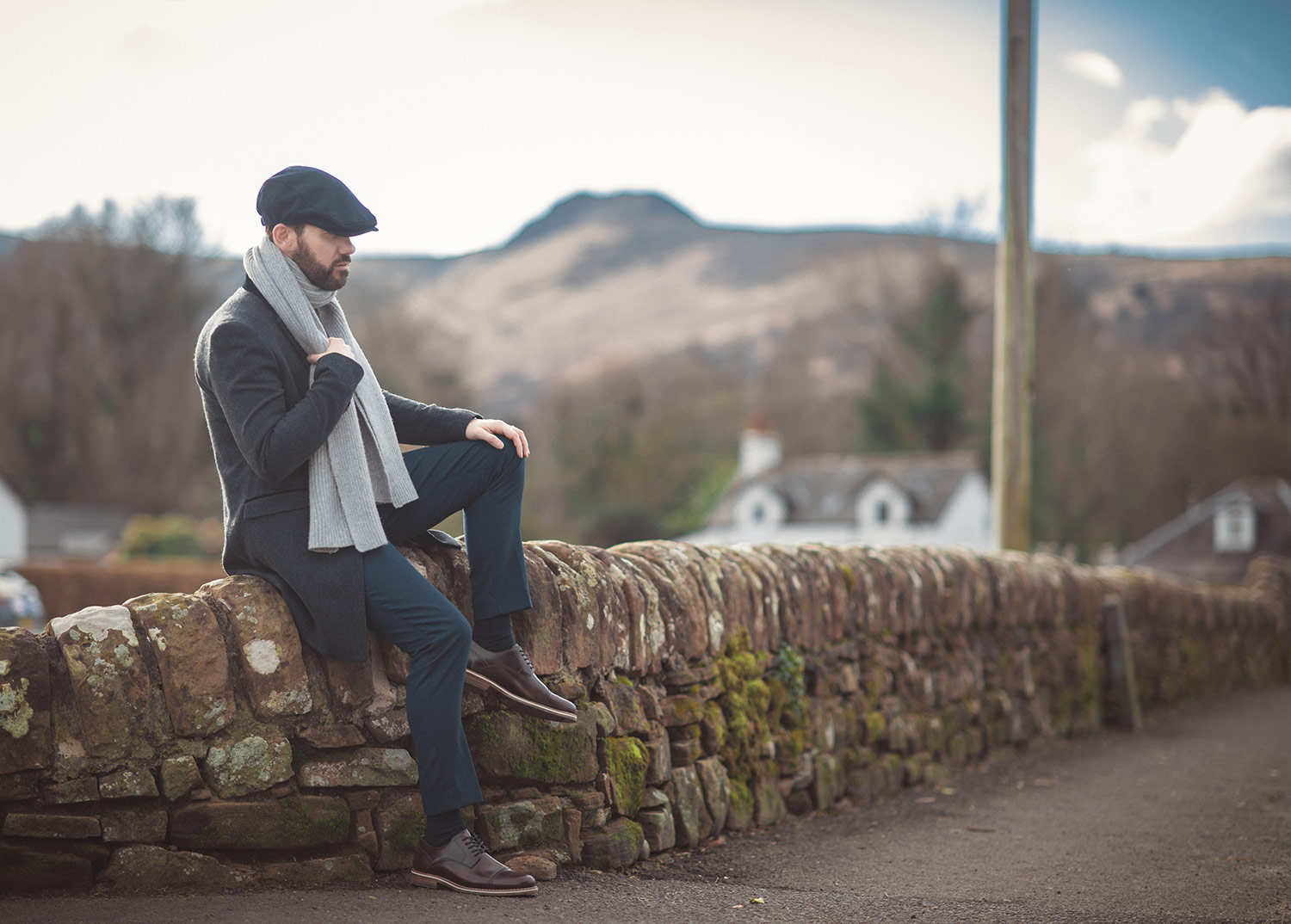For the second look, I went all out with an entire head-to-toe ensemble, including navy trousers, a chunky grey knitted jumper, a navy tweed overcoat, and a matching navy flat cap with a contrasting light grey scarf. The Helm Shoes were the beautiful burgundy model, which perfectly paired with my outfit. Once all dressed up, we headed for our long trek to our chosen location.
