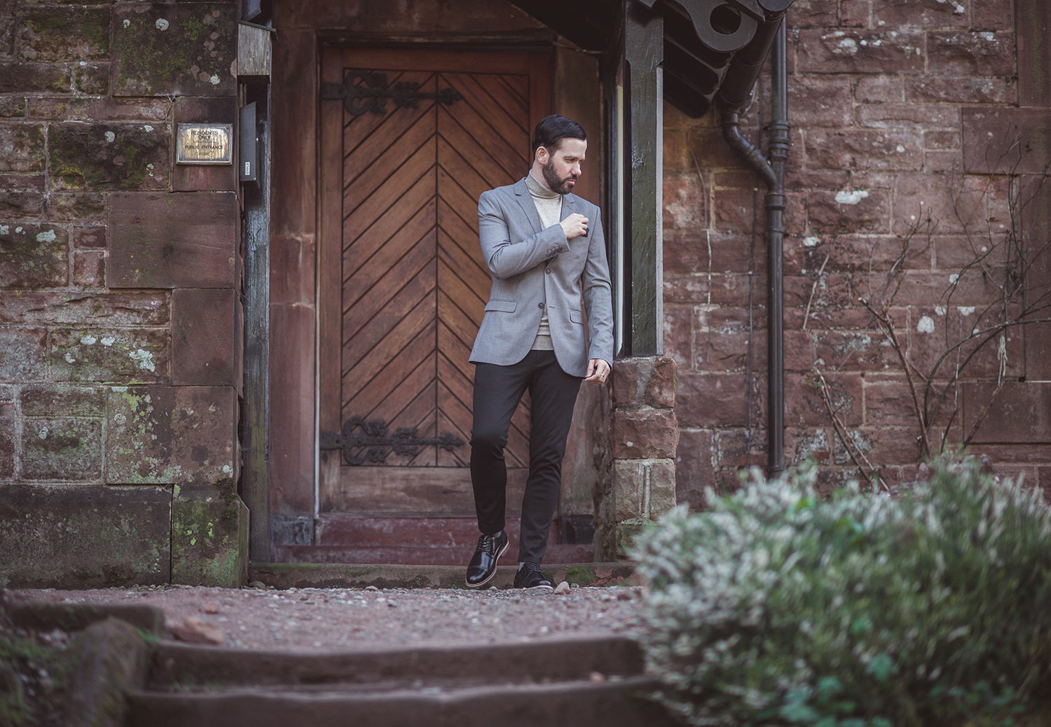 For the first look, I dressed in a smarter style using a grey blazer, matching roll-neck jumper, and black skinny trousers to pair with the Helm Arran Shoes in black. I used the outside of the hotel for these shots, with the old architecture as a setting along with the bright sunny day creating a striking glow.