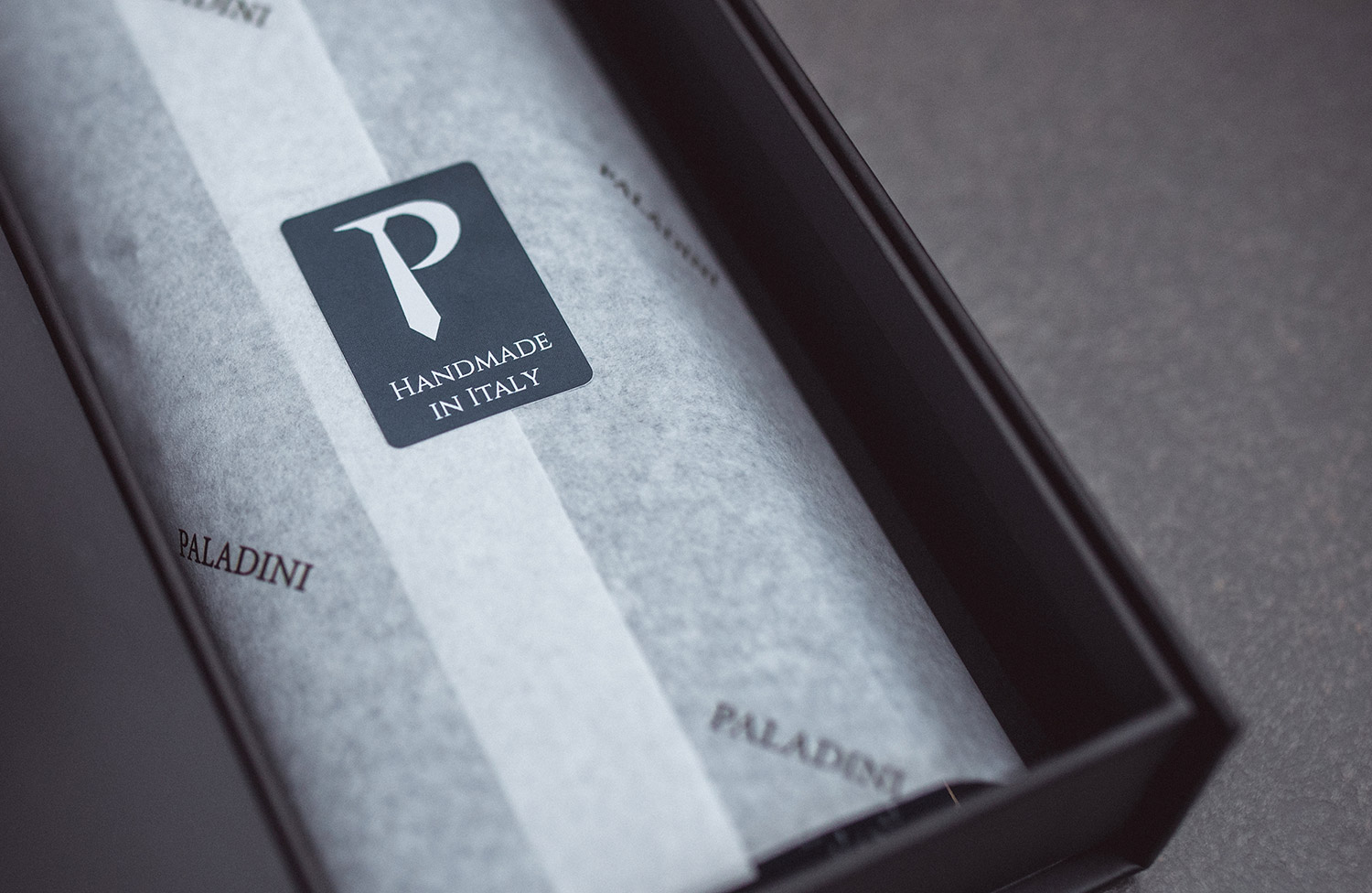 The La Galea set arrives in a solid gift box constructed in black with a gold foil ‘P’ on the front, and a magnetic closure flap opens to show its contents surrounded in branded craft paper. The set slips out of this wrapping easily, revealing the neck-tie and handkerchief neatly folded and held in place with a slip of navy fabric tied in a bow. Paladini shows the way all premium items should be delivered.