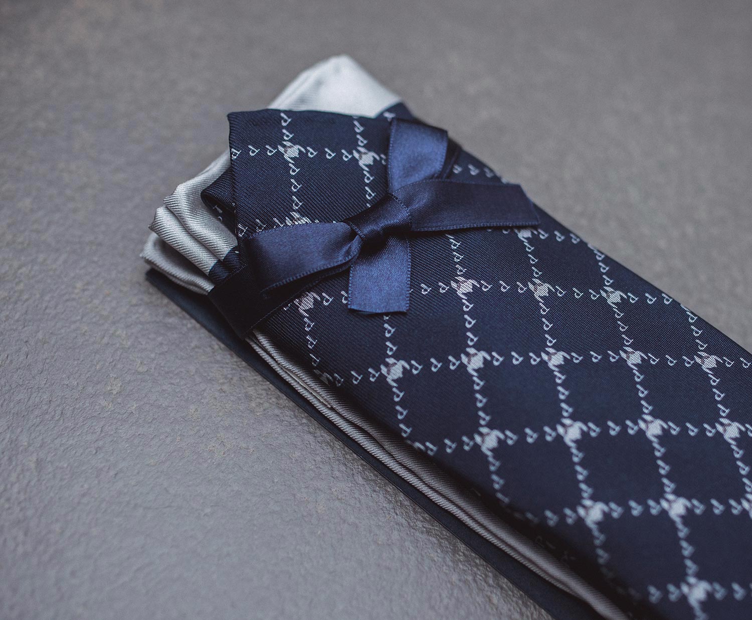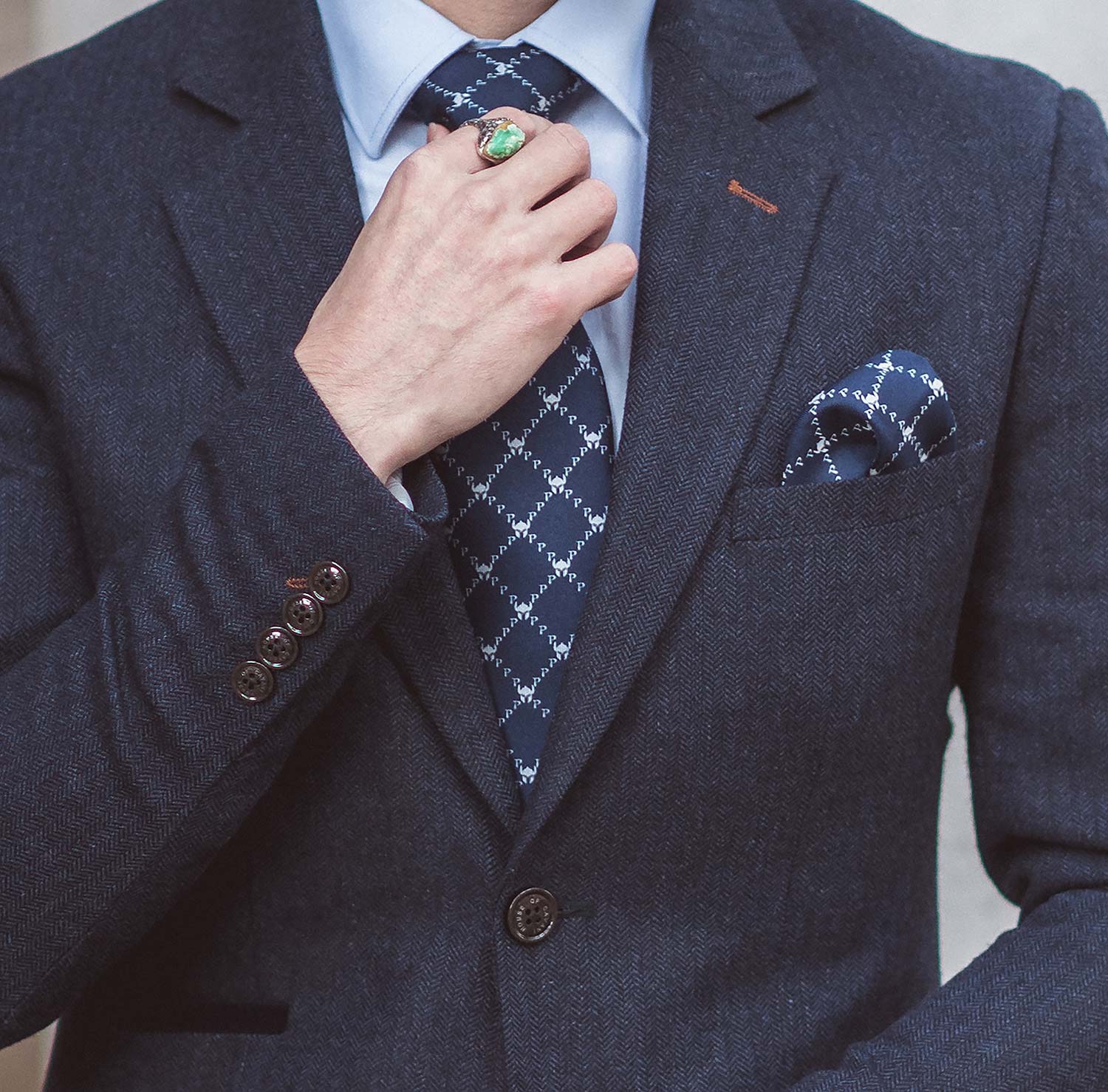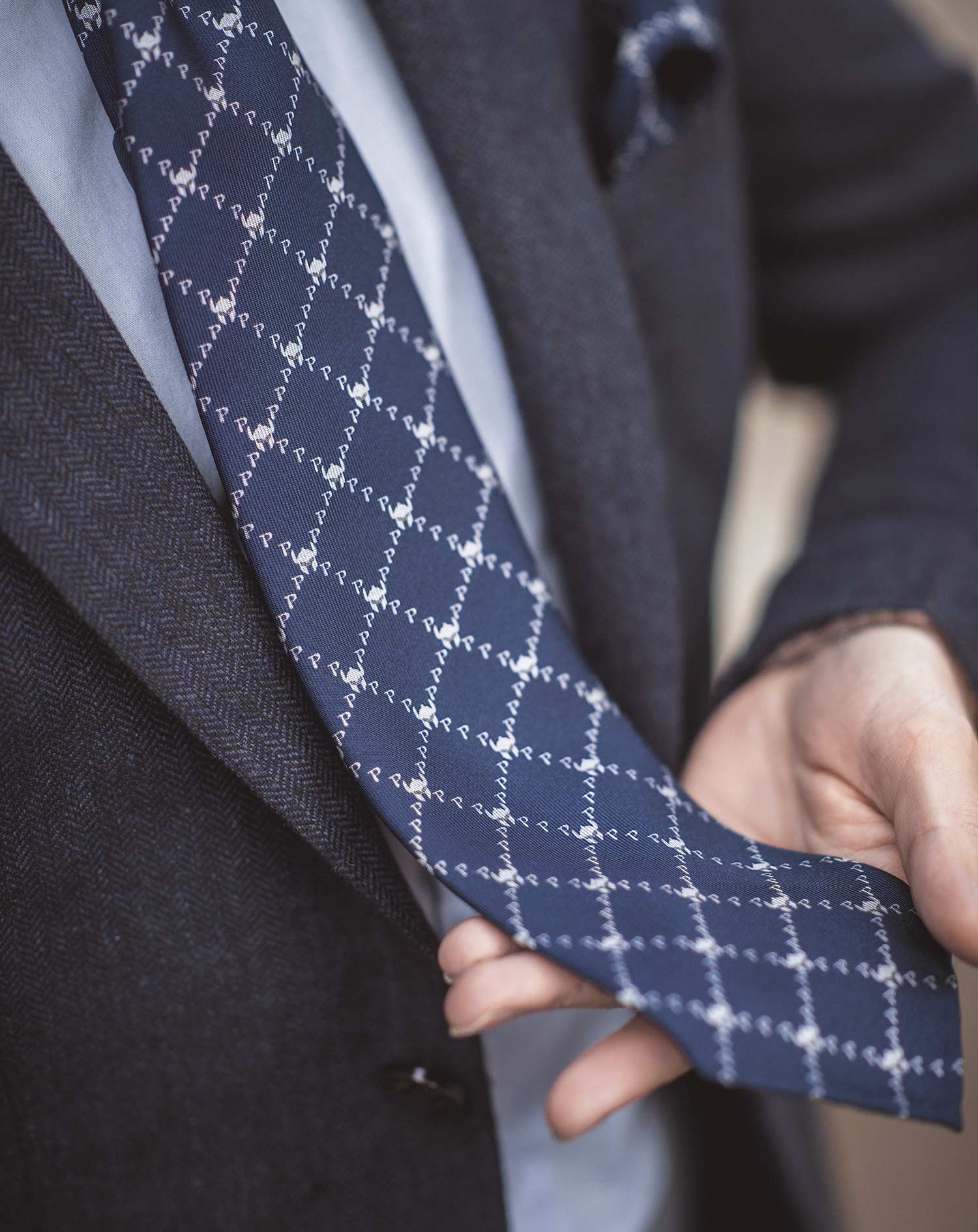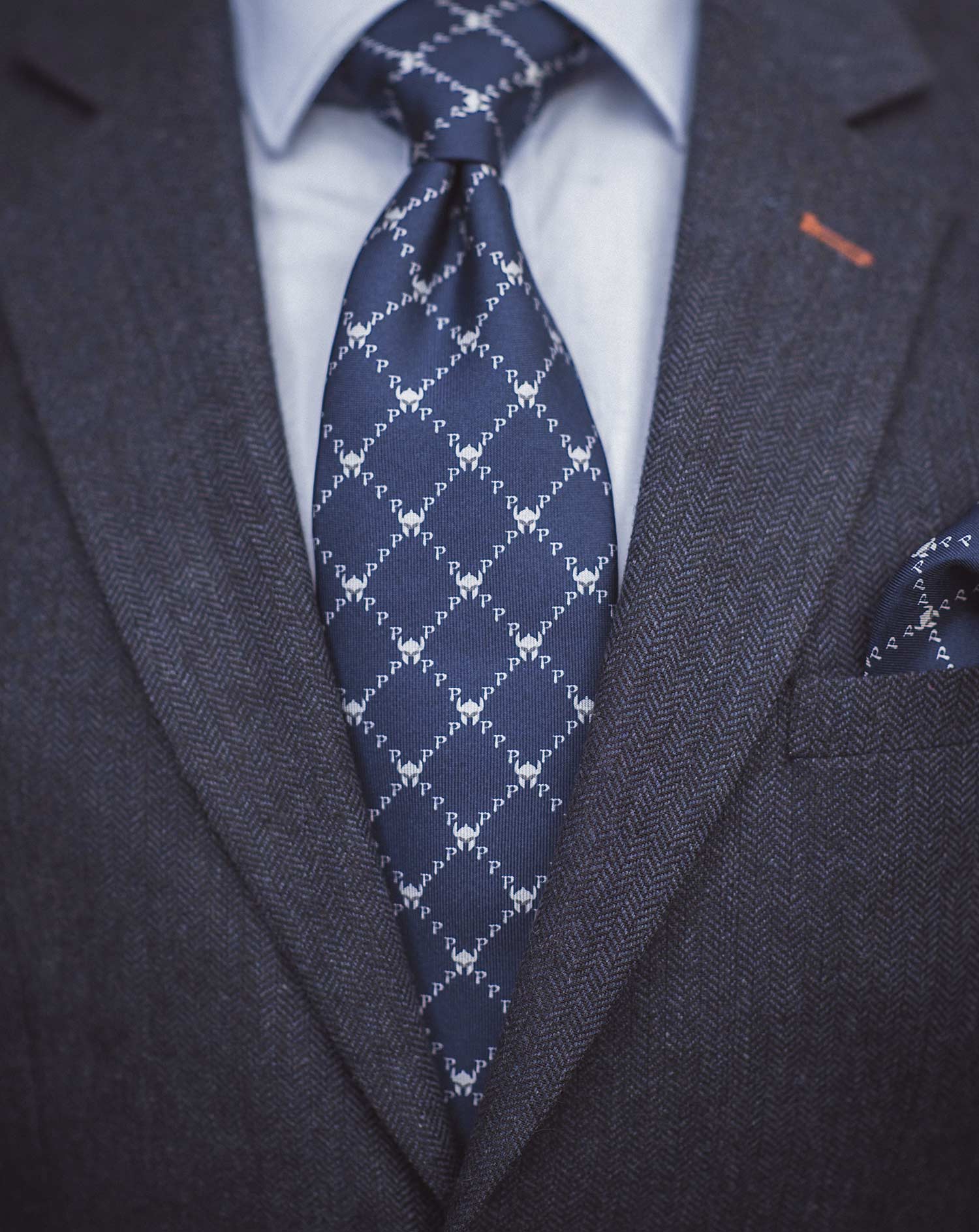 The La Galea set includes both a neck-tie and handkerchief, which is bathed in a striking navy blue and complementary silver/grey, featuring a monogram style with the Paladini ‘P’ and a Galea helmet (from the Roman army). The pocket square also includes an additional border effect, which can be visible depending on how you fold and wear it.