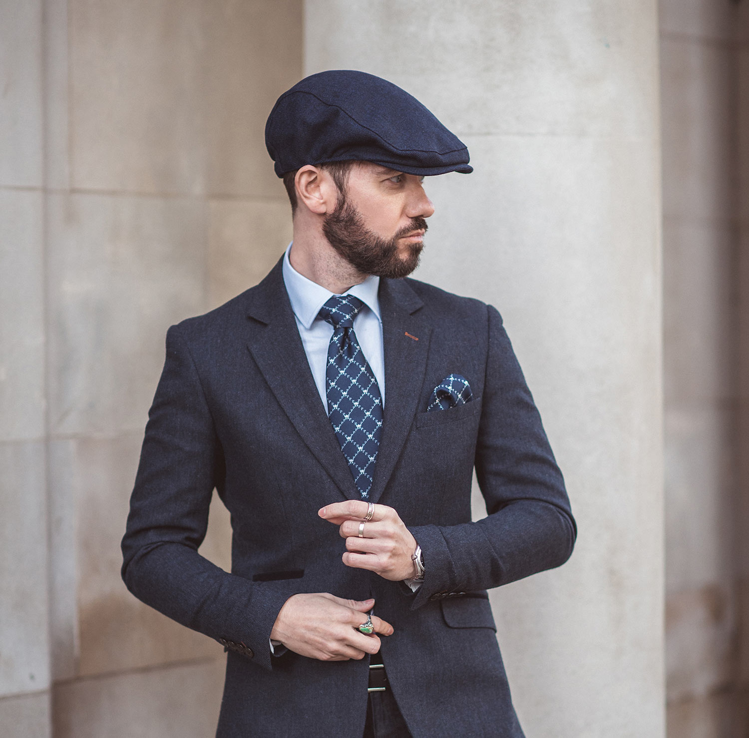 This beautiful silk combo can be paired with almost any shirt and jacket ensemble; the navy blue colouring blends well with numerous other hues and shades. In the summery seasons, you could opt for light tones such as beige, tan, or light grey, and during the winter, style the set with matching dark blue, brown, or even black (I myself paired them with a dark blue tweed blazer and flat cap with a royal blue button-up shirt).