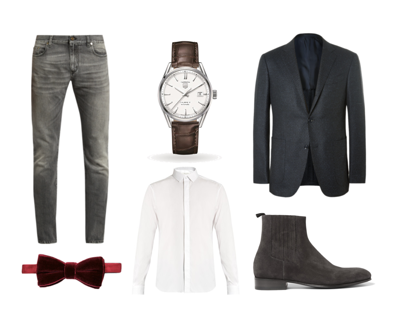 On my men’s fashion blog for my 1st outfit I have picked a selection of beautiful items from some of my favourite European designers. Starting with a pair of skinny grey jeans, paired with a dark coloured chelsea boot. Up top I decided on a classic fitted white button up shirt, layered with a slim blazer for that touch of sophistication. Accessories wise, nothing else but a smart leather strapped watch upon the wrist and a quirky bow tie in a gorgeous burgundy velvet to add a pop of festive colour!