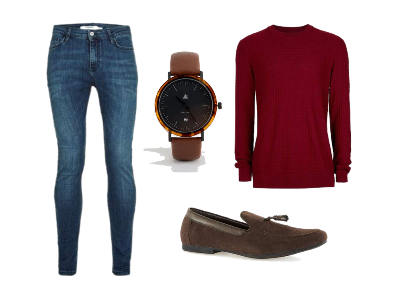 For my 2nd outfit choice, I went for a much more casual and relaxed look from the much more affordable high street stores, necessary after the heavy Christmas expenditure! To begin, I’ve picked a striking dark burgundy red sweater to add some vibrancy to the proceedings, teamed with a pair of spray on super skinny jeans in a dark blue wash. For my footwear choices, I chose a pair of dark brown suede loafers with added tassels. Finally, a brown strapped watch with a unique case.