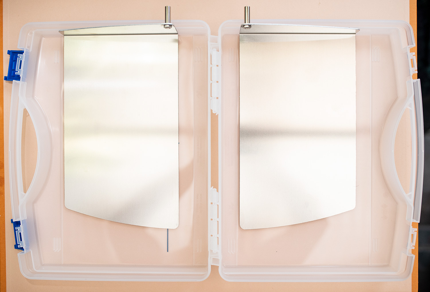 If you are starting with hands or feet, you simply take the plastic case and split it into 2 (following the instructions to the tee), place the metal electrodes inside each tray, lay the towels down onto each, and fill each side with tap water.