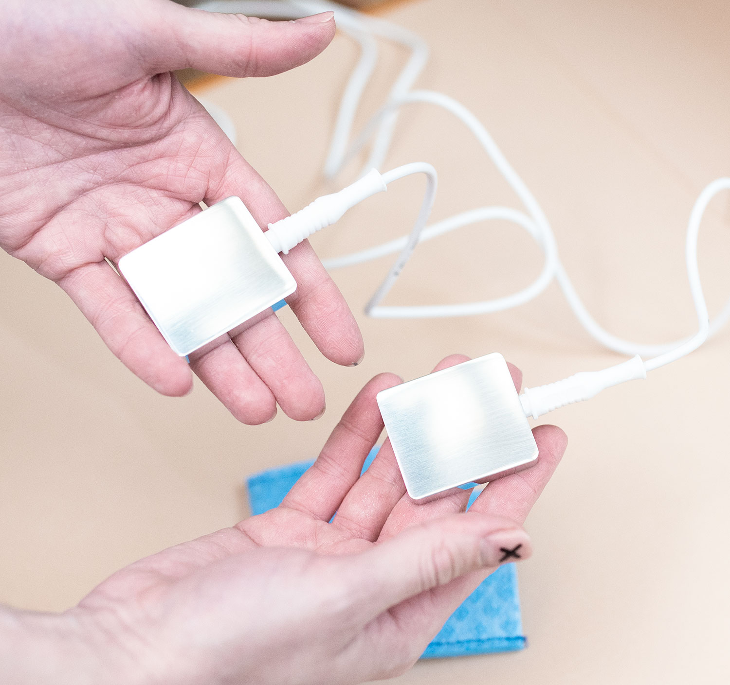 You go through the same process for feet, but underarm treatment is slightly different; you take the small metal electrodes and slip them inside the blue fabric pockets, then hold them tightly in place underarm for 15 minutes.