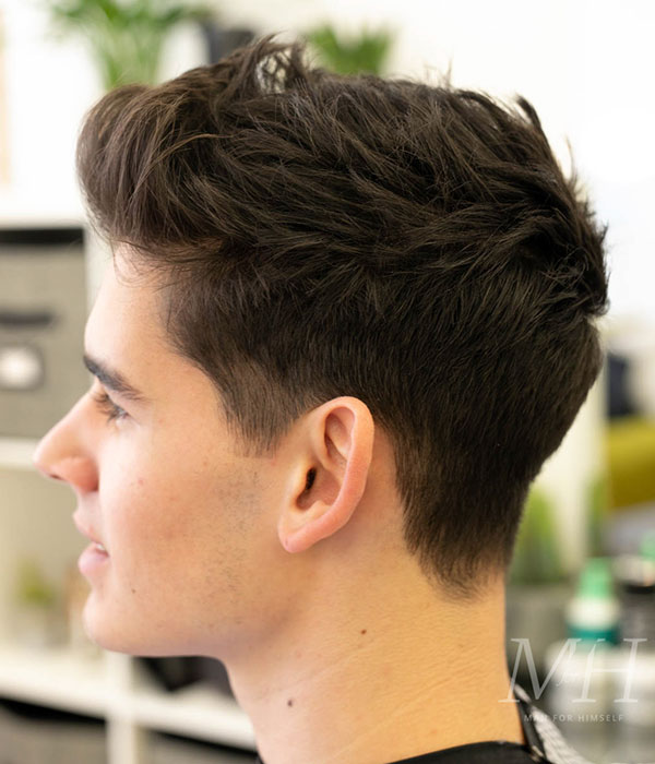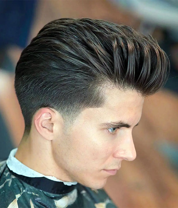 It is achieved with a long section of hair at the hairline, flowing straight up, contrasting against the tapered sides and back. Along the top, the textured hair pushes forward from the crown, meeting the quiff at the front (adding volume).