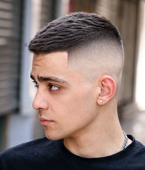 Next, we have the crew-cut fade, which features short hair at the sides and back with slightly longer hair on top. This simple yet classic style remains a favourite for many men around the world. For this example, you’ll create a longer-than-normal crew cut that flows forward with a slight side-swept fringe (which showcases that iconic Ivy League variation).