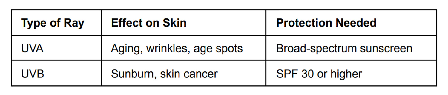 UVA rays are responsible for prematurely ageing skin, causing age spots and wrinkles, whereas UVB rays cause sunburn. Even so, both types of rays can cause skin cancer, which is another reason why comprehensive defence for your face and skin is essential.