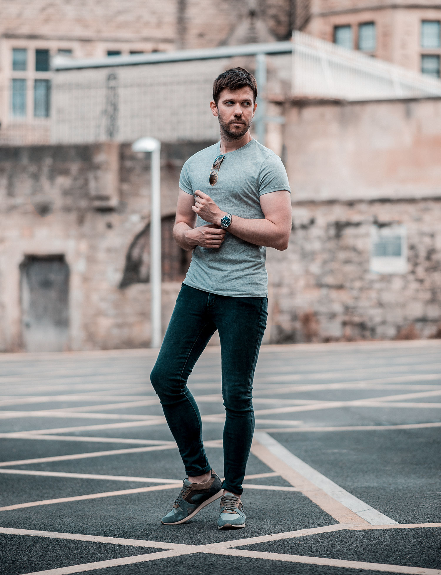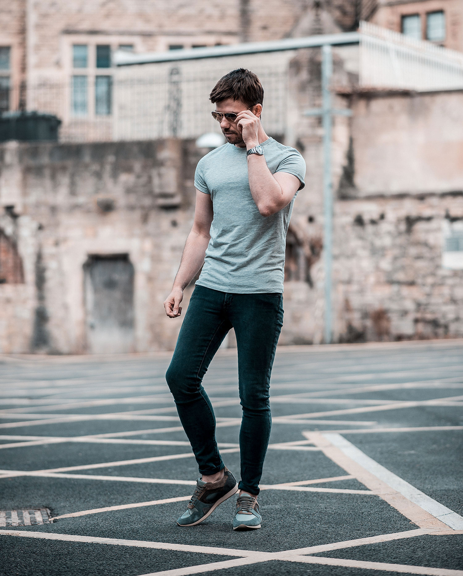 ASOS is nearly always my first point of call for a T-Shirt, I find they are the best fitting if you are on a budget, so this grey roll sleeve piece from their current collection was ideal for this outfit. My chosen denim was a pair from the American brand – James Jeans, which was the very first time wearing them (nice and sleek, yet still very comfortable!). Footwear, I dug out one of my old pairs, which regular readers will remember when I featured them in my Burberry Field Sneakers Review. Finally, I donned my Ray-Ban Aviators to alleviate the effects of the bright sunshine!