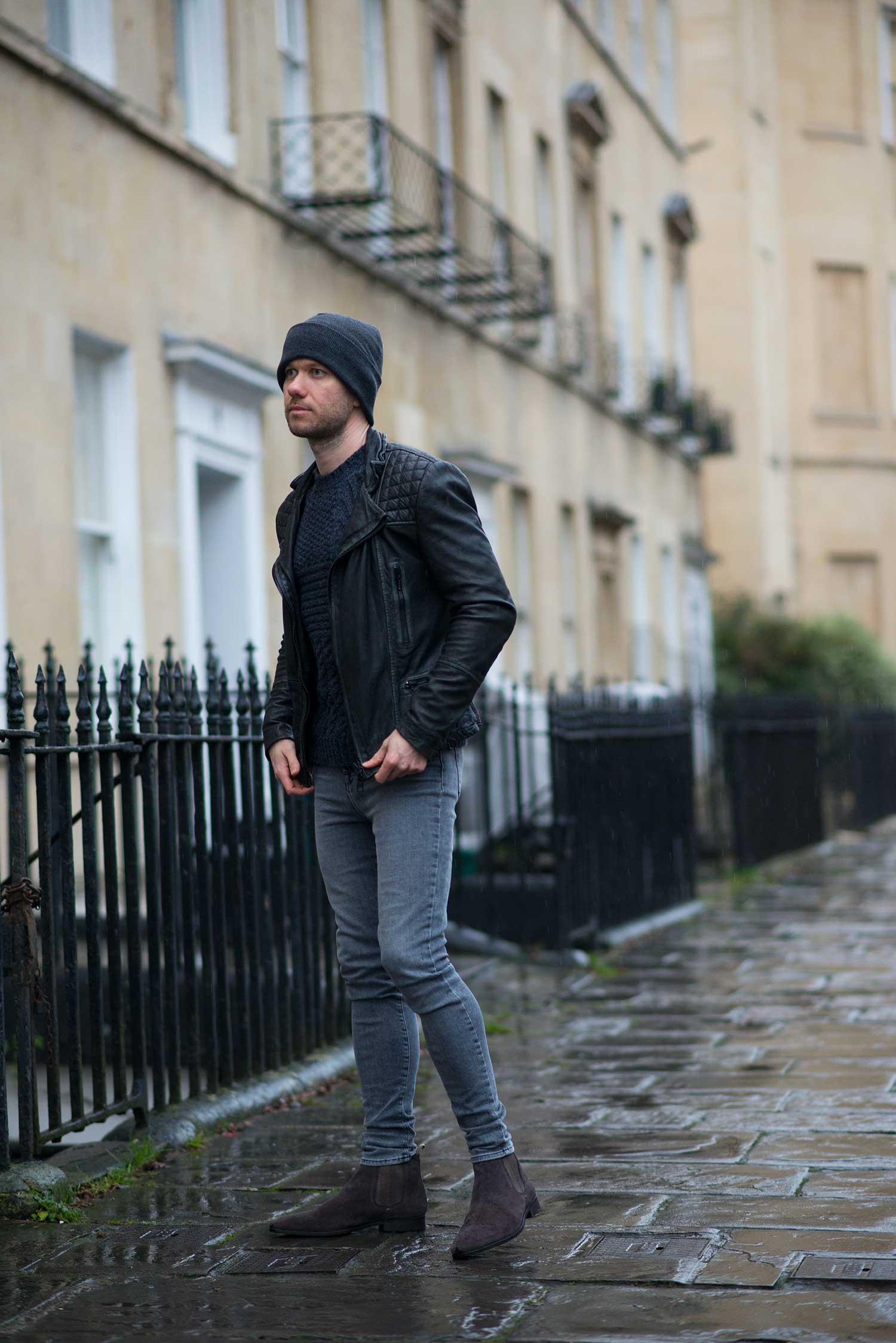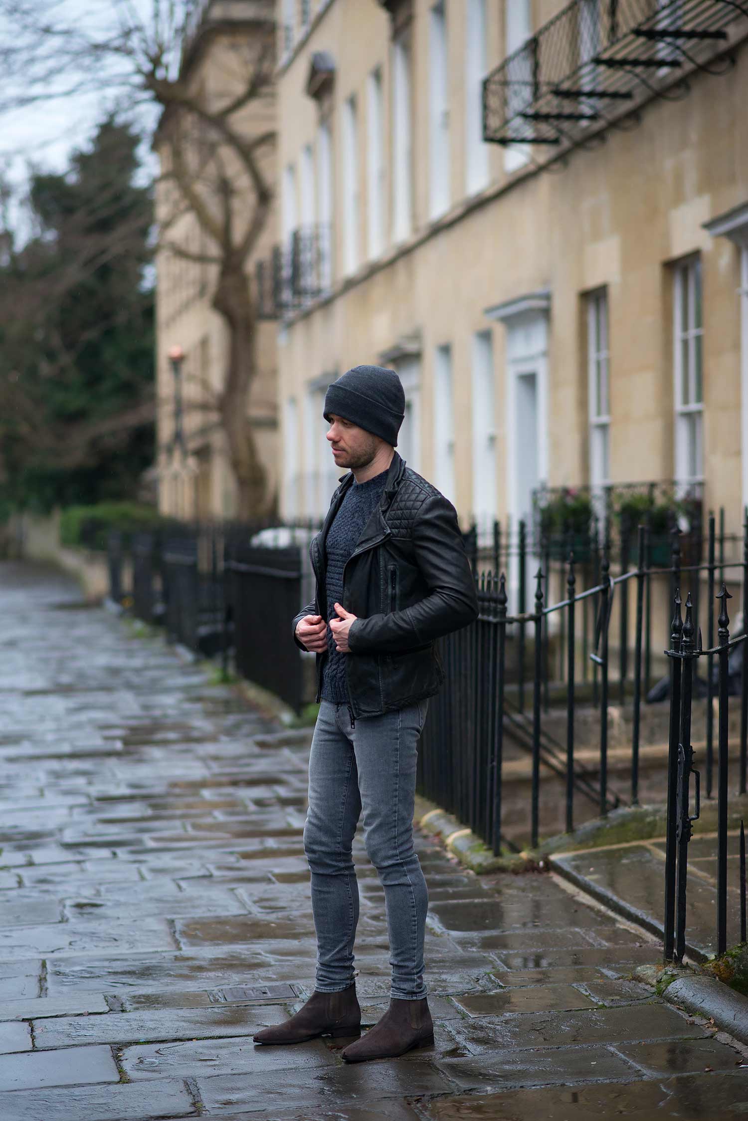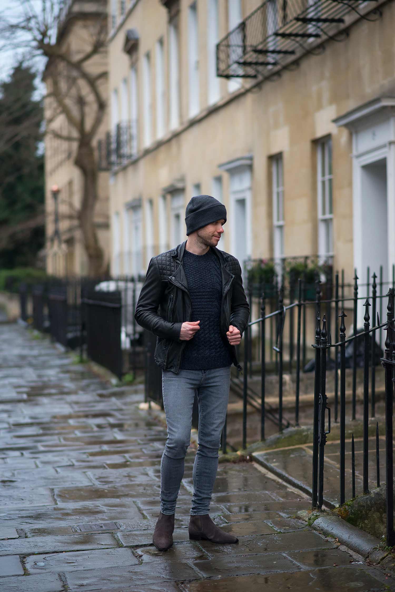 I chose to wear my Allsaints Cargo Biker Leather Jacket as I had been itching for another opportunity to wear it again since my review. I chose to style it with my favourite grey jeans of the moment, my women’s J Brand Maria High Rise Skinny Jeans in Dove which complement the worn black effect of the Allsaints jacket perfectly. Footwear wise, I slipped on my Kurt Geiger Baxter Chelsea Boots which I reviewed not long ago. Still deep in the depths of our winter seasons, I donned a warm hat and heavy duty knitted sweater from ASOS to complete the look.