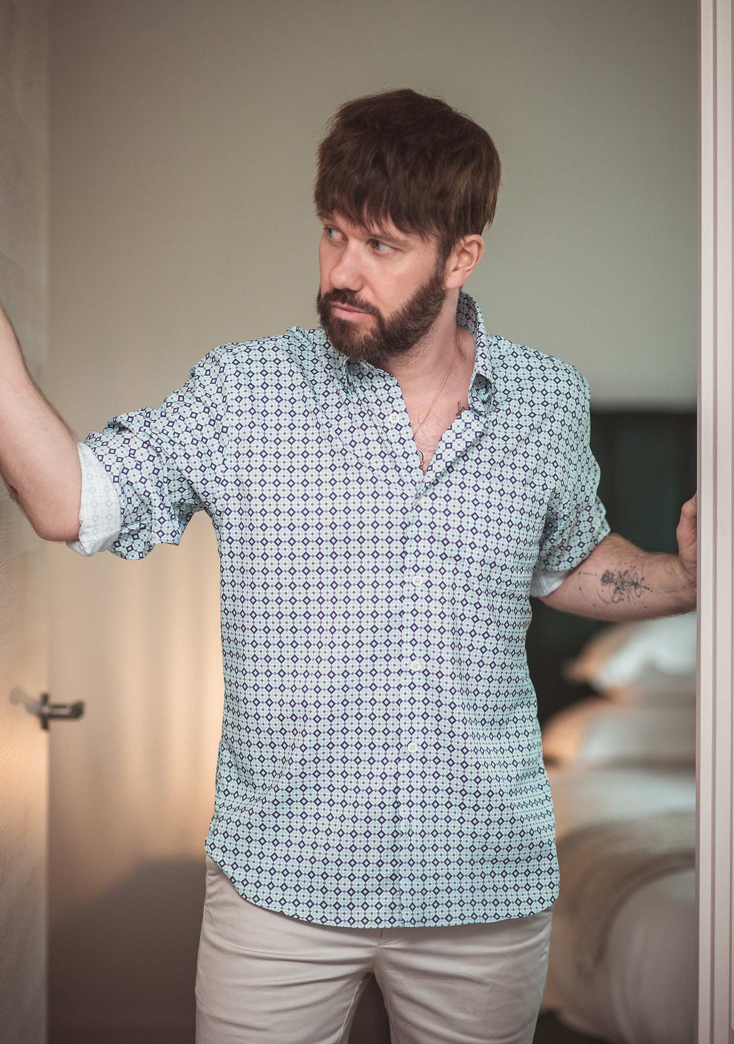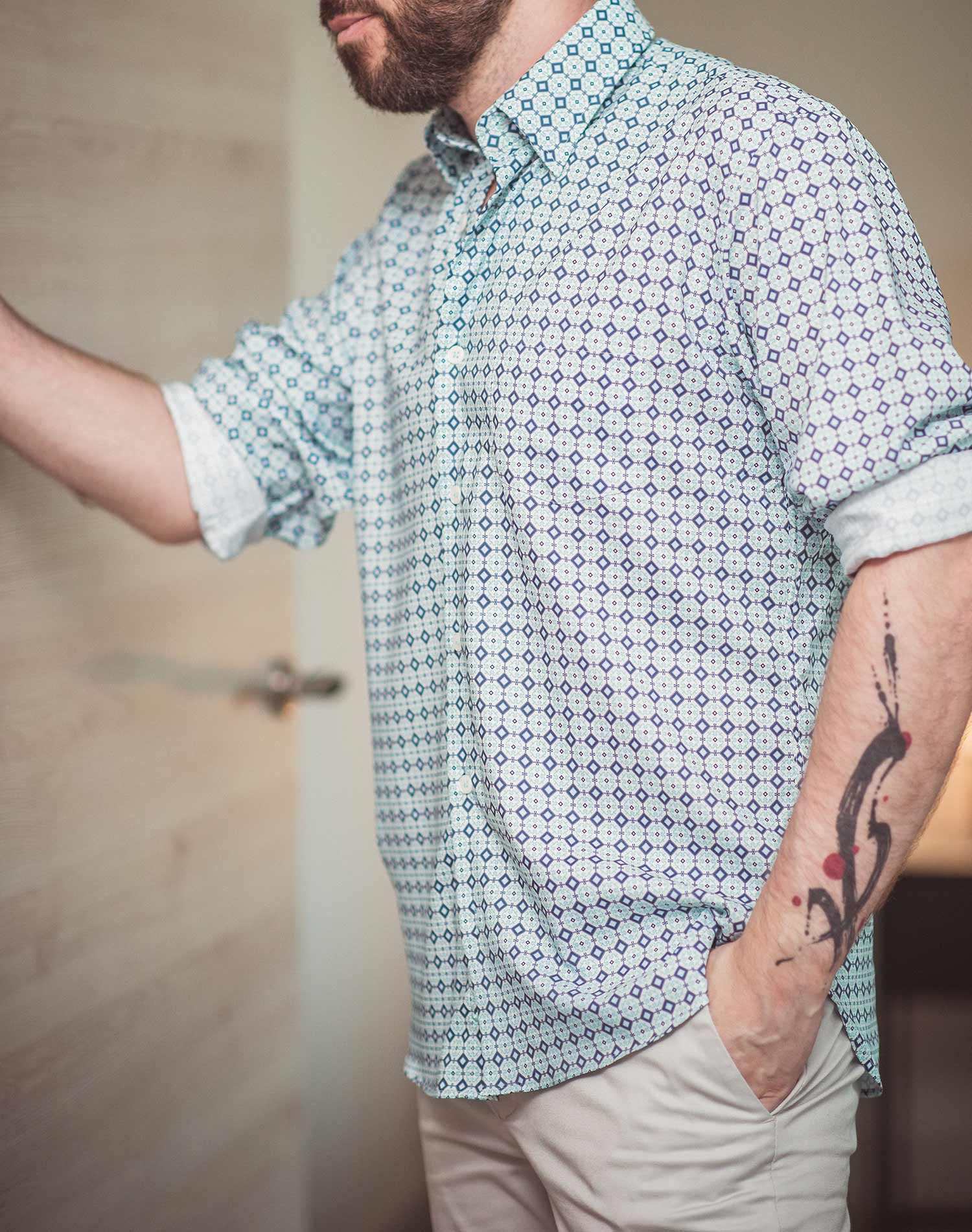 First out of the gate is a gorgeous teal-coloured shirt that features a diamond monogram design across the fabric in contrasting blue – a perfect style for that upcoming holiday by the sea, ready for that evening beach stroll.