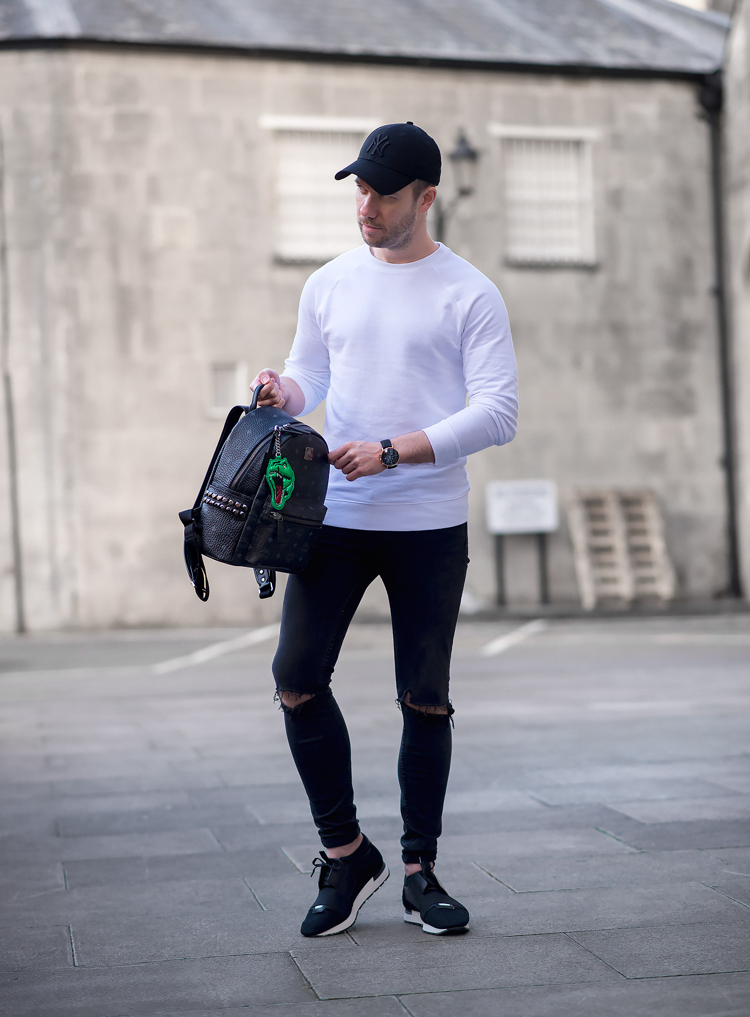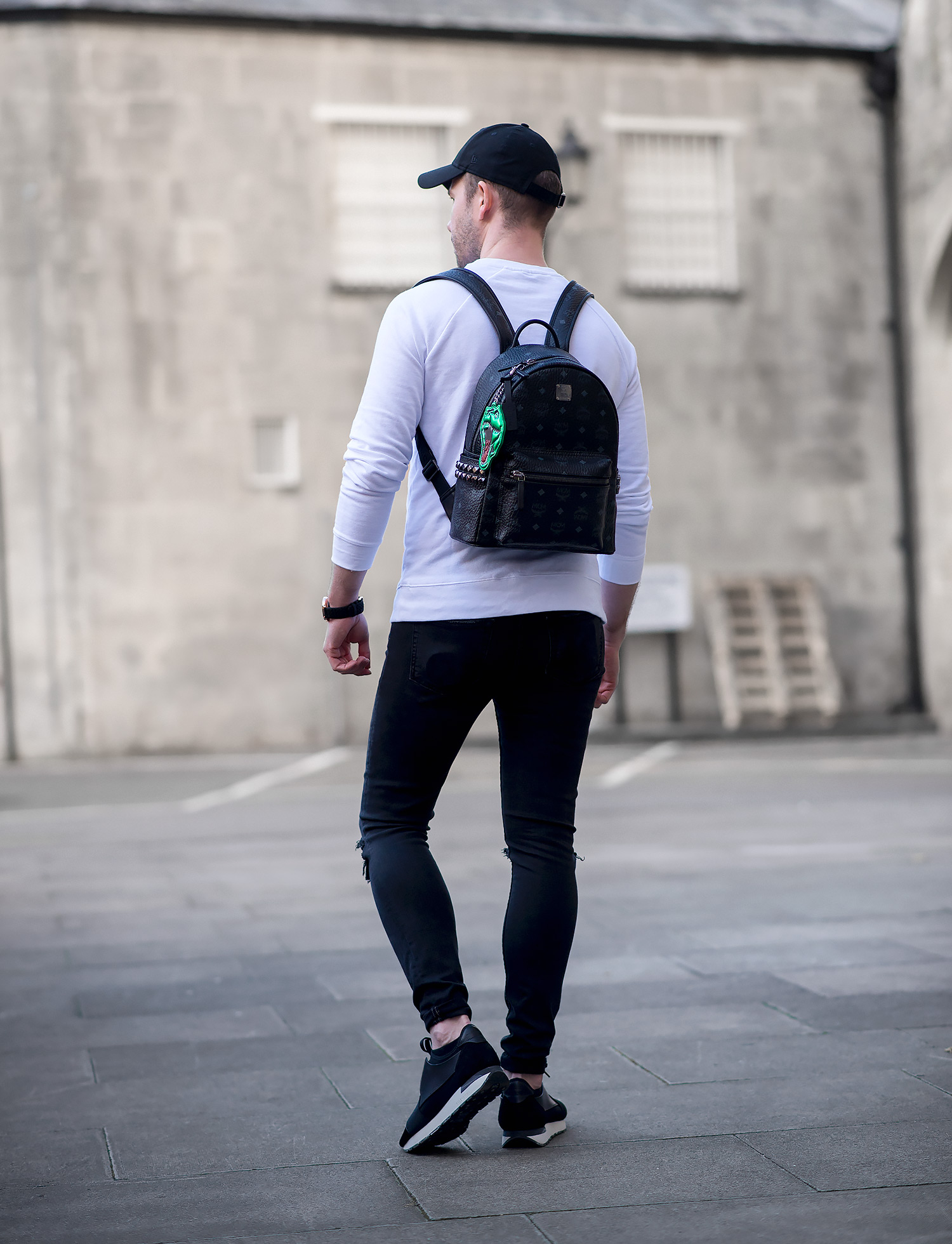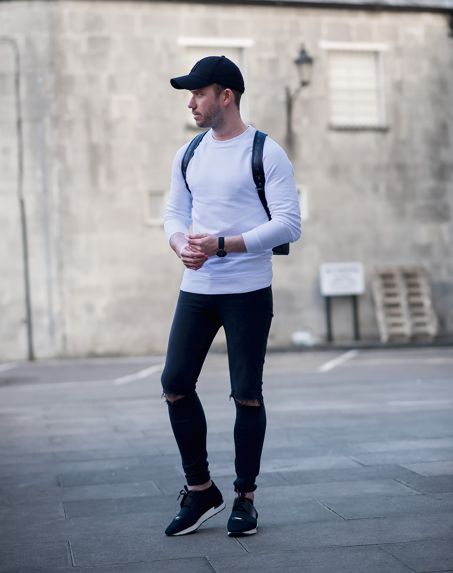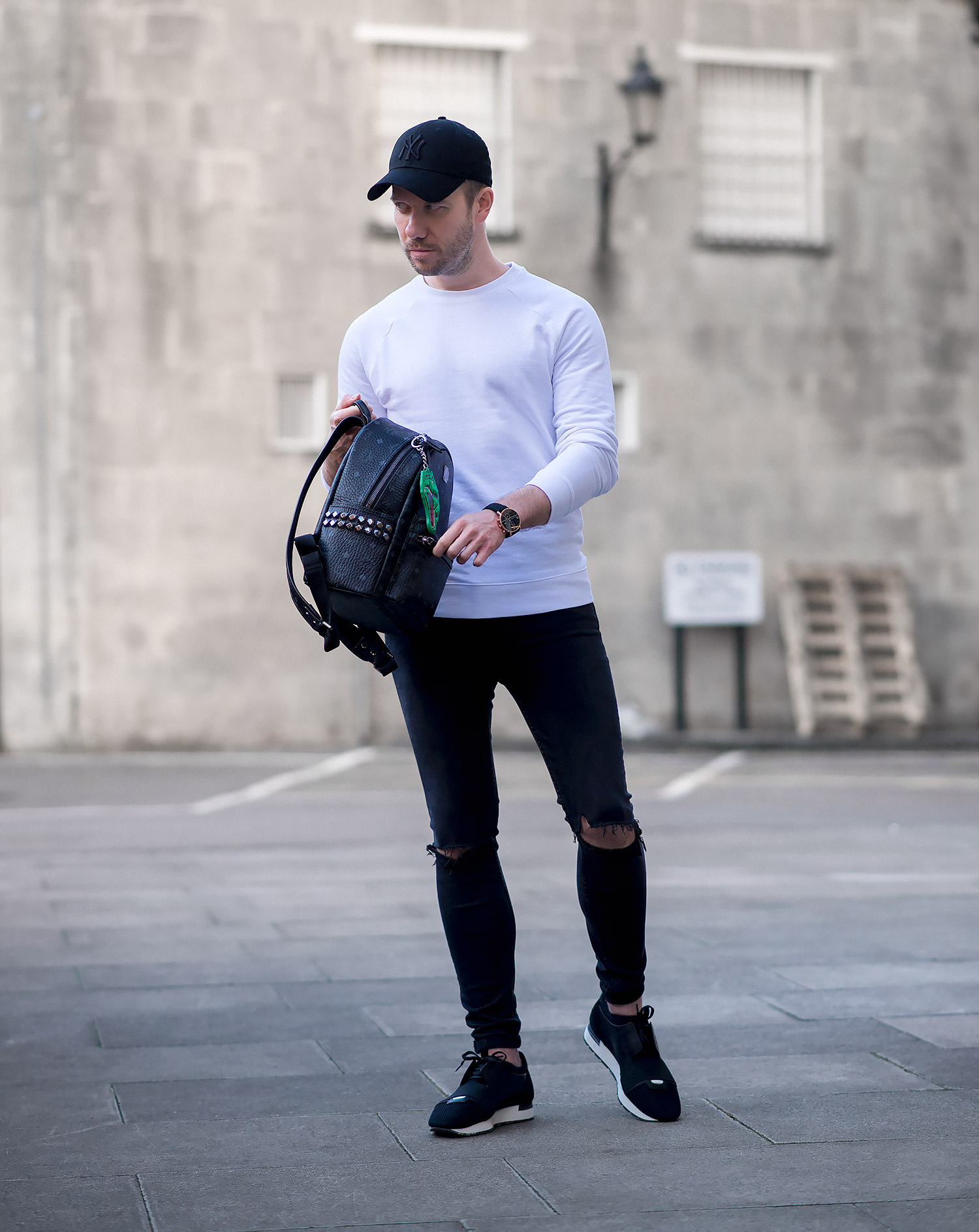 I decided to wear simple black and white colours to ensure the accessories were the star of the show. Choosing my ASOS white sweatshirt, paired with my GRLFRND Candice Ripped black Super Skinny Jeans (reviewed here) which I wear way too often, but thanks to their super soft stretchy construction and timeless style it’s not surprising they get regular outings. Footwear choice was my Balenciaga Black Race Runners which complemented the monochrome effect I was aiming for. Even my New Era Baseball Cap and Kapten & Son Woven Watch were picked for their dark colour palette.