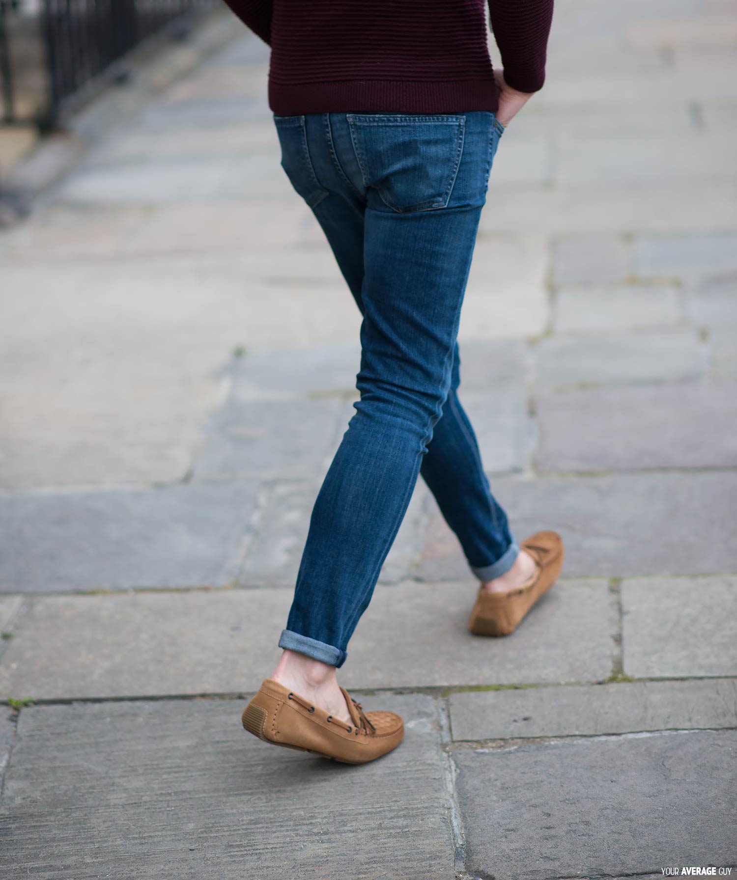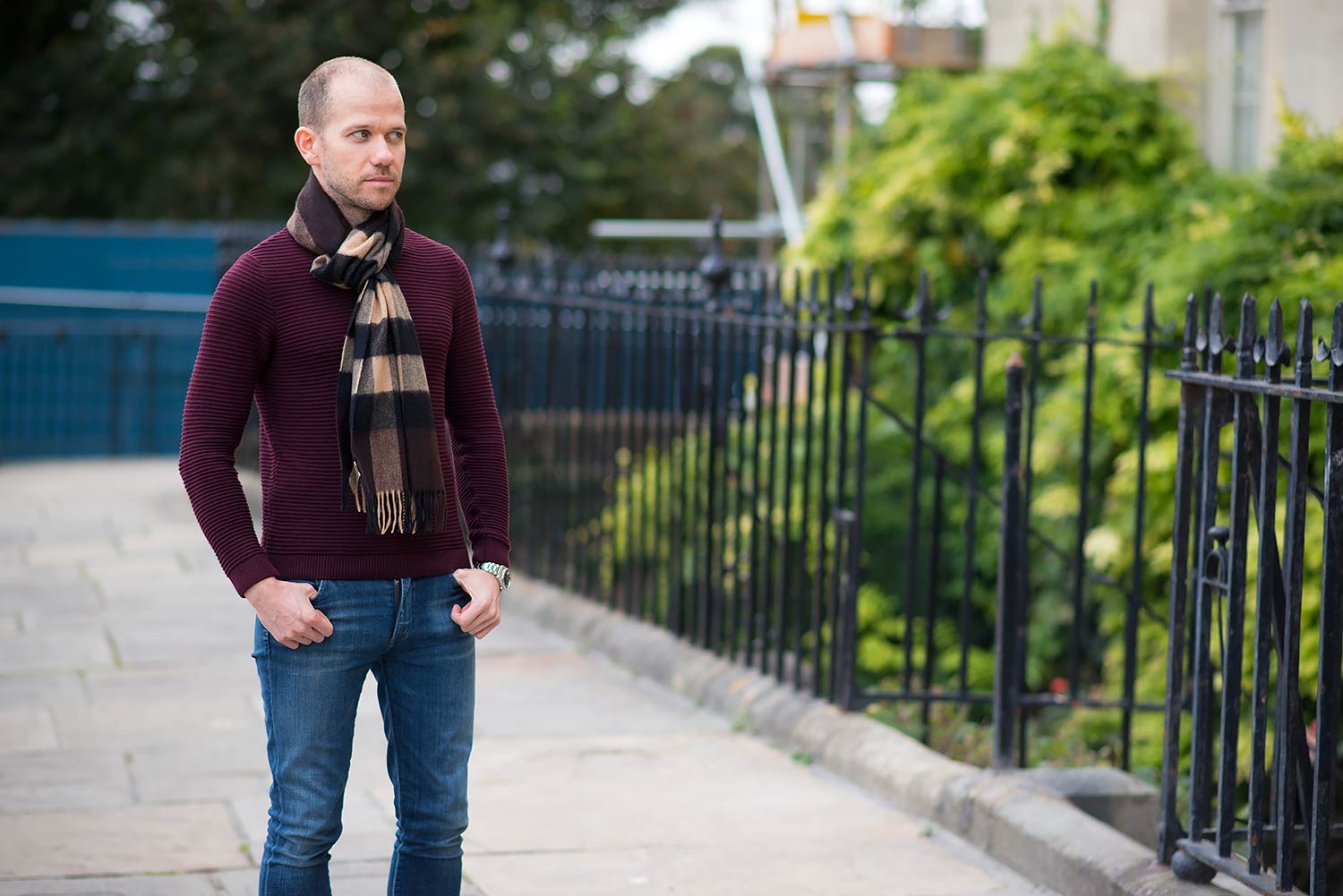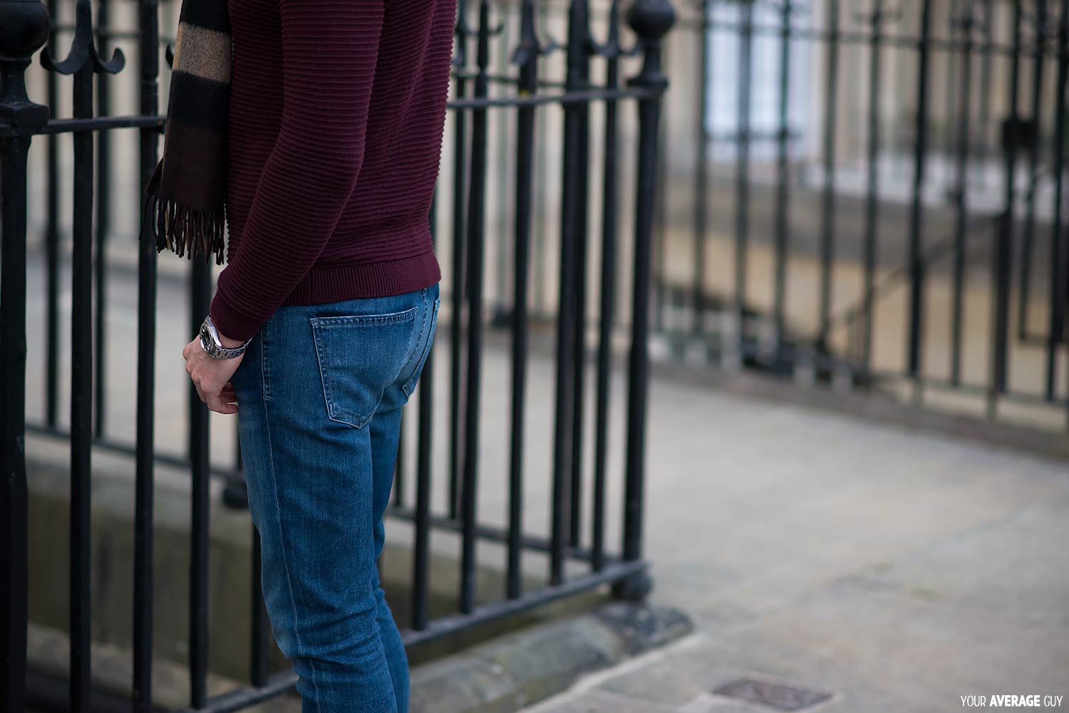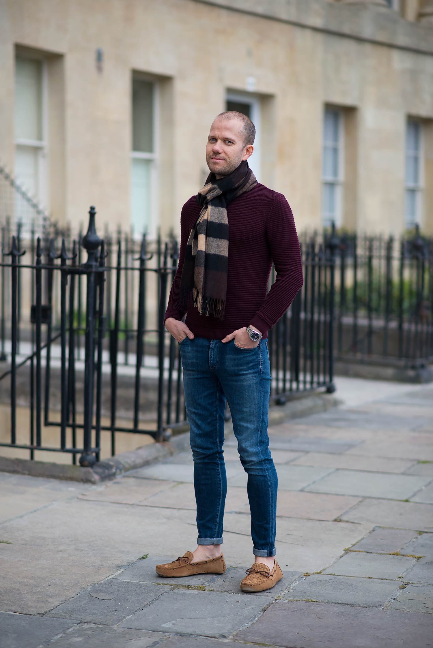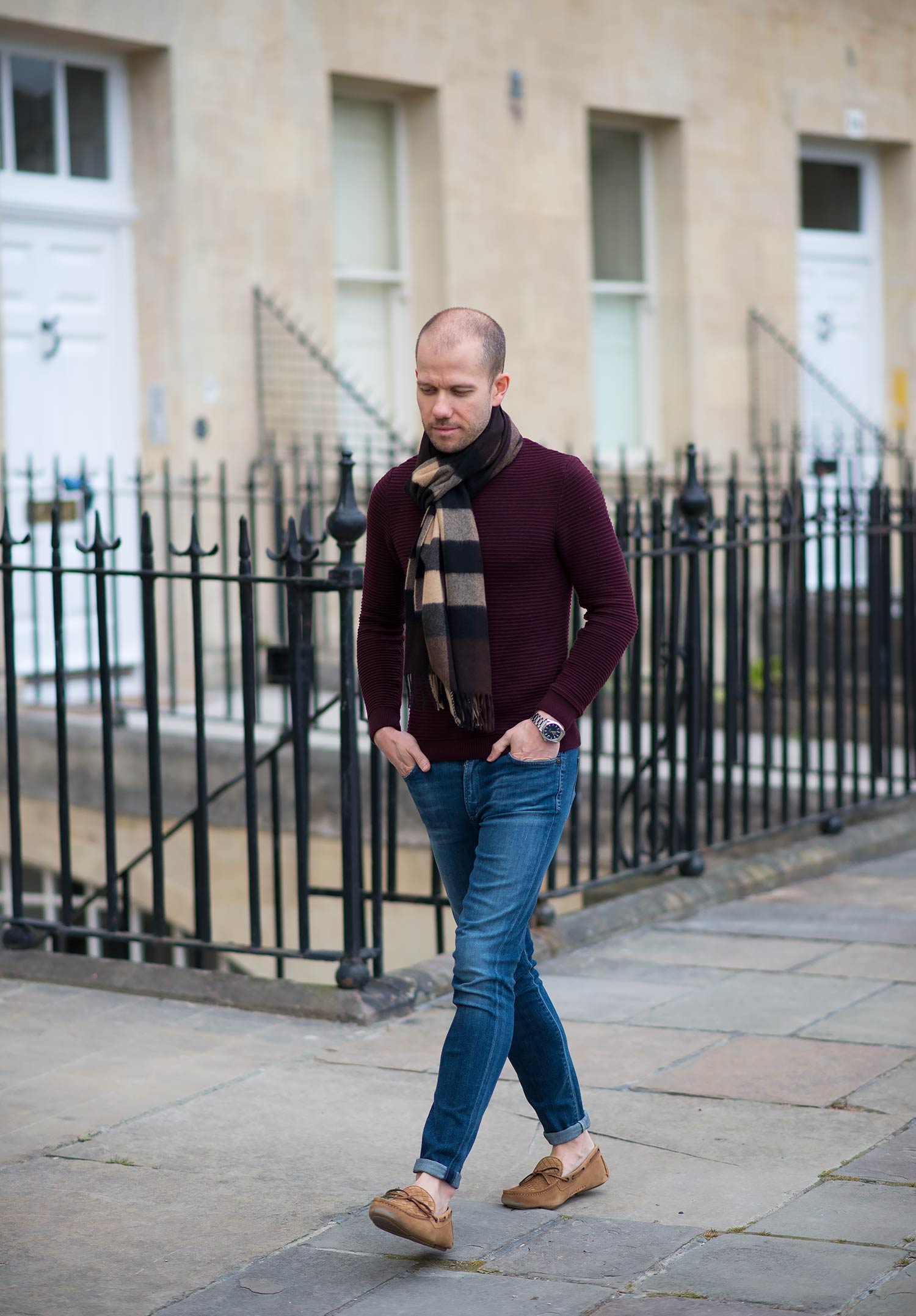 I completed the outfit with a burgundy ribbed jumper from Topman which I acquired last year, a Burberry Scarf In Dark Chestnut, and once again wore a pair of women’s skinny jeans from Citizens Of Humanity. These are the same cut I wore previously, just in a much darker wash called Byron Bay. Please let me know what you think of this look, especially the shoes in the comments below.