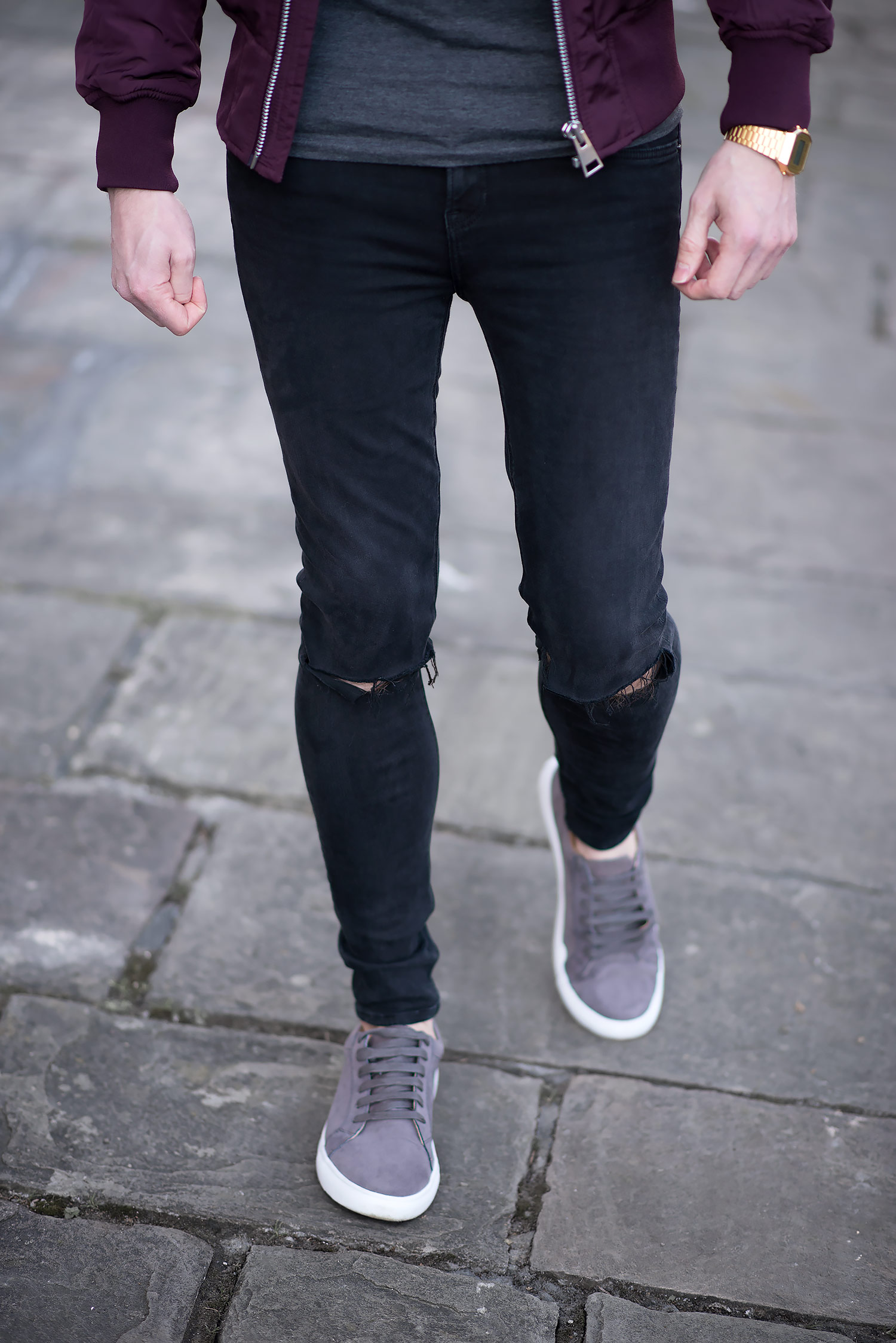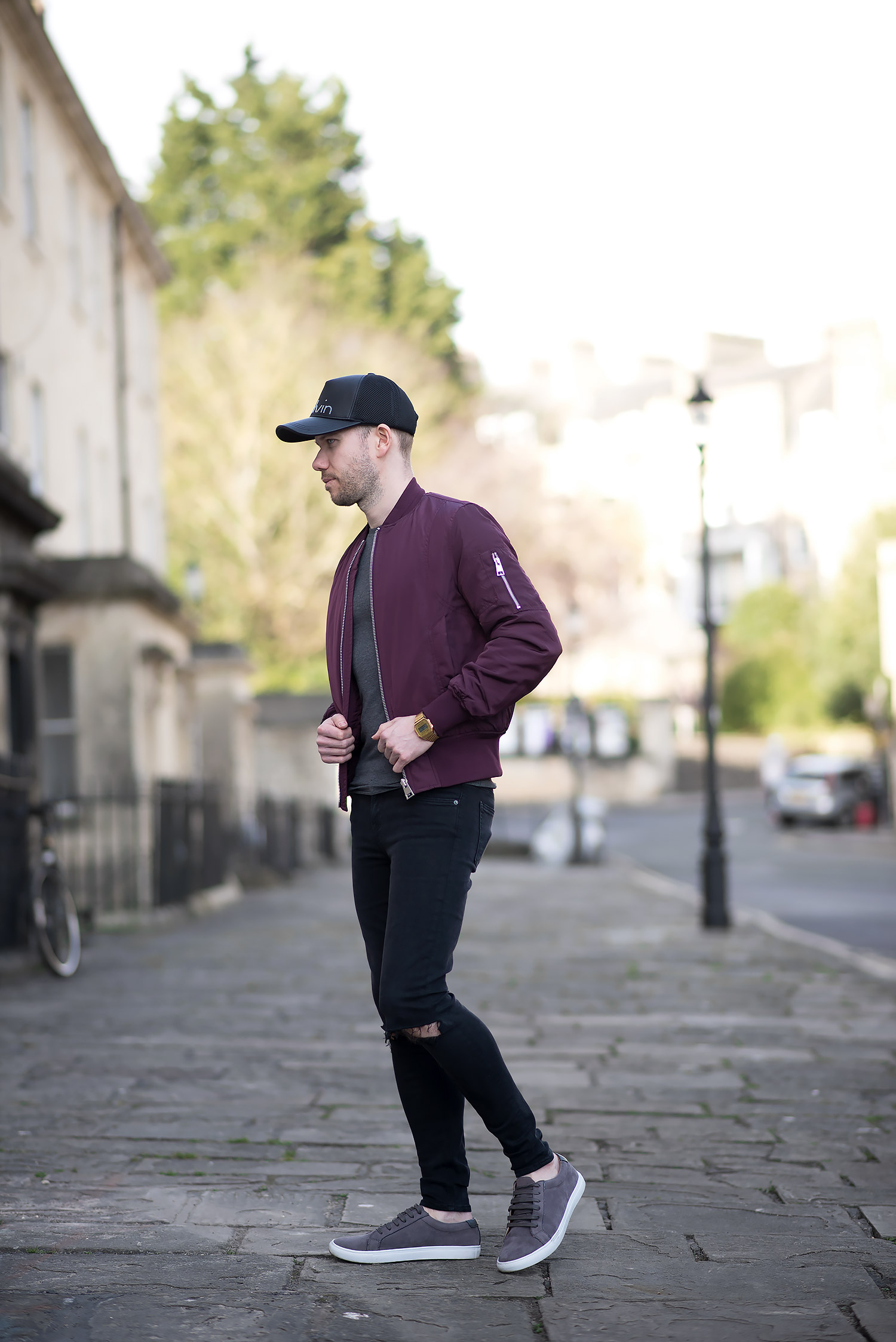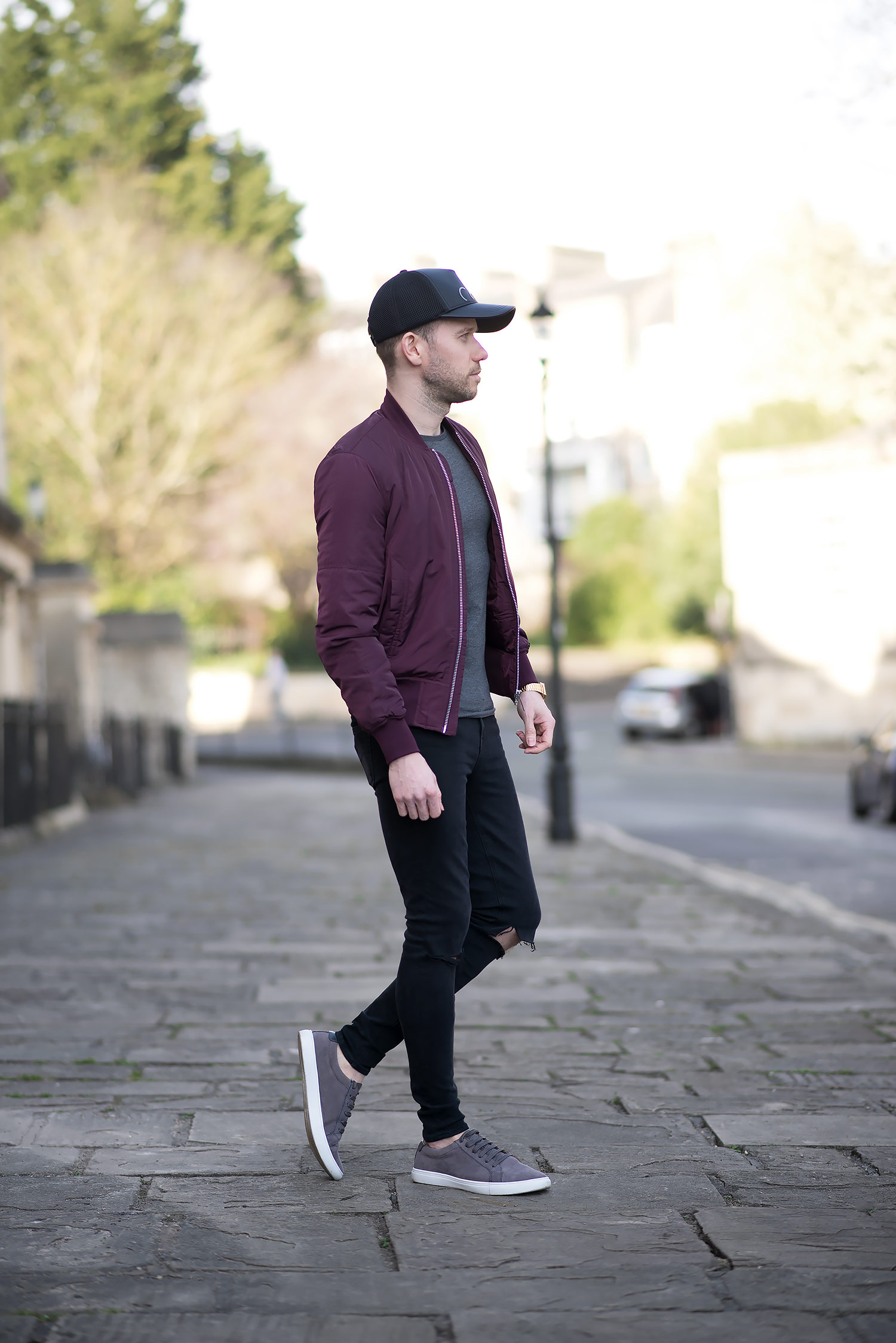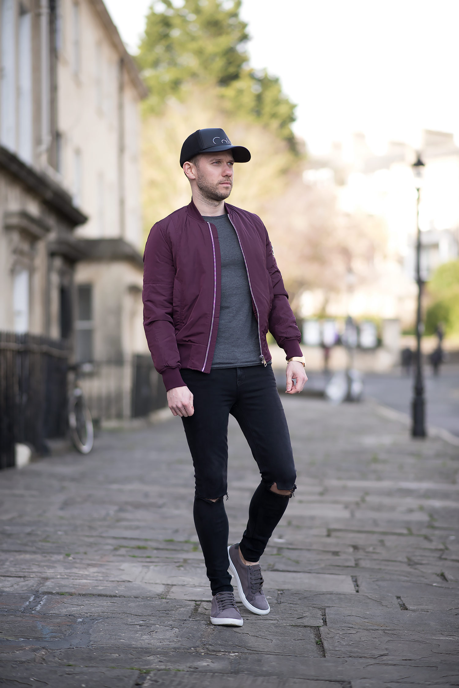 I teamed my baseball cap with an ASOS Bomber Jacket With MA1 Pocket In Burgundy to add a pop of colour to the otherwise dark outfit. My chosen denim was the GRLFRND ripped black skinny jeans (a personal favourite of mine, which I wore in a previous outfit). The finishing touch was a pair of Grey Faux Suede Trainers, giving just enough distinction from the pitch black denim.