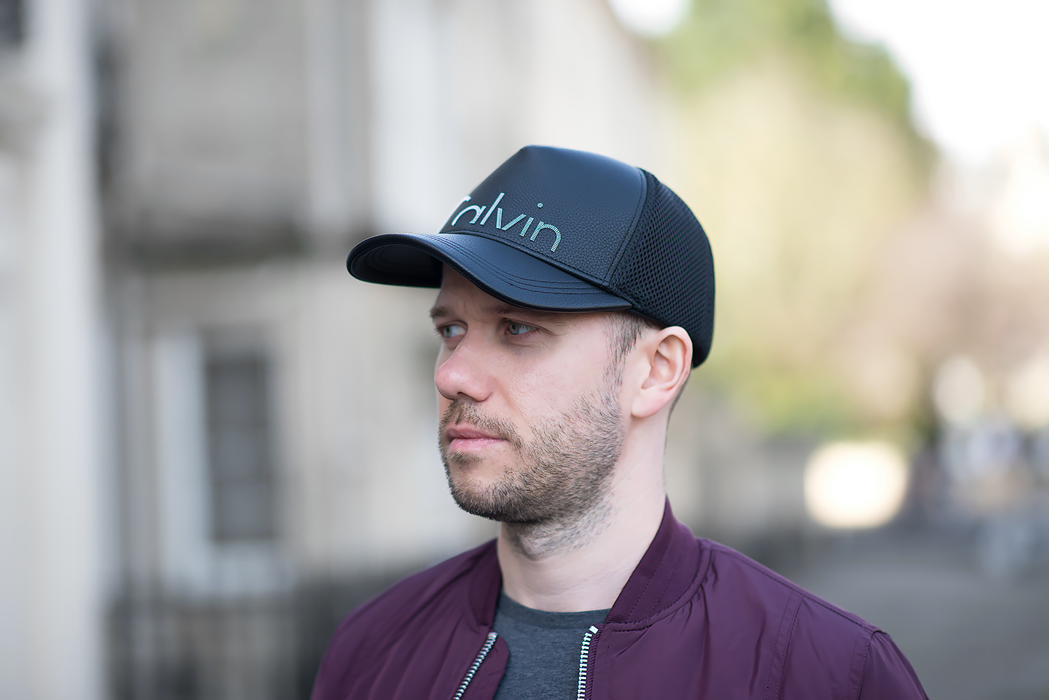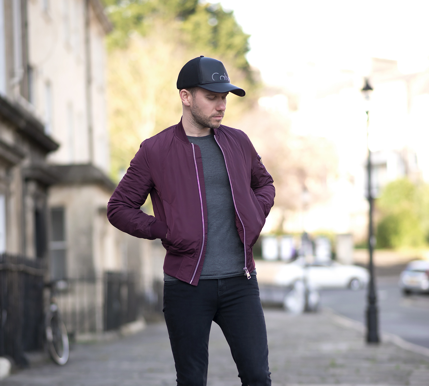 Calvin Klein Baseball Cap And Burgundy Bomber Jacket Outfit