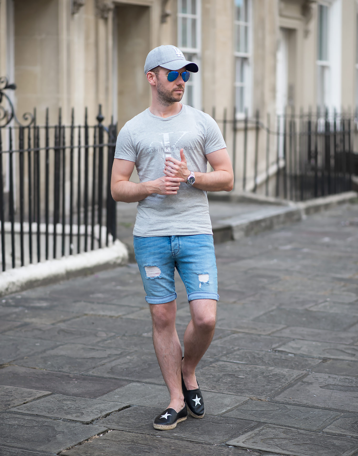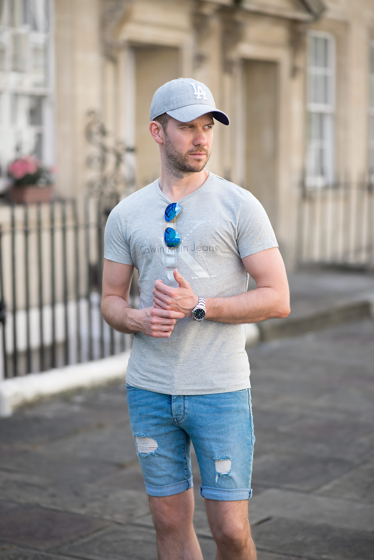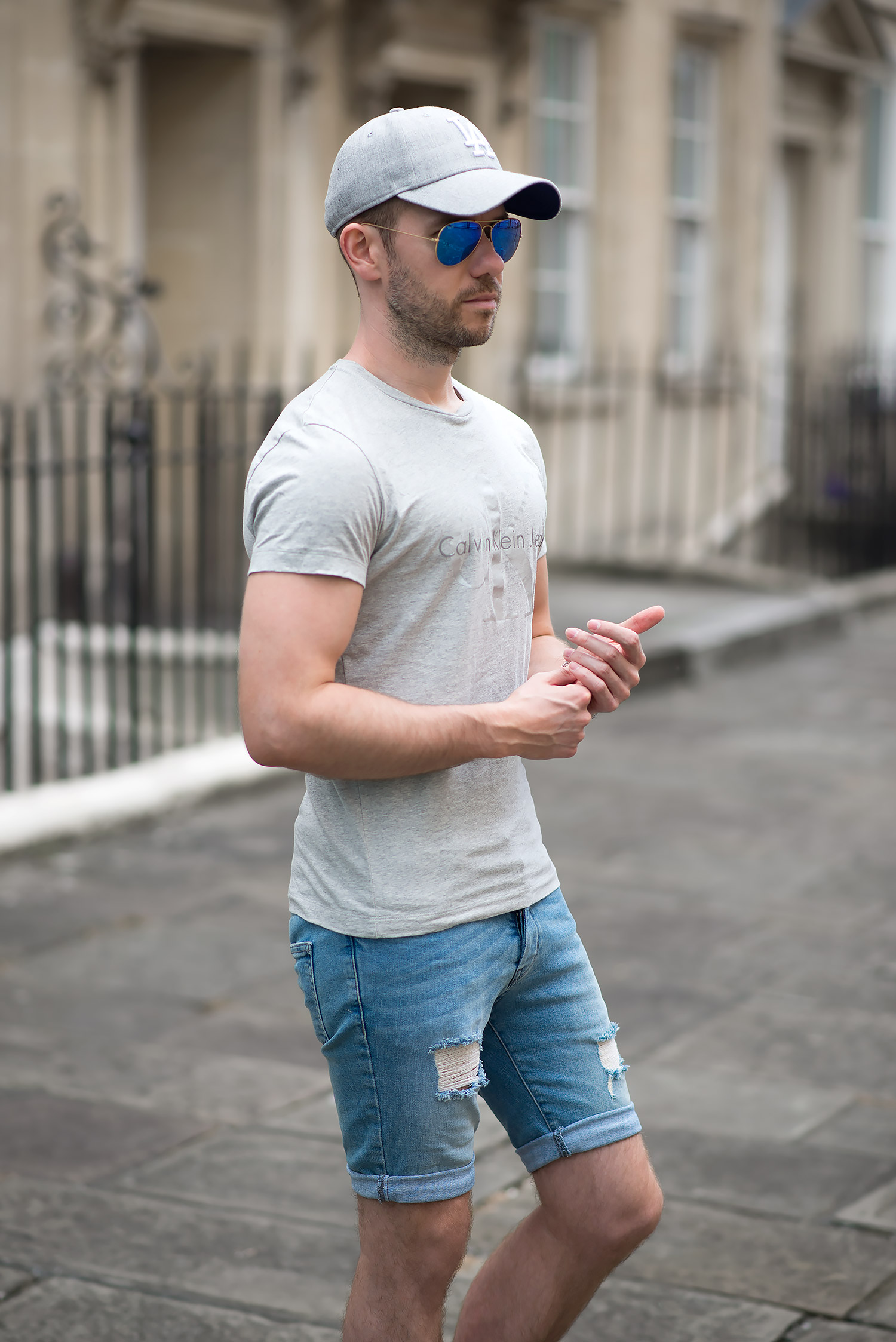 I teamed up this new acquisition with a Calvin Klein Reflective Logo T Shirt in a light grey marl featuring their classic logo across the chest, but in a muted off white colour (which has a touch of sparkle when looking close). For the rest of the outfit I picked my which I reviewed previously and a grey cap (purchased on the day of the shoot, popped into Topshop and was greeted with a wonderful textured grey with the logo in a padded white). Of course as it was a bright sunny day, I came armed with a pair of trusty Ray-Ban Aviators with reflective blue lenses.