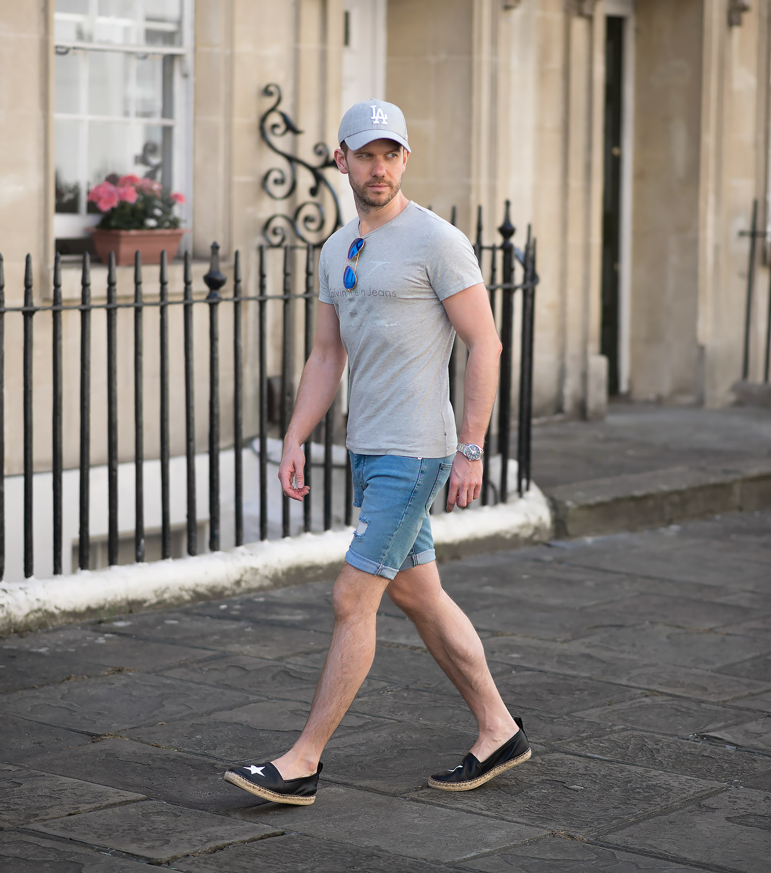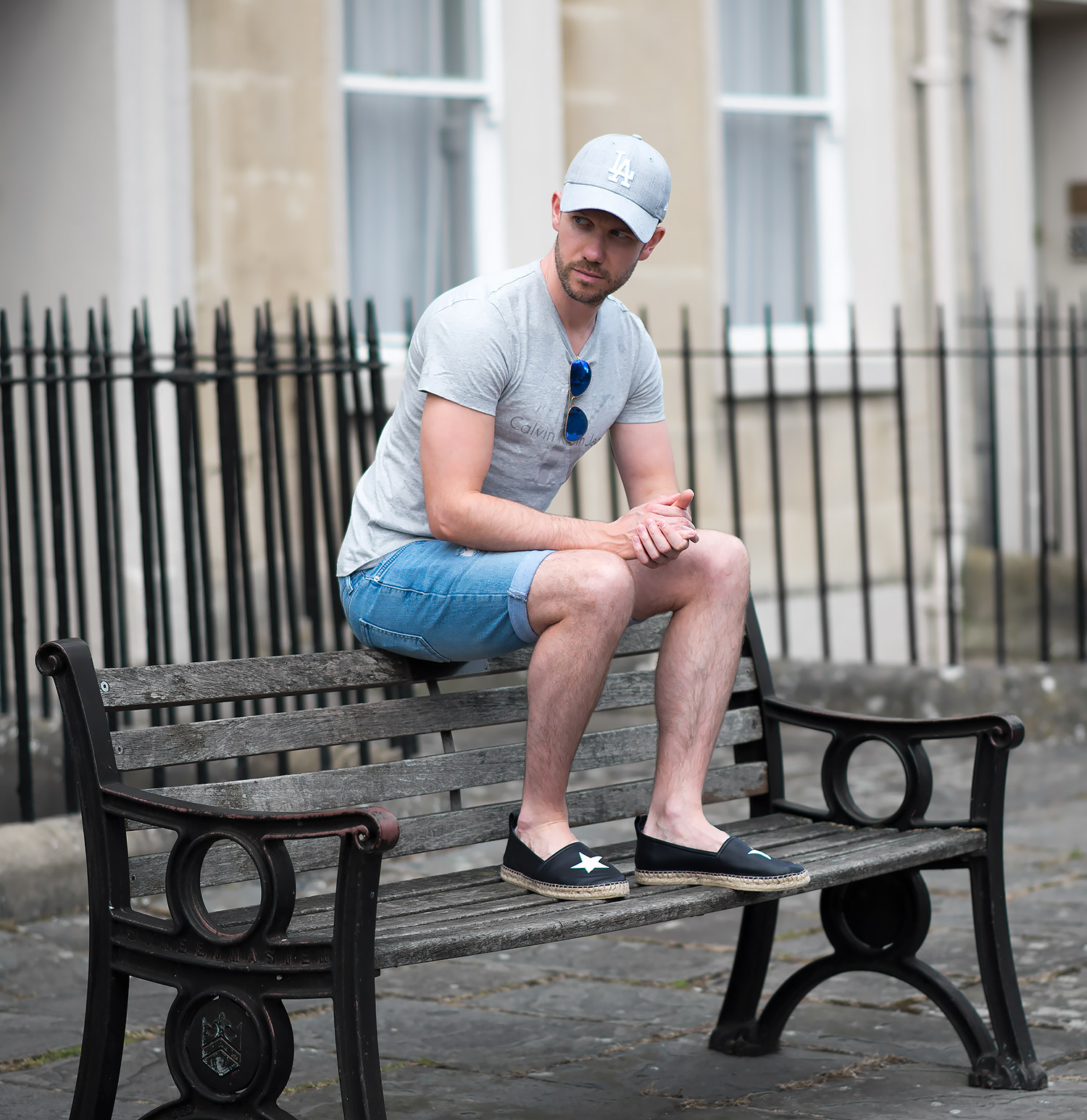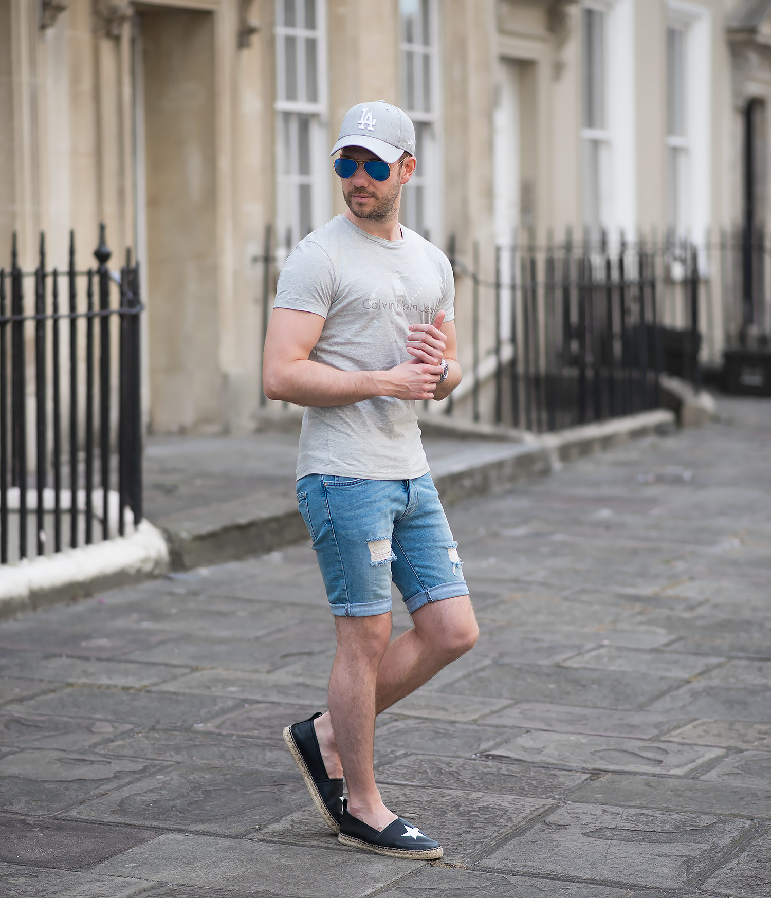 I teamed up this new acquisition with a Calvin Klein Reflective Logo T Shirt in a light grey marl featuring their classic logo across the chest, but in a muted off white colour (which has a touch of sparkle when looking close). For the rest of the outfit I picked my which I reviewed previously and a grey cap (purchased on the day of the shoot, popped into Topshop and was greeted with a wonderful textured grey with the logo in a padded white). Of course as it was a bright sunny day, I came armed with a pair of trusty Ray-Ban Aviators with reflective blue lenses.