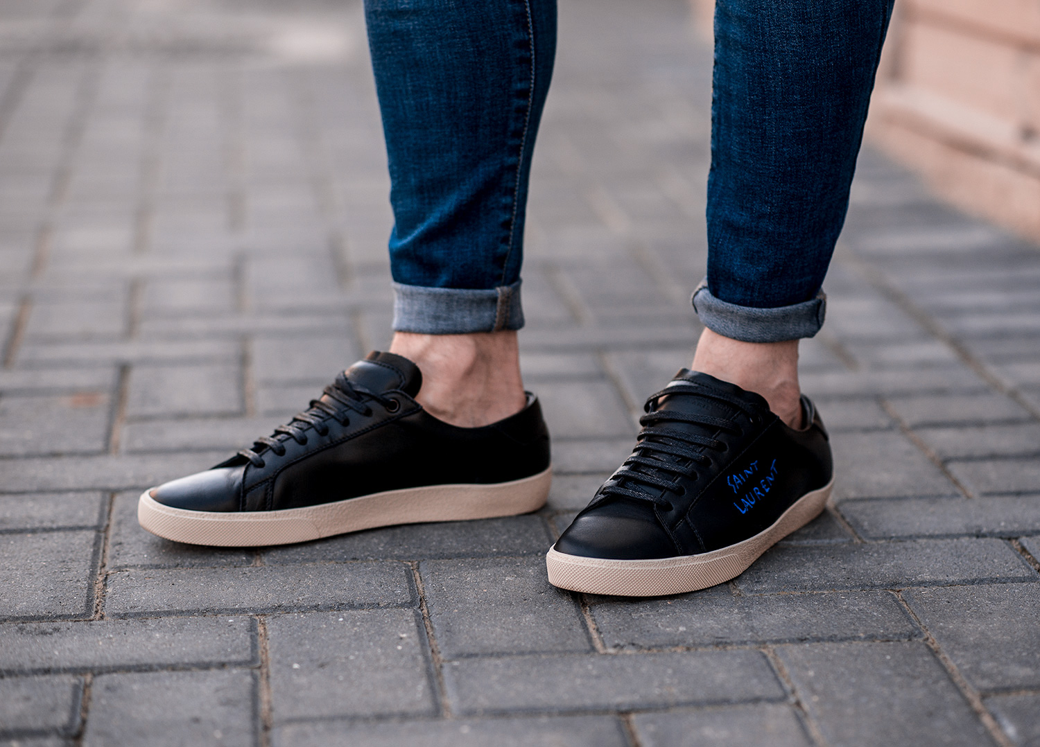 I wore my new Saint Laurent Court Classics Sneakers in Black Leather with Blue Metallic Embroidery for their 2nd outing (following my previous summer outfit) and I am still deeply in love with them! The blue text was the perfect match for the blue logo on the T-Shirt. I completed the looking with another of my New Era Caps (sparkling white!) and my Ray Ban Aviator sunglasses with brown tinted lenses.
