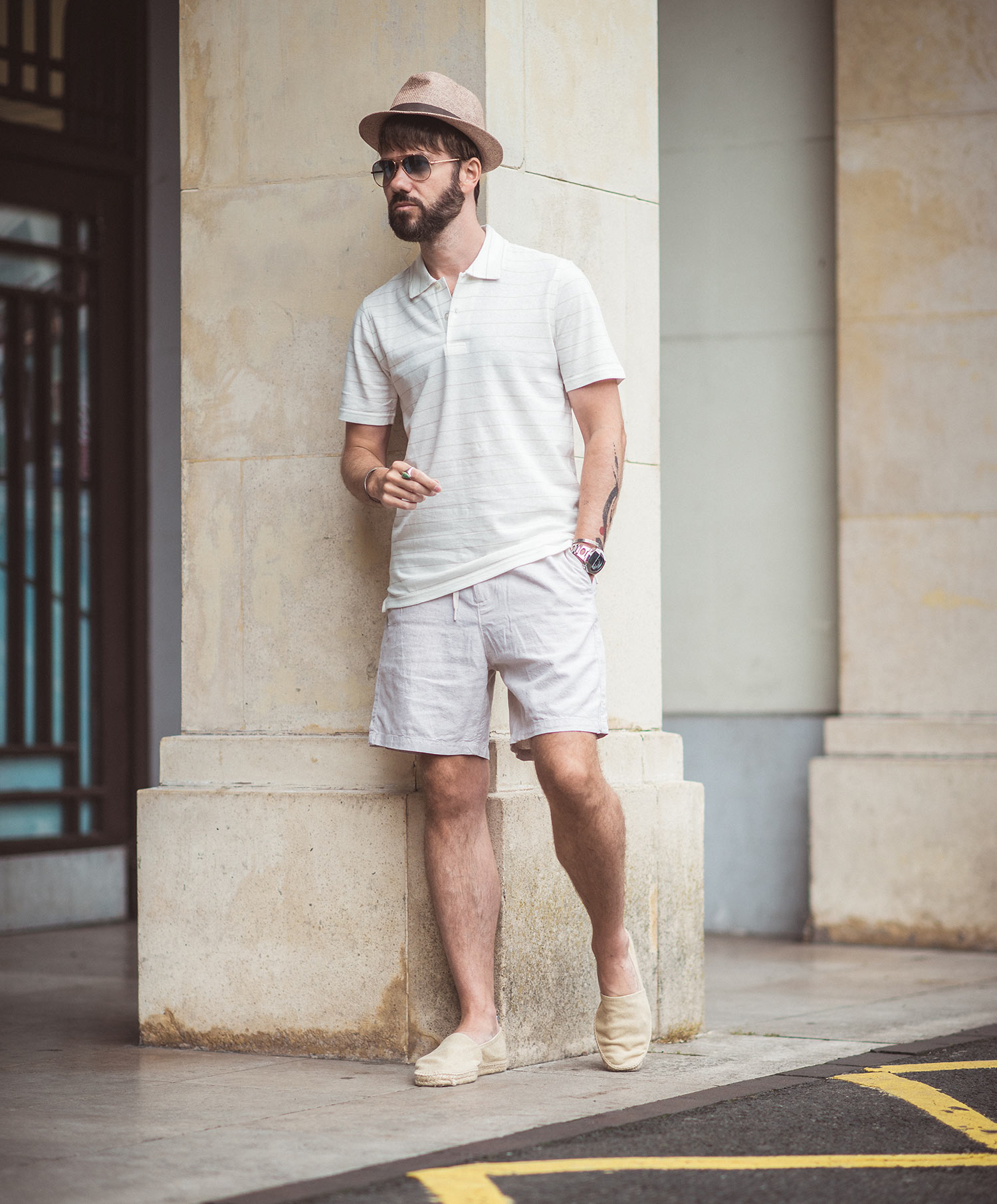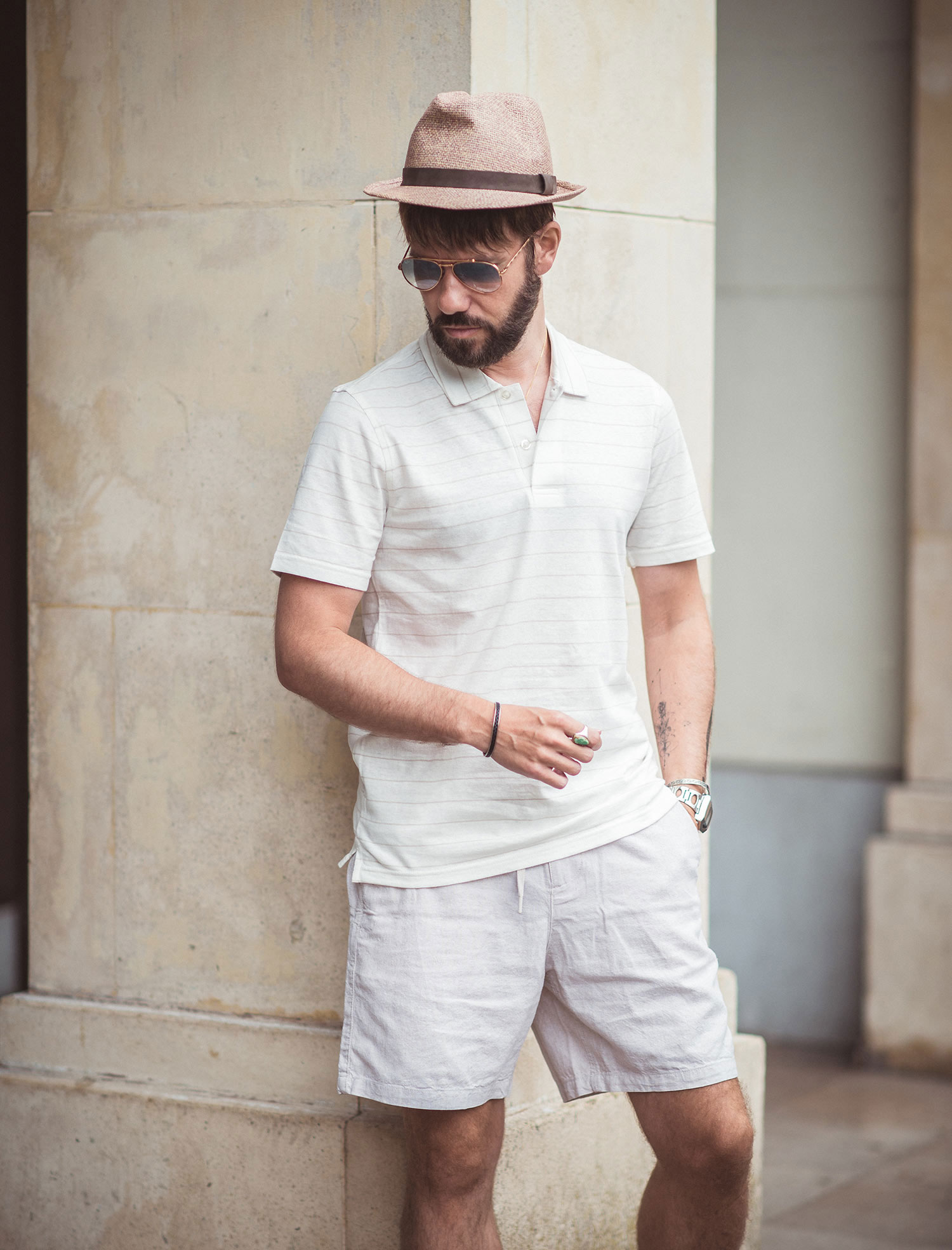 For my outfit, I paired the polo with a pair of light grey linen shorts (in a regular fit, complementing the top’s slimmer fit) and a pair of stone espadrilles (the ideal summer footwear, especially during those evening strolls). I completed the ensemble with a straw-style hat in a light brown and added a sprinkling of accessories – a watch, rings and bracelets.