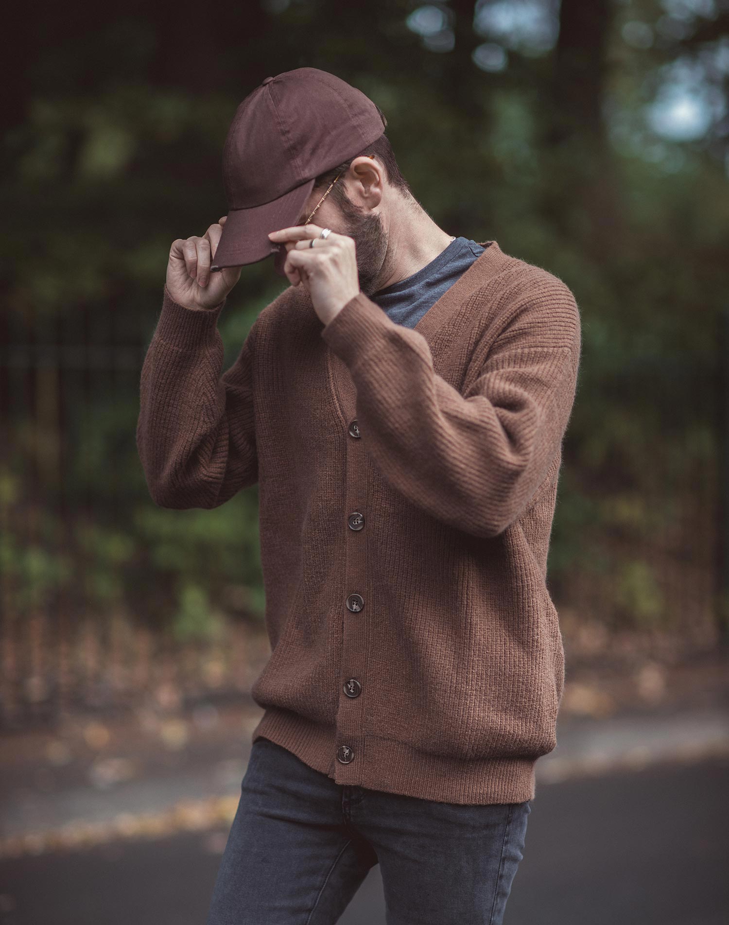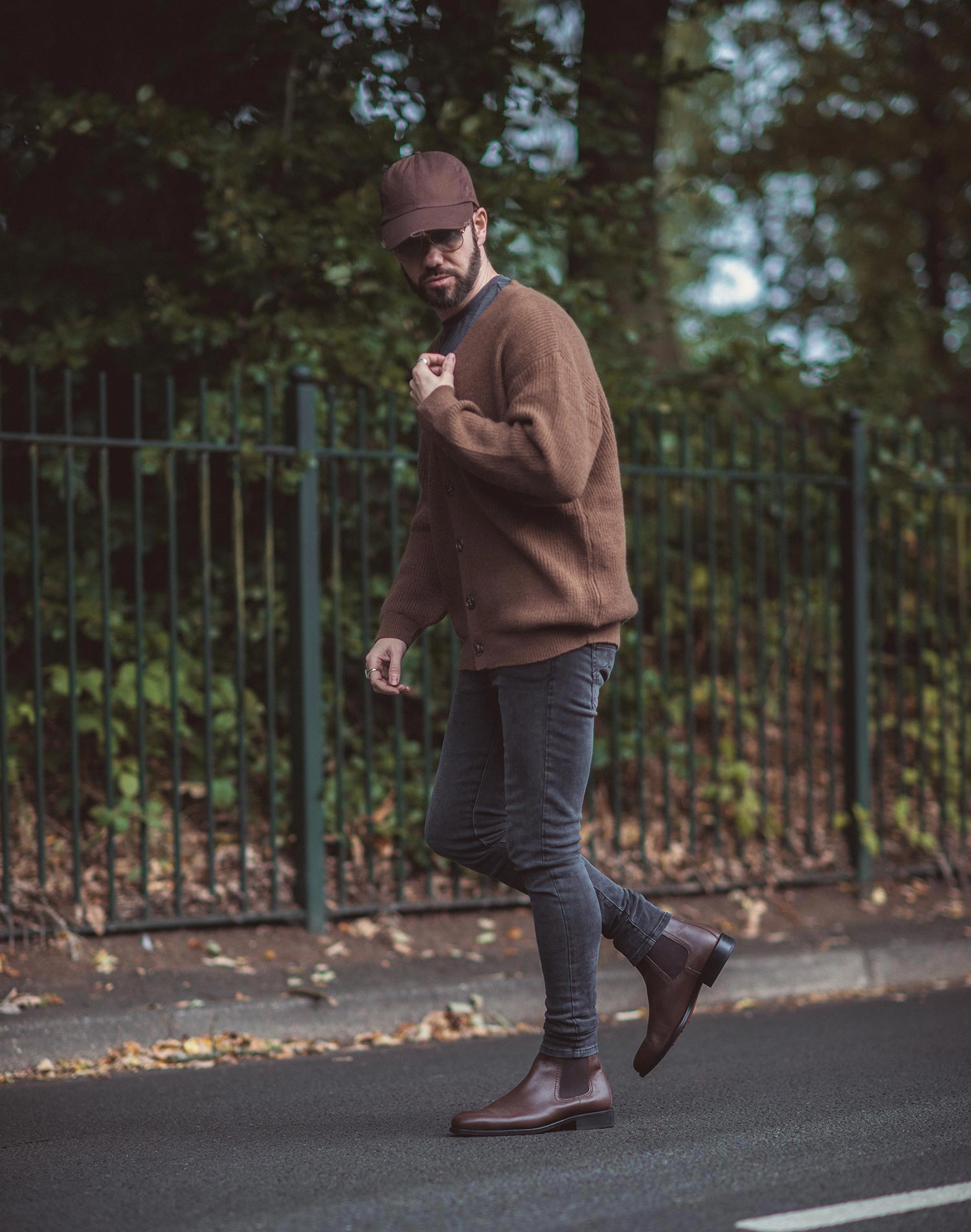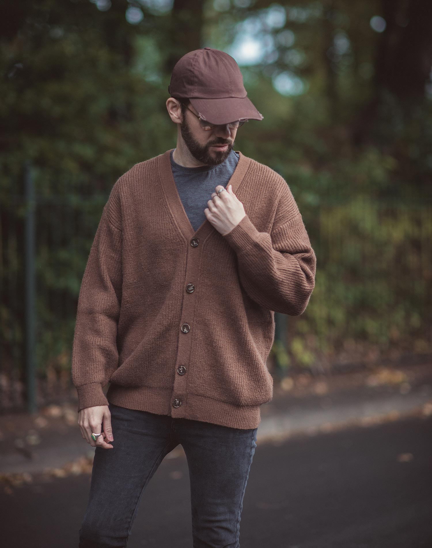 My look was completed with a number of accessories – a baseball cap in brown with distressed edges, brown aviators (my go-to style of shades), rings and a bracelet (from Marco Dal Maso).