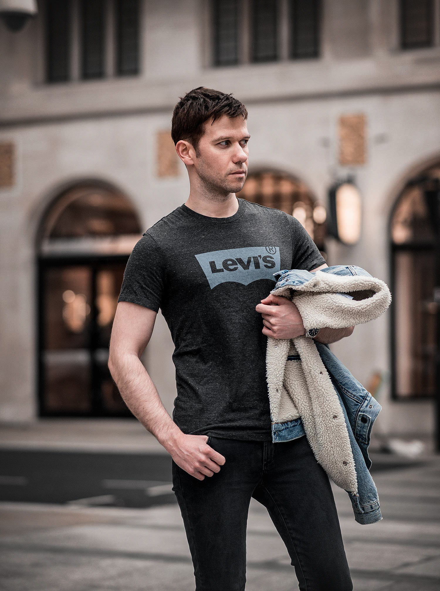 Although we are in the midst of winter and yes it is cold, the temperature wasn’t as critically low as the previous days to the shoot. Originally we began taking photos with me wearing the jacket, but it wasn’t looking quite right, making me look quite bulky in all the wrong places! I suggested holding the jacket, for that casual look which many go for in street style photos, which in my opinion turned out much better! Fortunately, it didn’t take us long to get the required shots as nearly all of the pedestrians were too busy concerned with their own lives to pay much attention to our photography exploits. It was lucky we managed to get them completed in quick time, minutes after the final click the weather took a turn for the worse and rain began to fall heavily around us! We took quick shelter in some of the nearby designer shops (which can be dangerous to the wallet!).