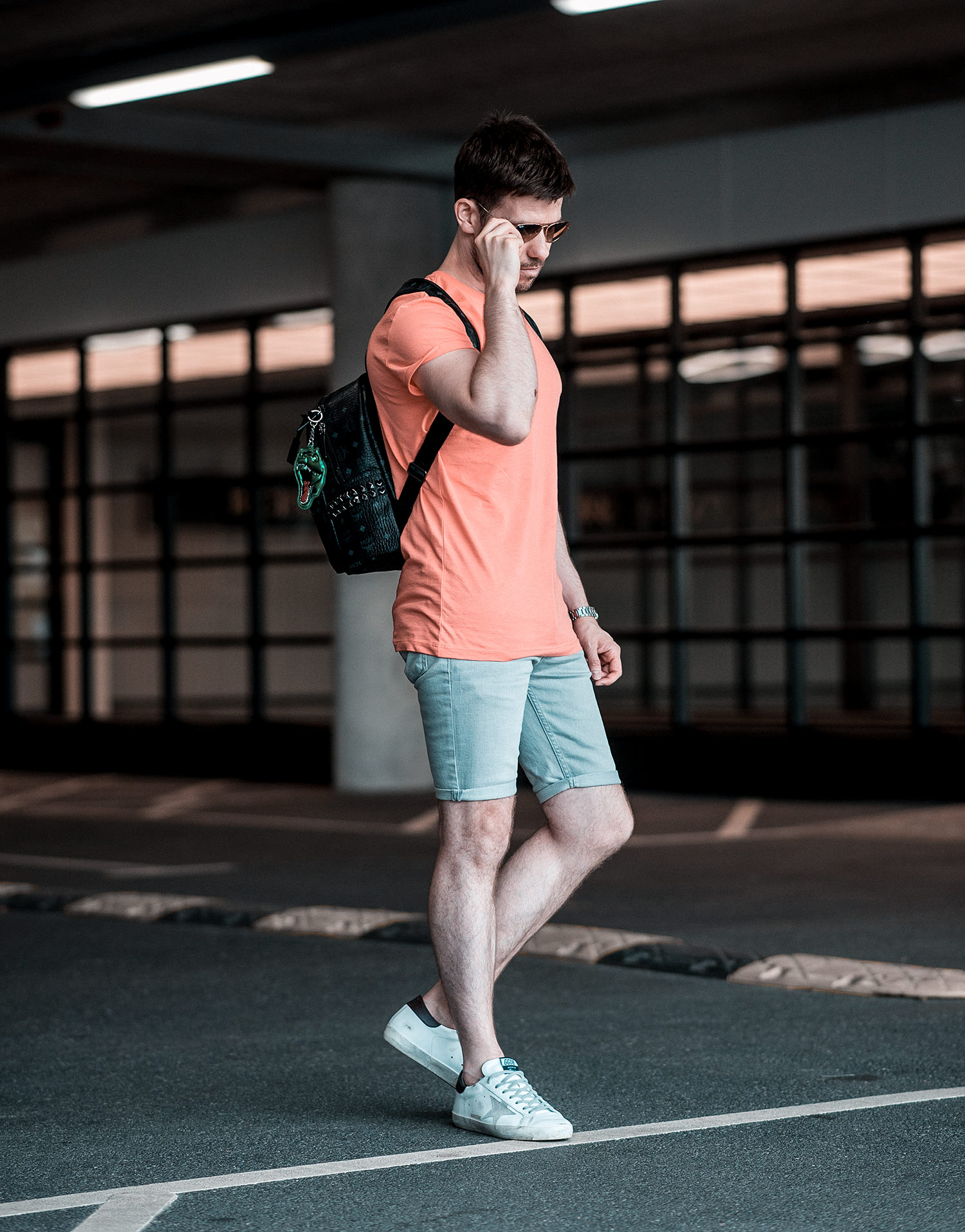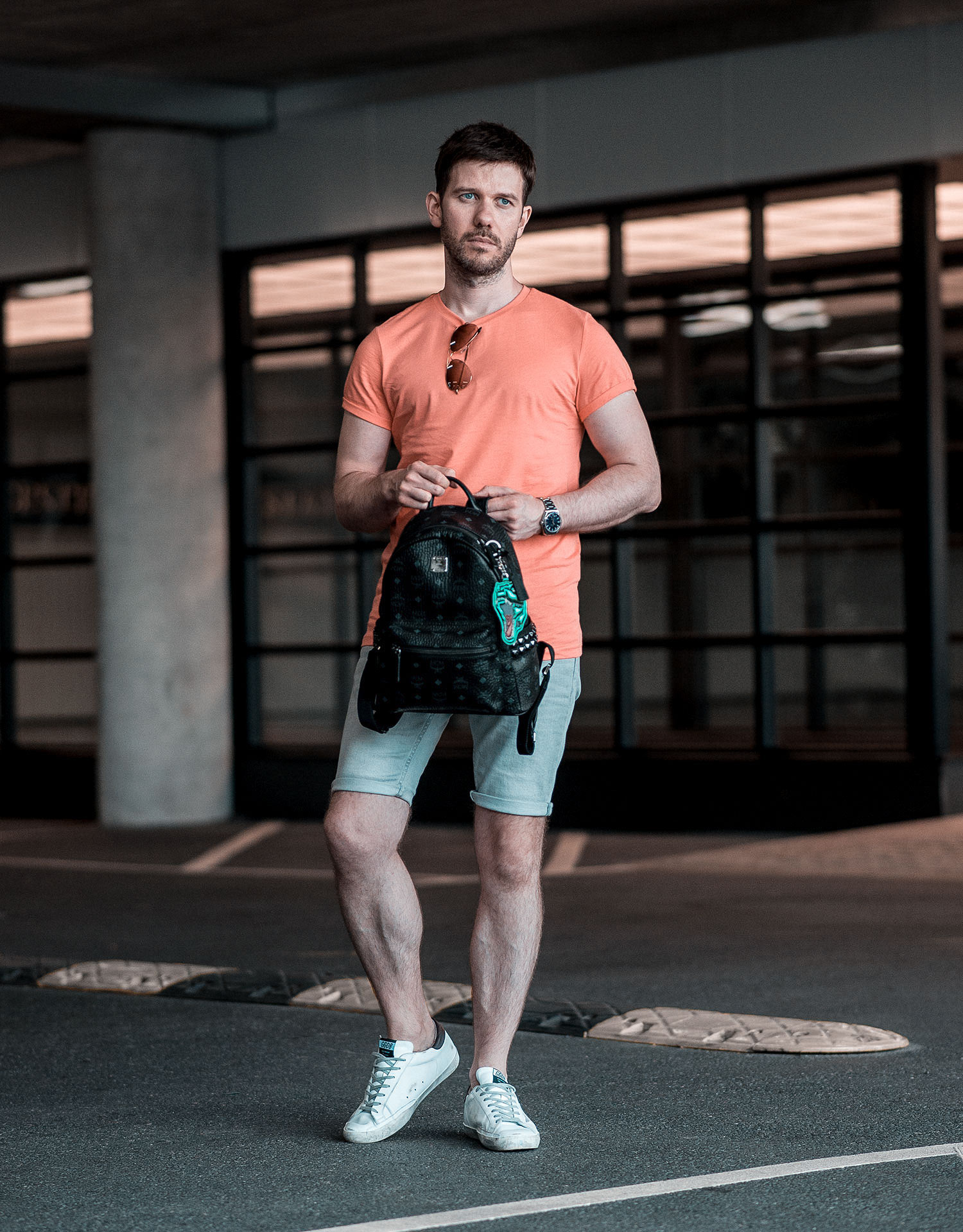 My chosen outfit complemented the hot weather, opting for a vibrant, almost fluorescent orange T-Shirt from ASOS, paired with a pair of skinny denim jeans from Topman. My choice of footwear was my Golden Goose Sneakers, which was ideal for busy travelling thanks to its pre-distressed design. We needed something suitable to carry our daily essentials (and the camera), so decided on something more premium for Bicester, naturally my MCM Backpack was a perfect choice!