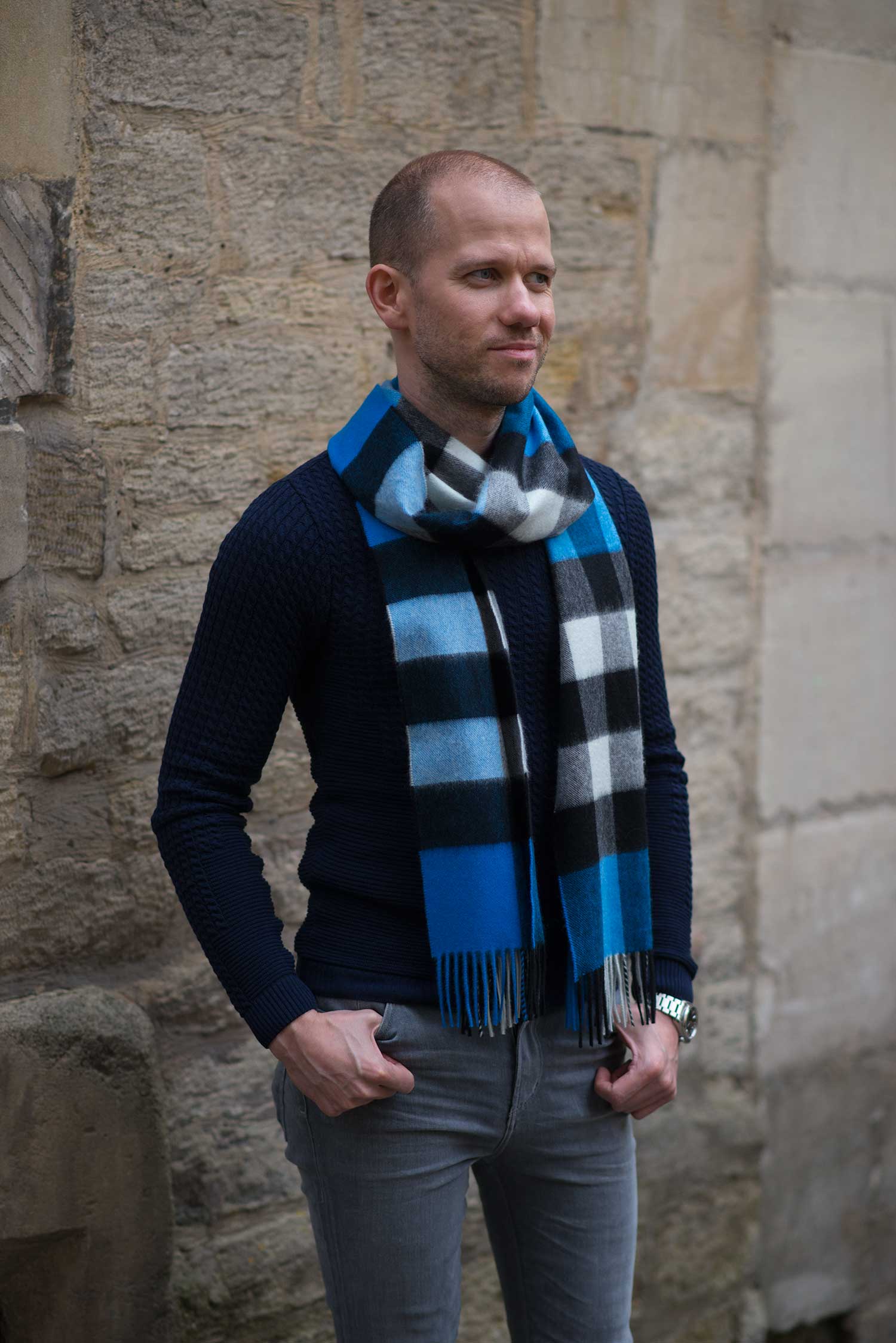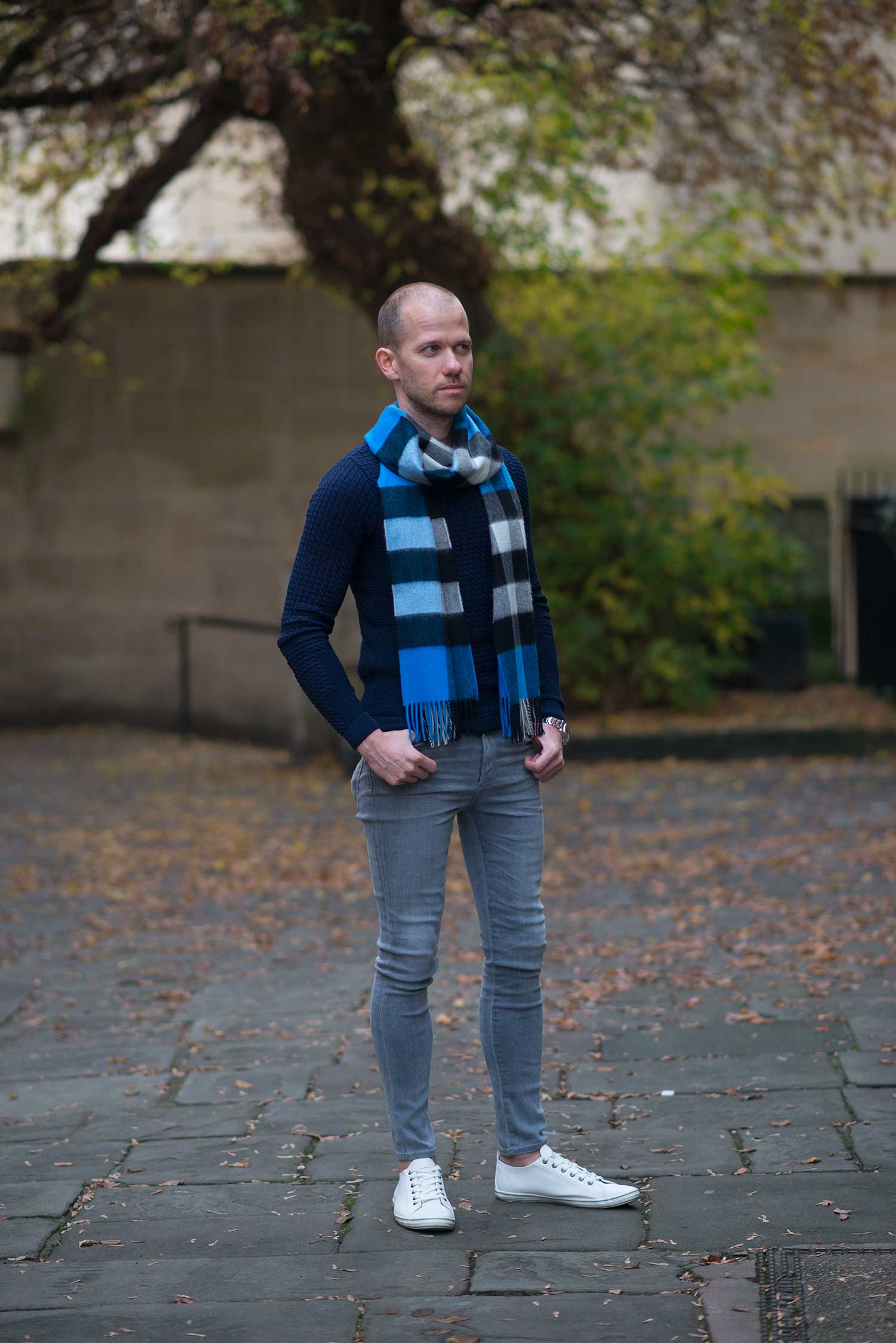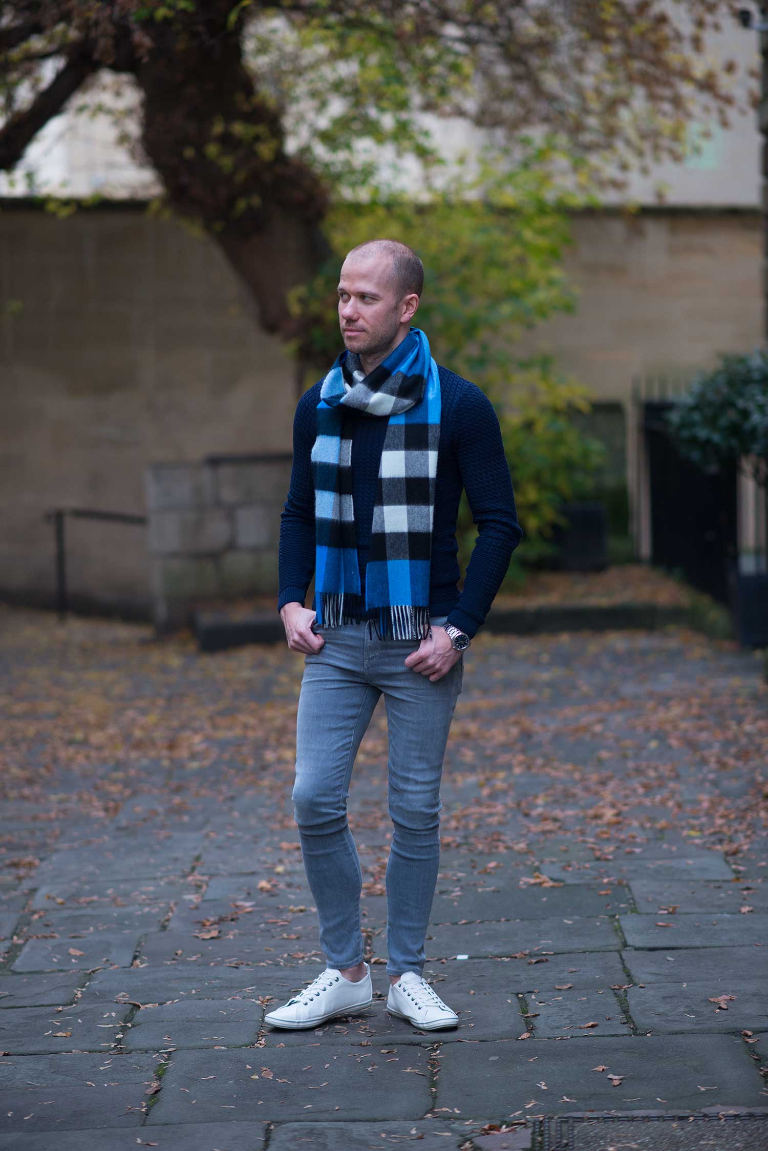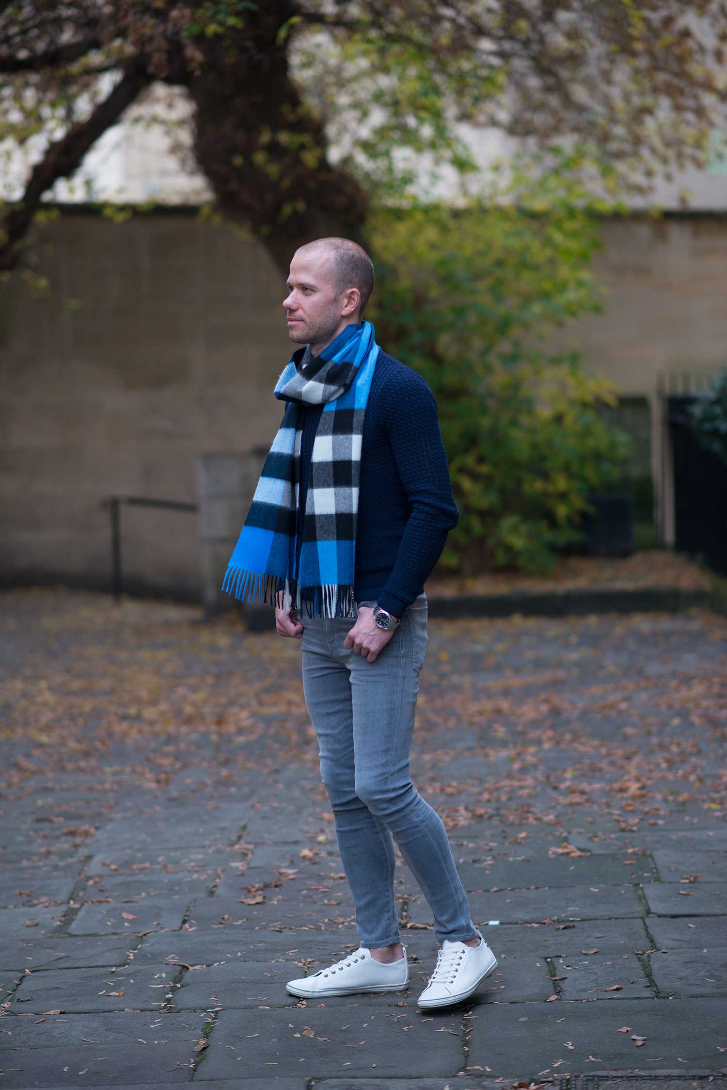 I actually had the scarf in my possession for a short while, but was waiting for suitable clothing to accompany it – my normal autumn and winter wear is the typical browns, orange and burgundy shades, totally incompatible with this vibrant blue! I found the perfect slim fit sweater in a stunning navy colour from ASOS. I finished off the look with my current go to footwear, my Topman White Fashion Trainers. Please let me know what you think of my latest outfit?