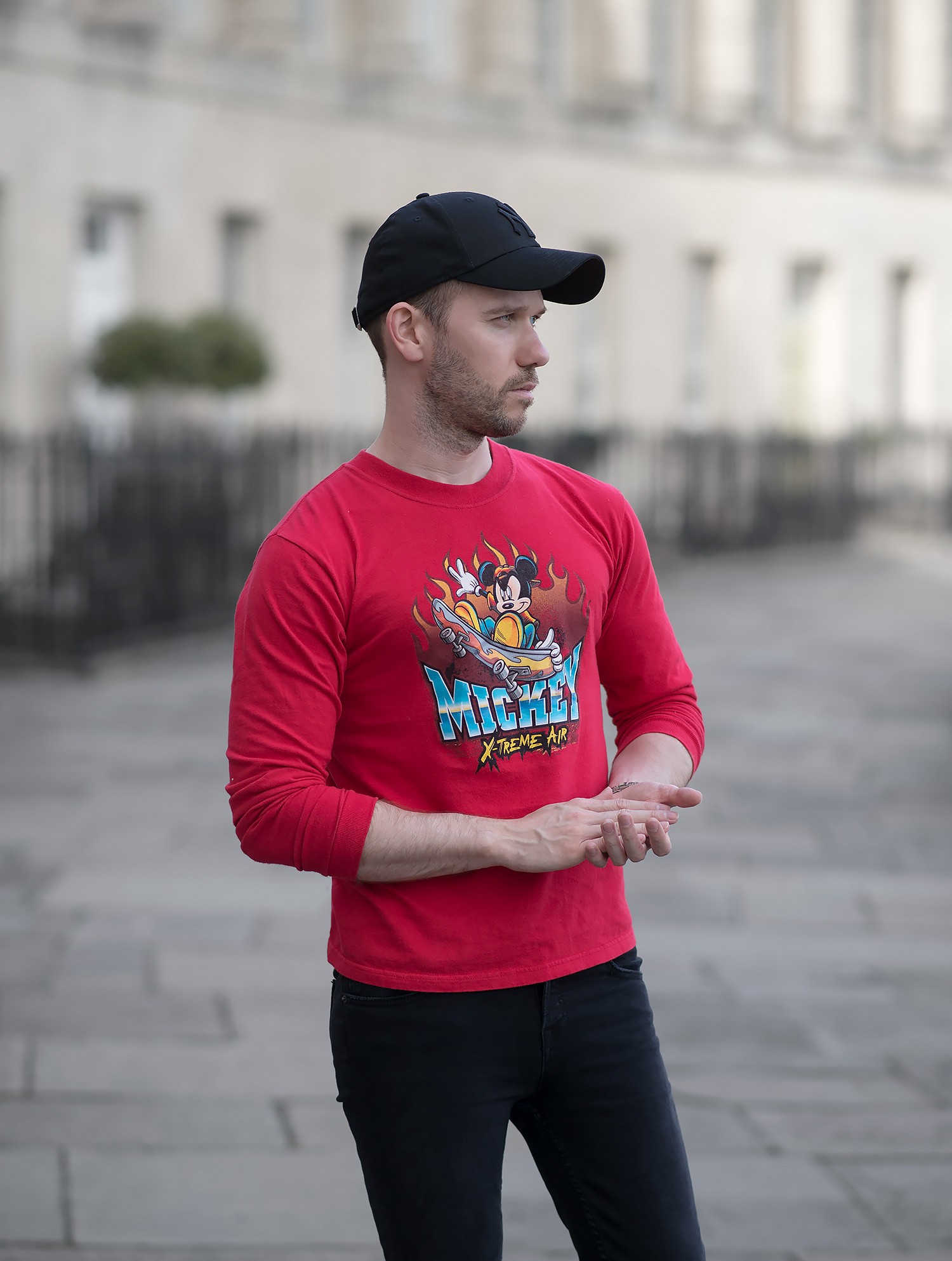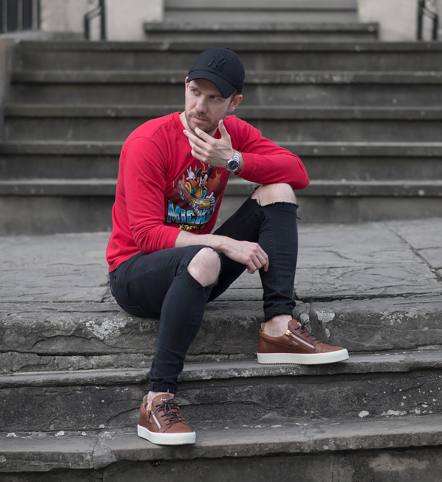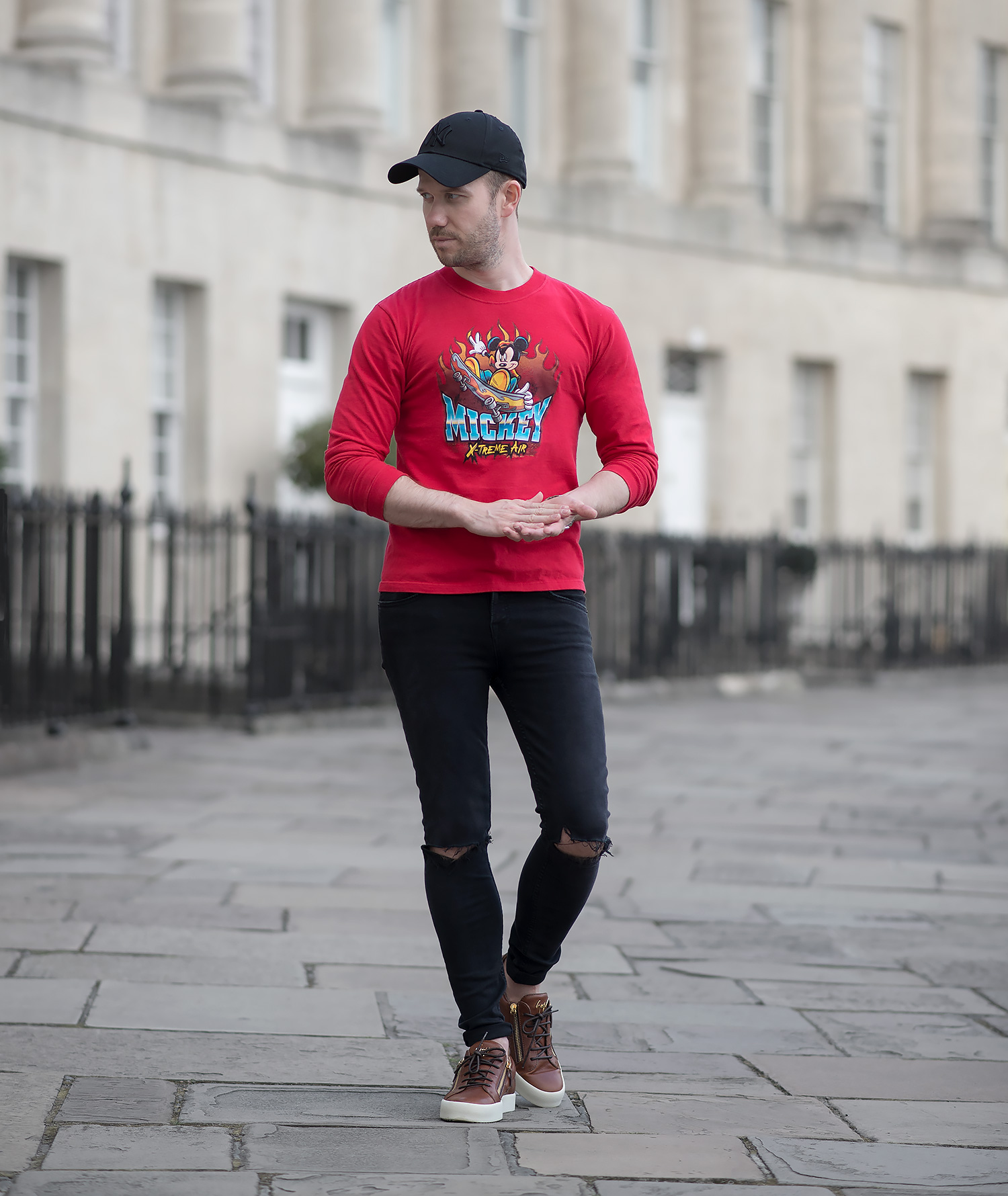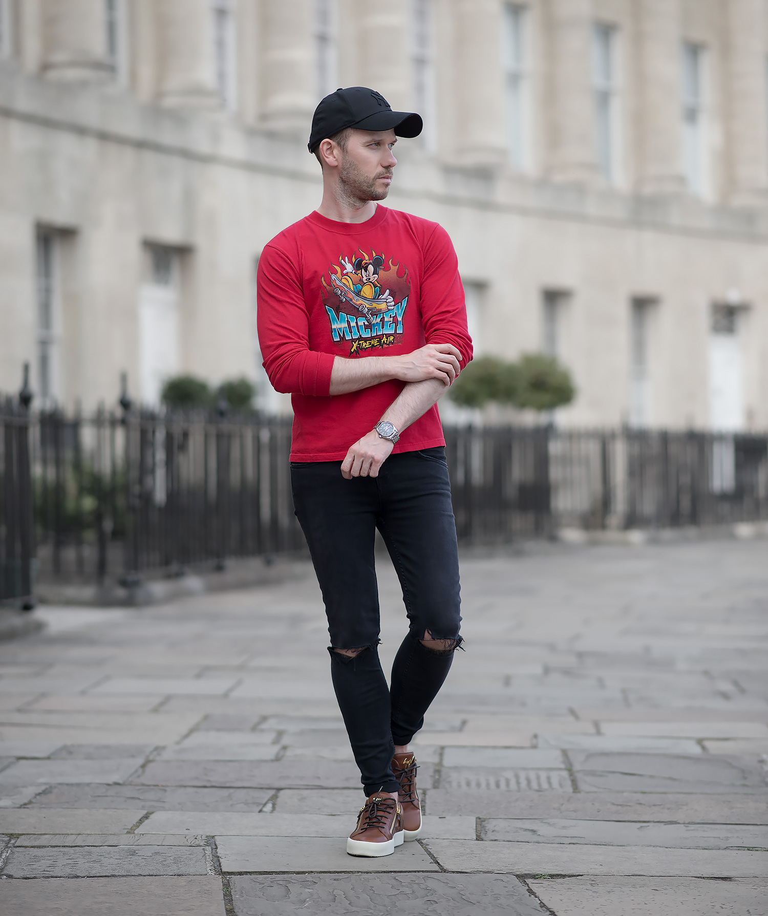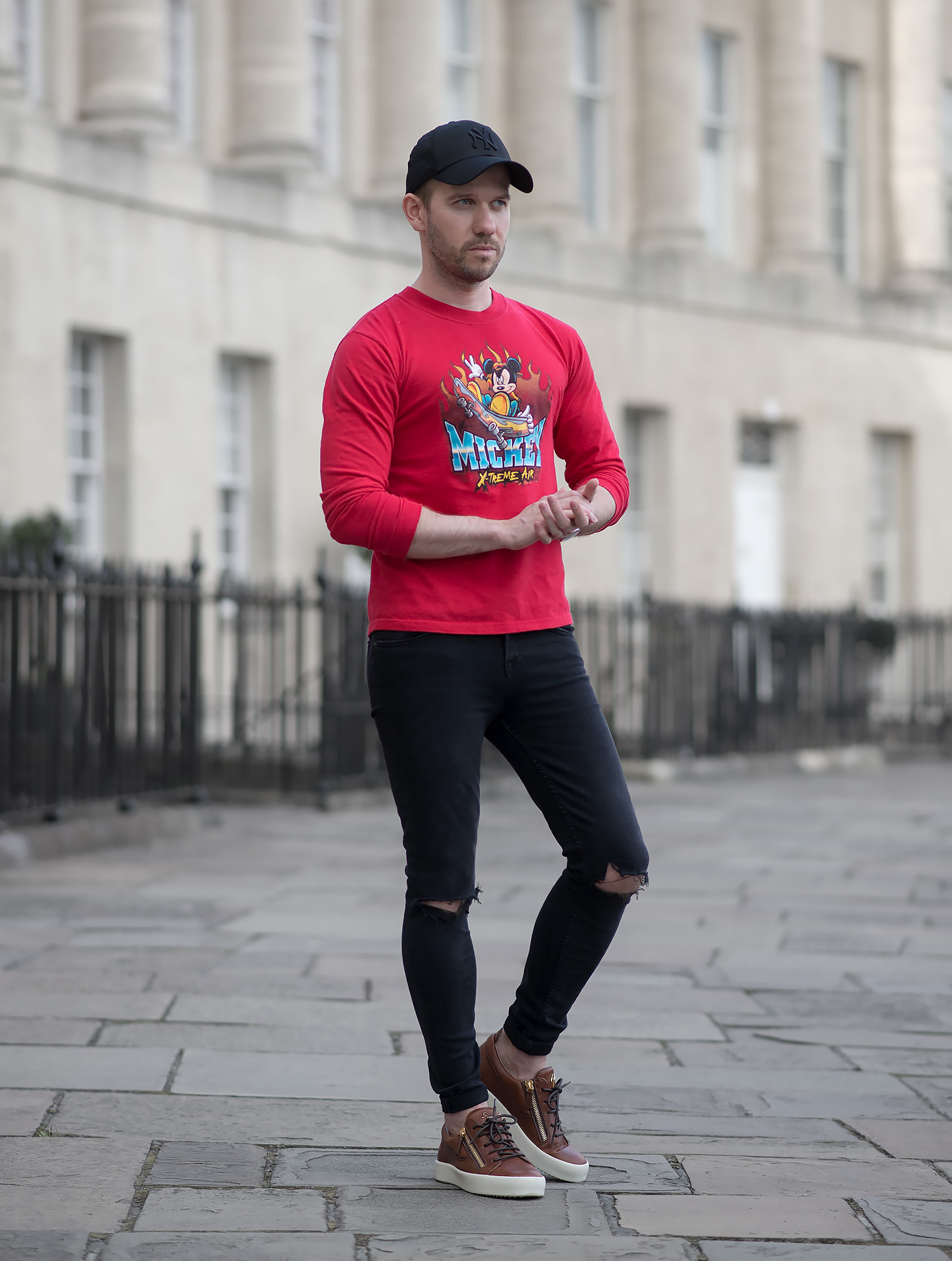For my premiere outing wearing the Mickey Mouse sweatshirt, I chose to pair the vibrancy of the red with my beloved GRLFRND Candice Mid Rise Super Stretch Black Skinny Jeans to give a striking contrasting effect. My choice of footwear was my Giuseppe Zanotti Frankie Low Top Sneakers (reviewed here) and I completed the look with my trusty black New Era baseball cap.
