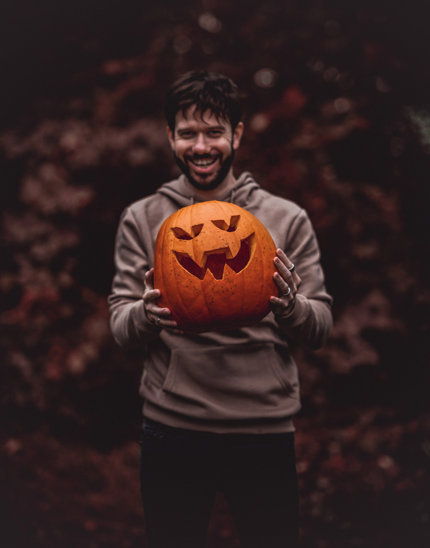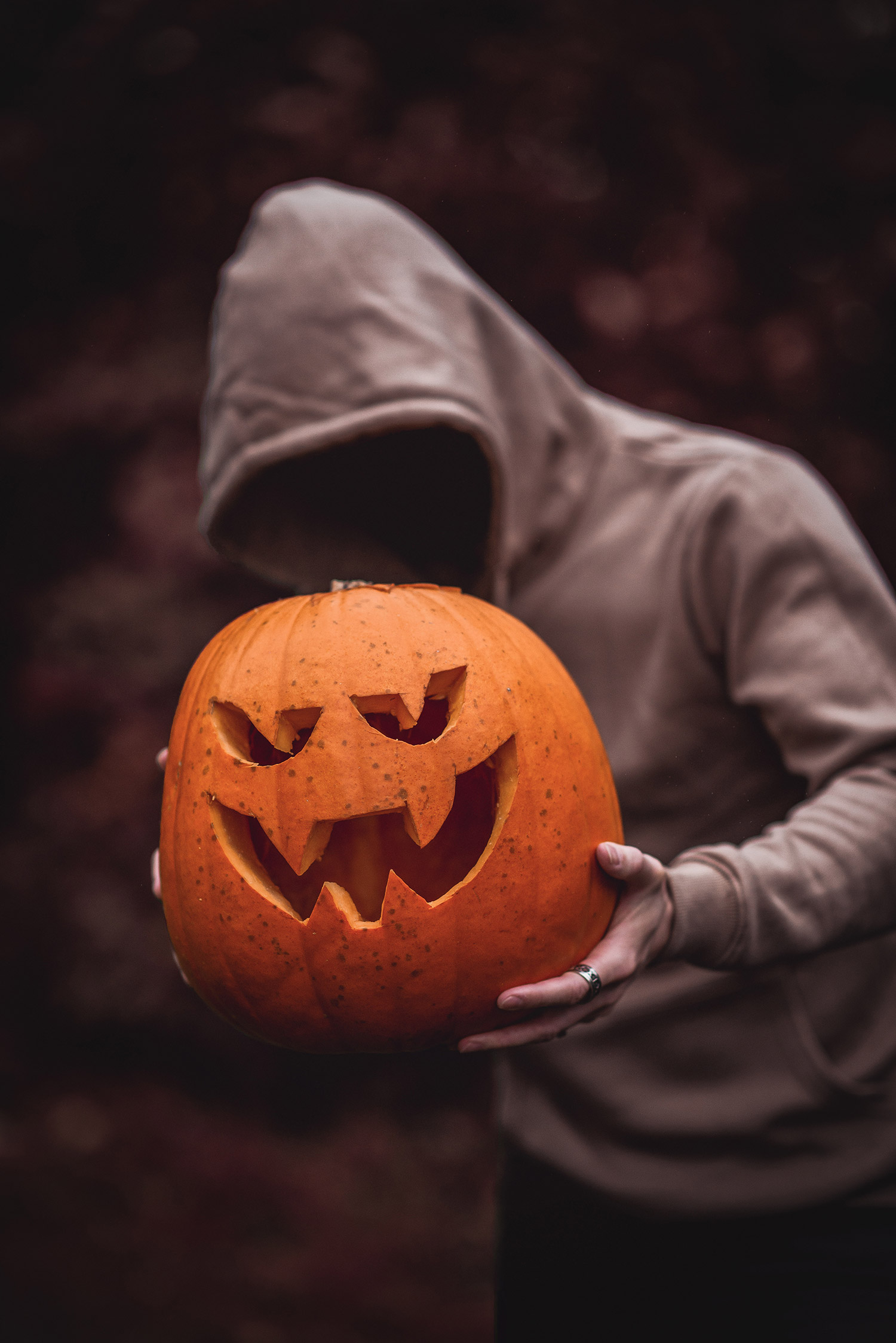 For the outfit, as the pumpkin was the main centrepiece, the rest of the outfit was something quite simple and basic. I grabbed a beige hoodie from BooHoo, added a pair of washed black jeans from Seven For All Mankind, few pieces of hand jewellery (rings from ASOS), and my ensemble was complete! As the weather was particularly bad – dark and raining, it only helped with the creepy vibe I was aiming to achieve. In post-production, I additionally removed any trace of my face to give it an extra level of horror!