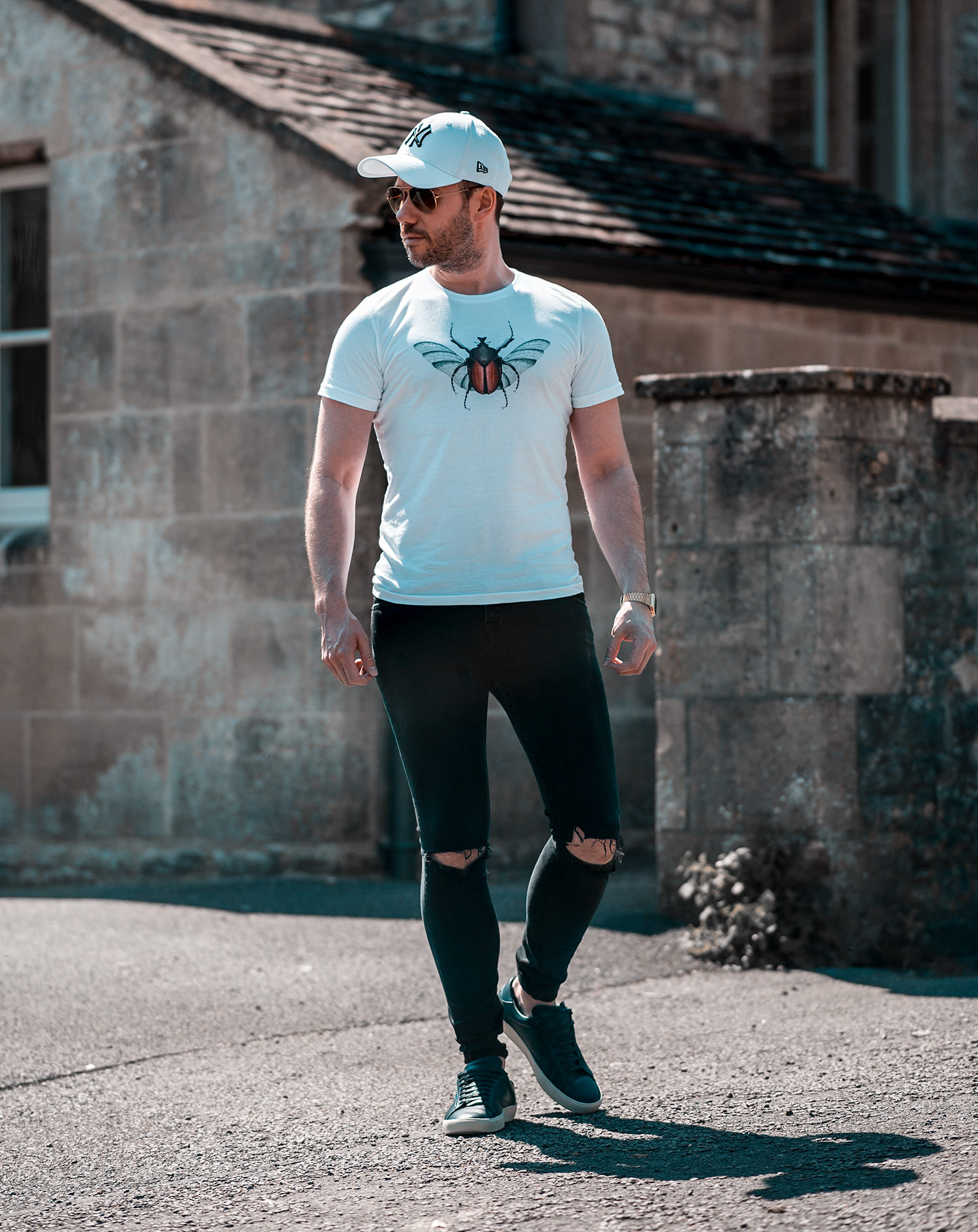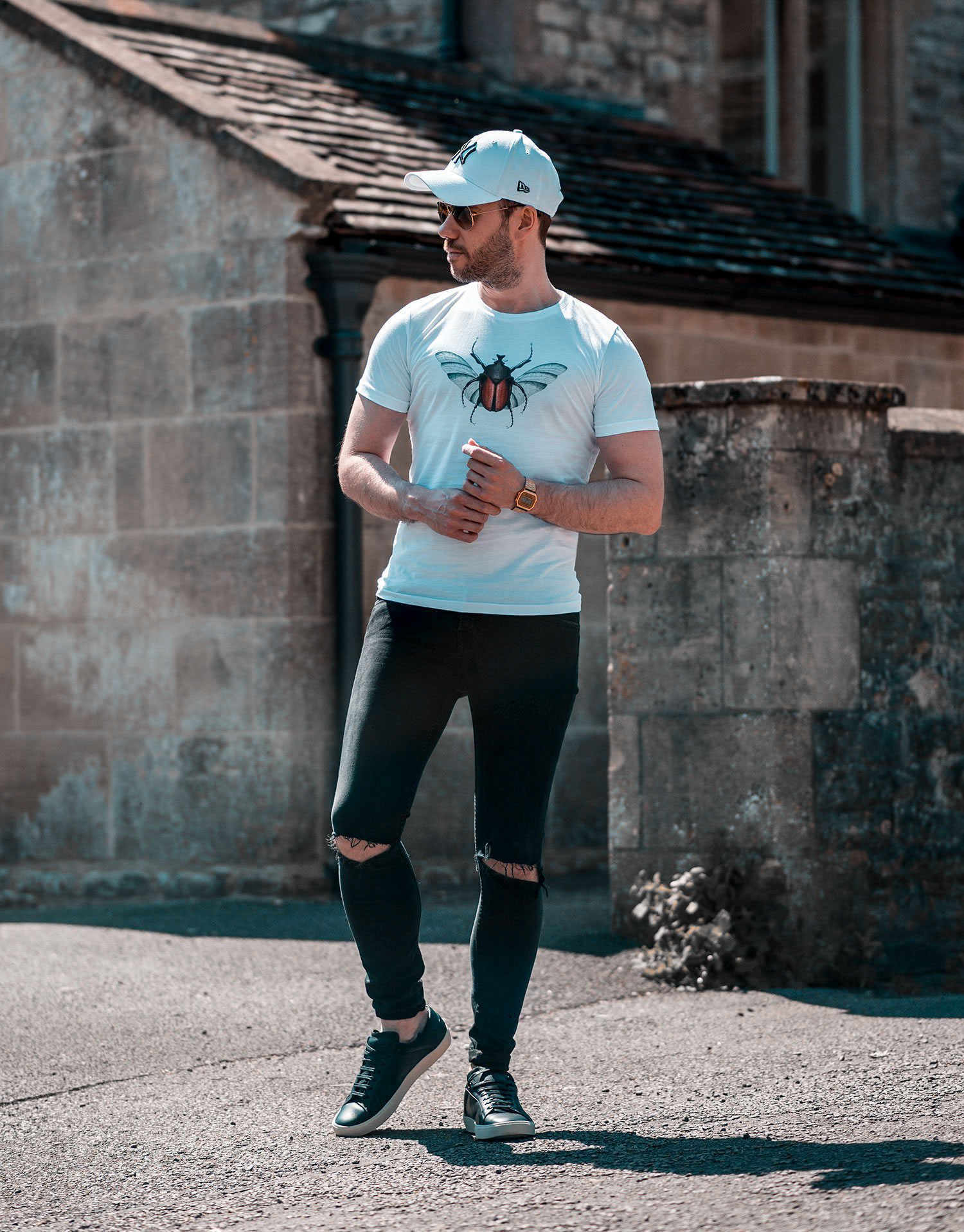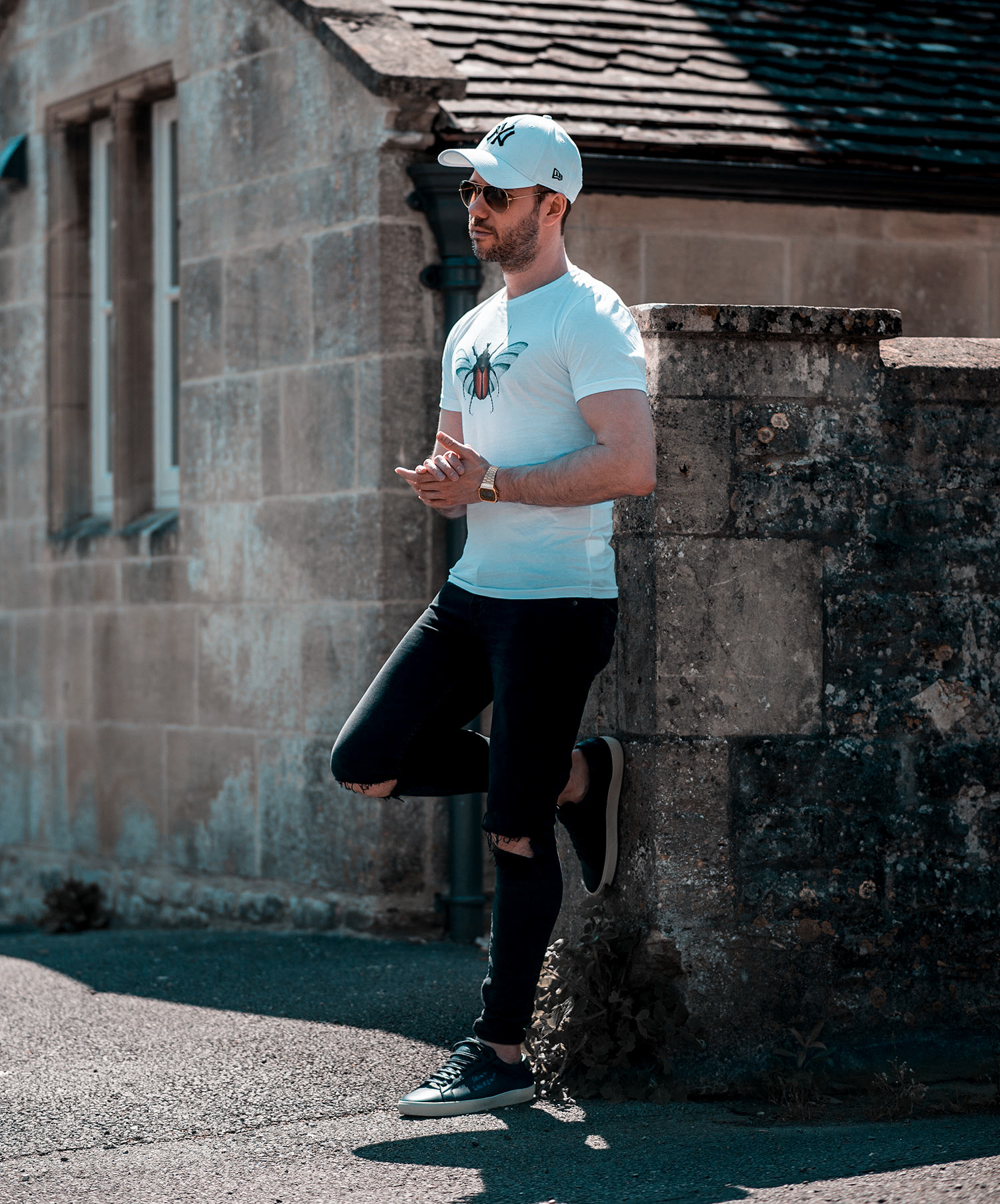 With the warmer weather in full swing, it gives me plenty of opportunities to wear sunglasses! One of my favourite accessories, with so much choice! Before we left for the shoot, I made sure to pack a pair of Ray Ban Aviators to add something extra to the images (along with defending my eyes from the suns rays!). I chose to wear my GRLFRND Candice Skinny Jeans, contrast against the beaming white effect of the T-Shirt. When it came to footwear, it was another outing for the Saint Laurent Court Classics in black (which I premiered in a previous outfit post). I’m really pleased to have these in my shoe collection, that blue text really pops! Finally, I completed the ensemble with a New Era White Baseball Cap (helping to reflect the suns heat!).